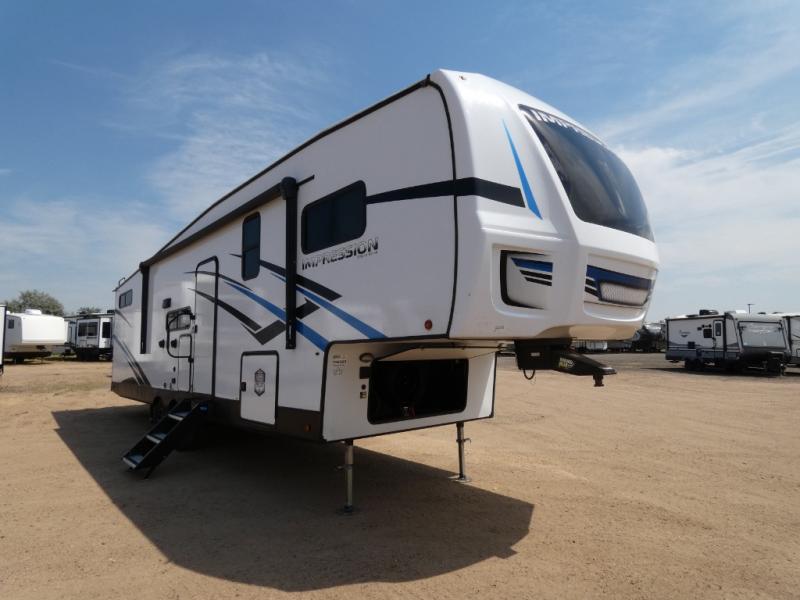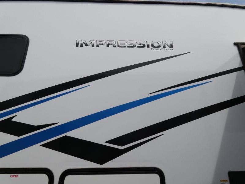 With any Impression mid-profile fifth wheel by Forest River, the focus of the design is comfort and value, built with quality craftsmanship and attention to customer's desires in each Impression! The exterior includes upgraded E-rated Goodyear Endurance tires made in the U.S.A., custom exterior graphics package, and One Touch automatic leveling system for easy setup. There is also an enclosed docking station and a gel coat fiberglass front cap with an automotive windshield with LED lights for style and beautiful views. The fully heated and enclosed AccessiBelly has removable underbelly panels and offers four seasons of travel. The interior has oversized opening windows in the living area for more natural lighting and good air flow, a stainless steel single bowl sink with high rise faucet with a pulldown sprayer to easily clean the dishes, and a porcelain foot flush toilet to mention a few comforts and conveniences.