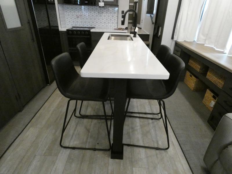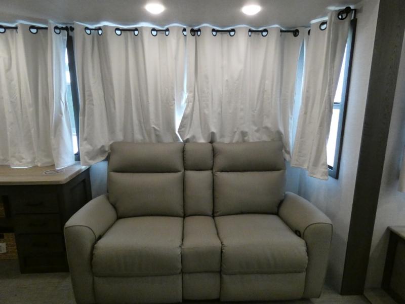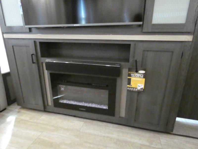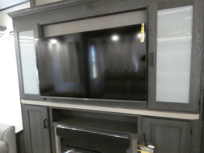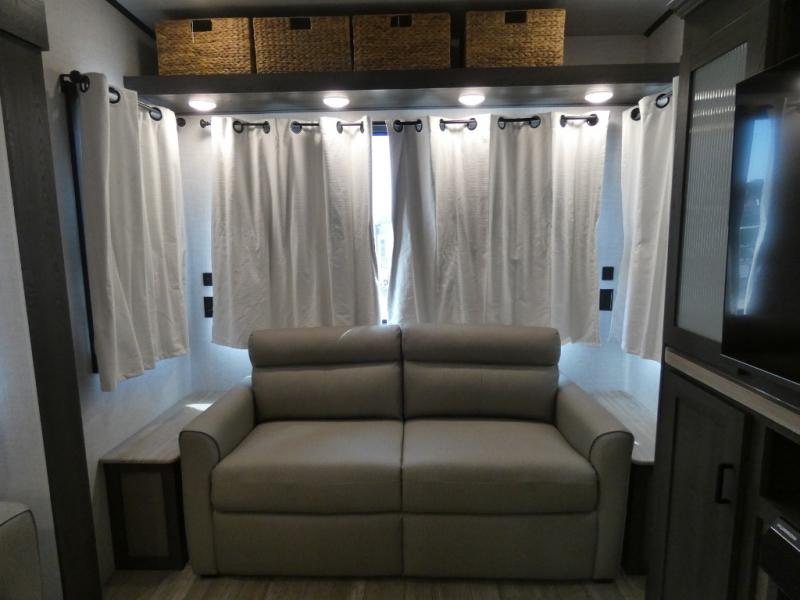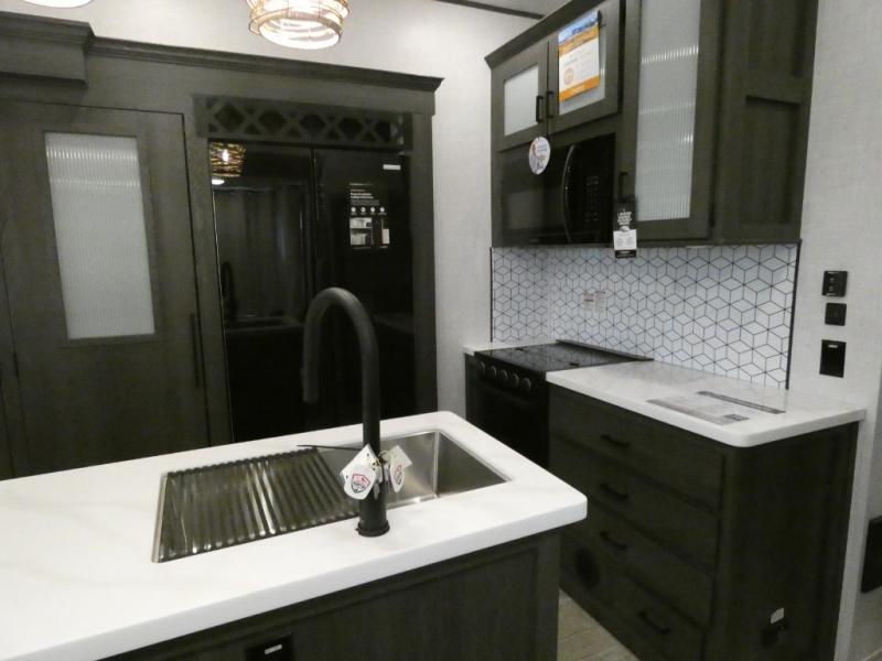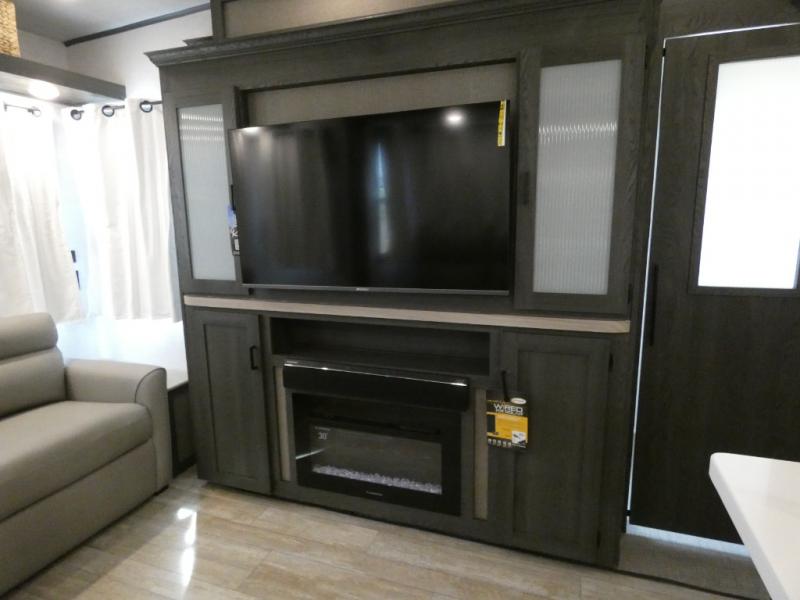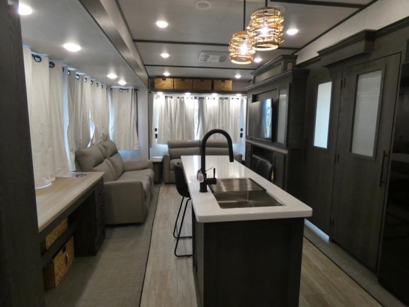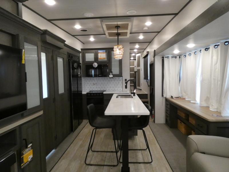 Step inside this luxurious fifth wheel that has been awarded the RV Business 2024 Top RV Debut! The rear tri-fold hide-a-bed sofa and theater seating provide a relaxing evening by the entertainment center with a 55" TV. Next to the entertainment center is a hidden door with cabinets and 16 cu. ft. 12V refrigerator, and above it is a 36" x 74" flip-down bunk and pad below it all housed within a slide. The kitchen has plenty of countertop space to prepare your best home cooked meals and an island with four bar stools to enjoy your meals. You also have a desk with storage to get some work done if needed. As you walk up the floating steps, you will notice the full bathroom to your left with a walk-in shower with a skylight for added natural lighting and a dual sink vanity for two to get ready at once. The front private bedroom has a king bed with Versa Tilt technology slide, a dresser next to a bench and a front wardrobe that is prepped for a washer and dryer!