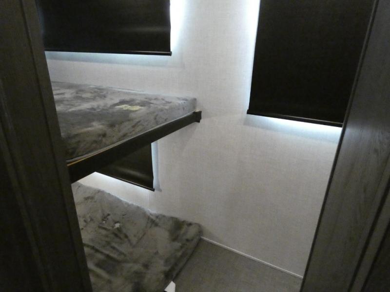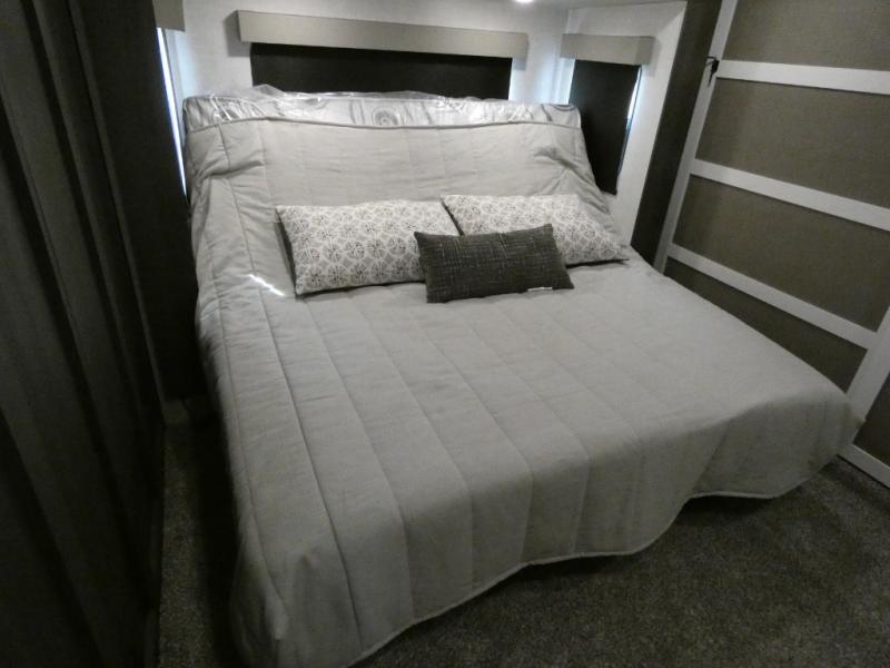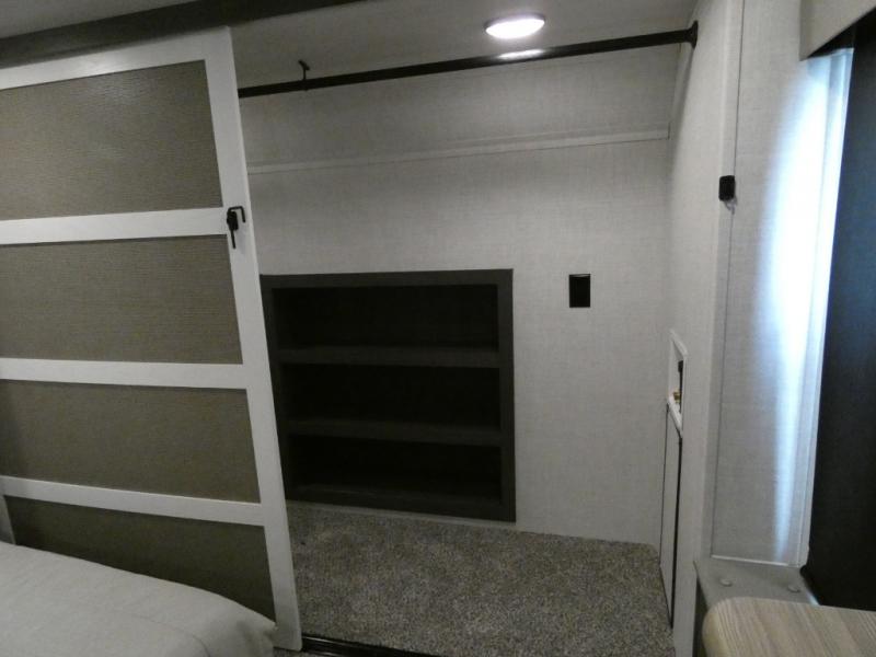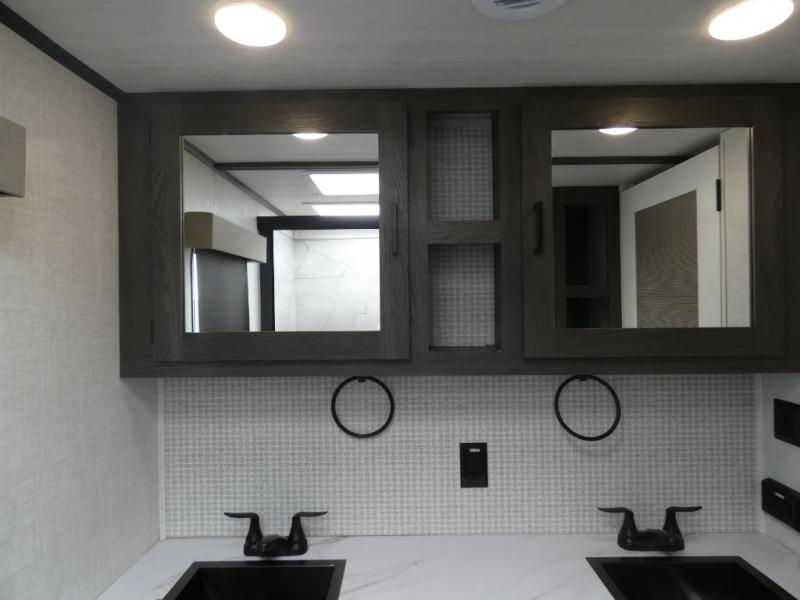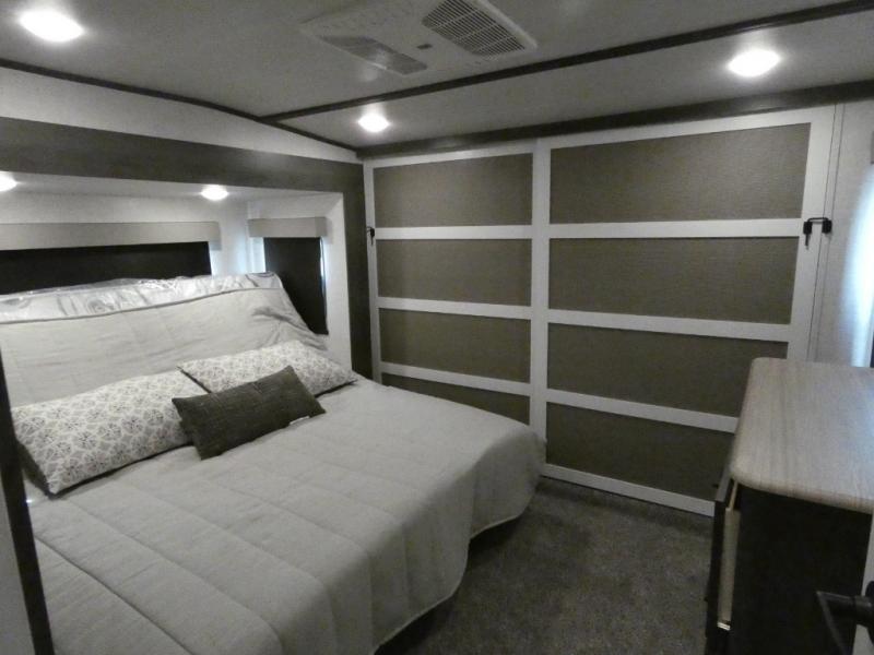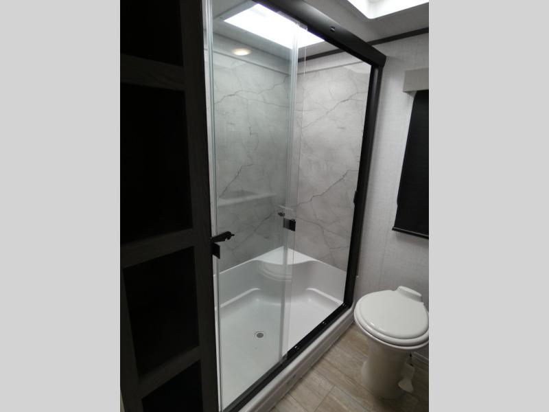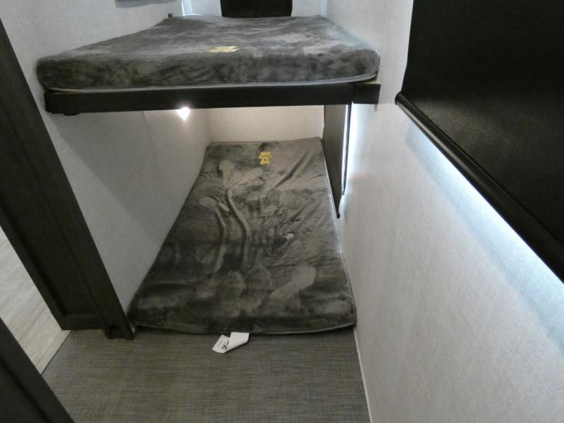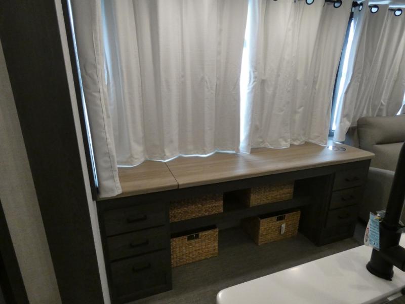 Step inside this luxurious fifth wheel that has been awarded the RV Business 2024 Top RV Debut! The rear tri-fold hide-a-bed sofa and theater seating provide a relaxing evening by the entertainment center with a 55" TV. Next to the entertainment center is a hidden door with cabinets and 16 cu. ft. 12V refrigerator, and above it is a 36" x 74" flip-down bunk and pad below it all housed within a slide. The kitchen has plenty of countertop space to prepare your best home cooked meals and an island with four bar stools to enjoy your meals. You also have a desk with storage to get some work done if needed. As you walk up the floating steps, you will notice the full bathroom to your left with a walk-in shower with a skylight for added natural lighting and a dual sink vanity for two to get ready at once. The front private bedroom has a king bed with Versa Tilt technology slide, a dresser next to a bench and a front wardrobe that is prepped for a washer and dryer!