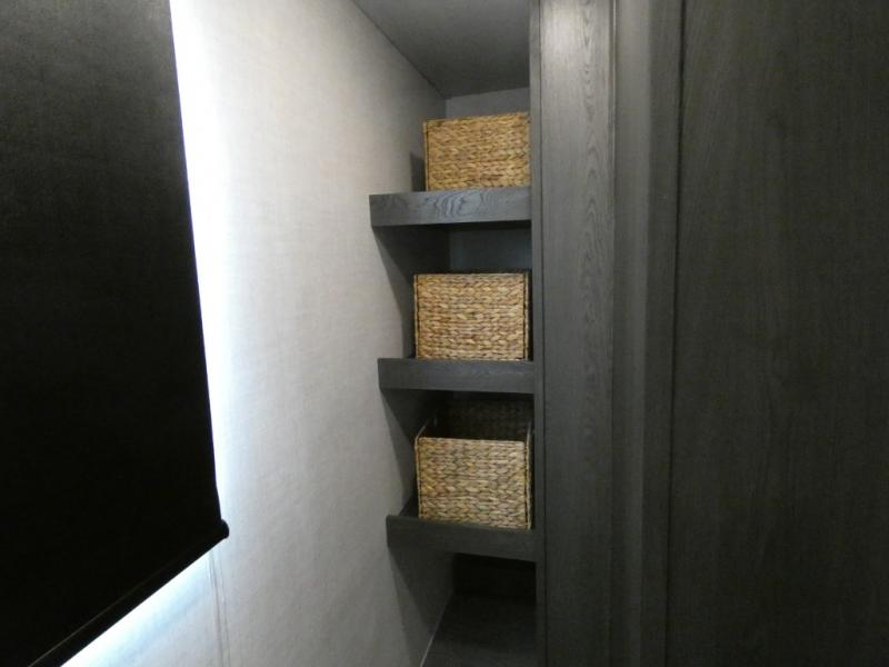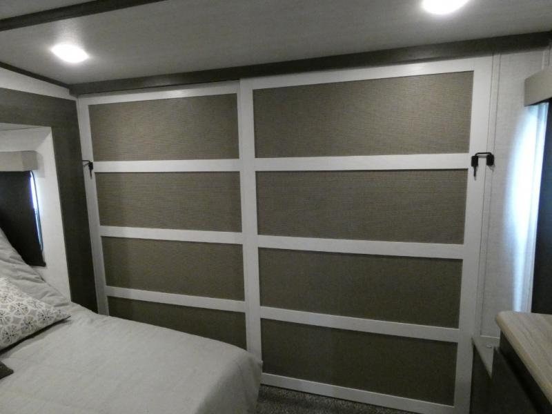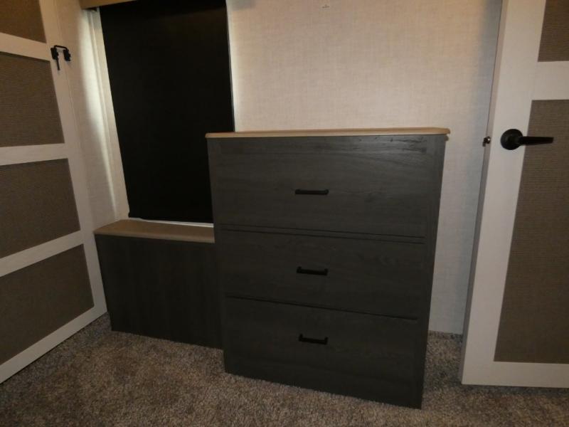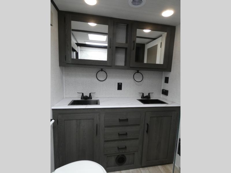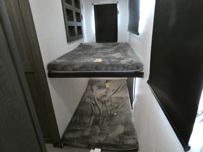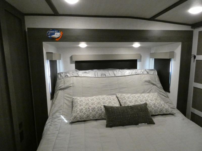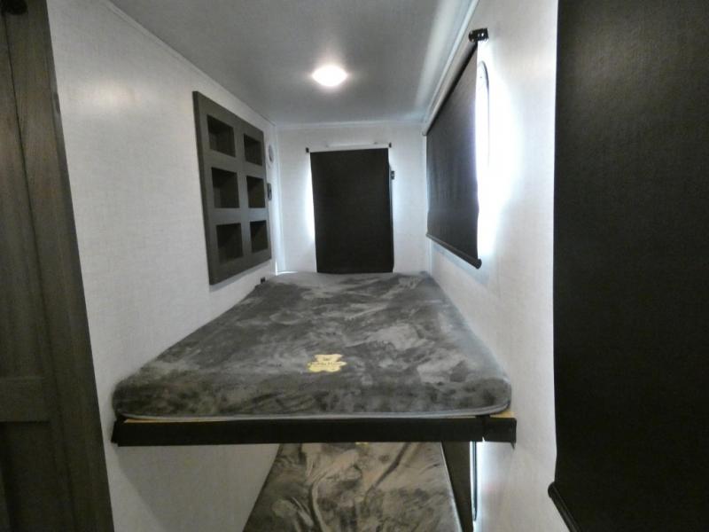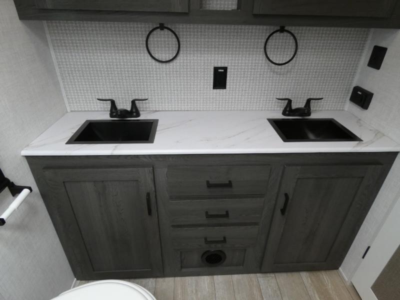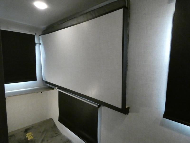 Step inside this luxurious fifth wheel that has been awarded the RV Business 2024 Top RV Debut! The rear tri-fold hide-a-bed sofa and theater seating provide a relaxing evening by the entertainment center with a 55" TV. Next to the entertainment center is a hidden door with cabinets and 16 cu. ft. 12V refrigerator, and above it is a 36" x 74" flip-down bunk and pad below it all housed within a slide. The kitchen has plenty of countertop space to prepare your best home cooked meals and an island with four bar stools to enjoy your meals. You also have a desk with storage to get some work done if needed. As you walk up the floating steps, you will notice the full bathroom to your left with a walk-in shower with a skylight for added natural lighting and a dual sink vanity for two to get ready at once. The front private bedroom has a king bed with Versa Tilt technology slide, a dresser next to a bench and a front wardrobe that is prepped for a washer and dryer!