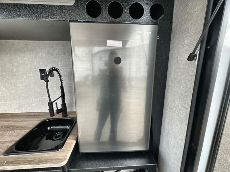 This simple travel trailer weights under 2,500 lb. for the easiest towing experience! After you've traveled all day, you can take a rest on the queen-sized bed/sofa combo inside and enjoy the fireplace. There are dual wardrobes plus additional interior storage for your belongings. You can make lunch on the two burner cooktop, clean up using the sink, and store perishables in the convenient refrigerator!