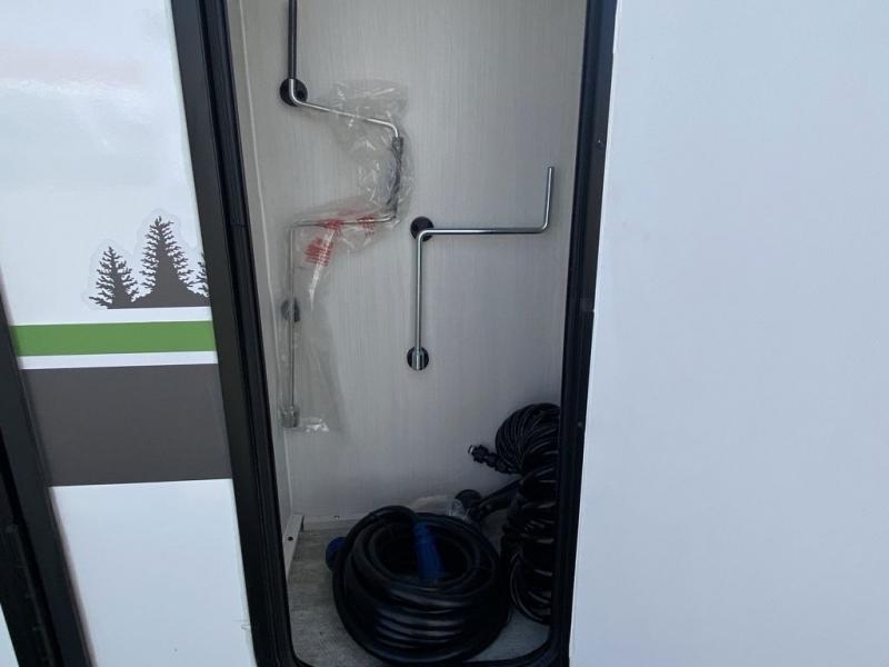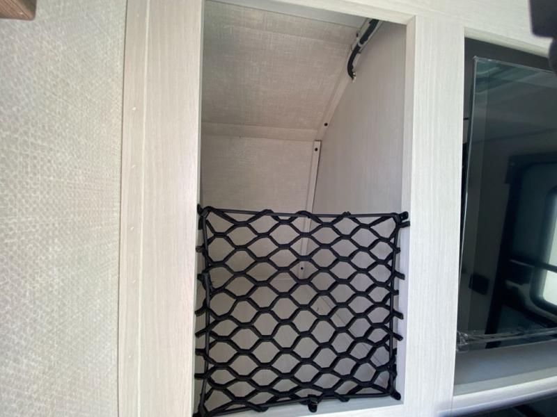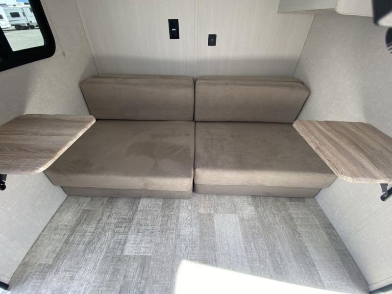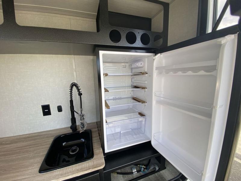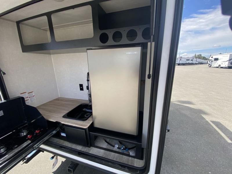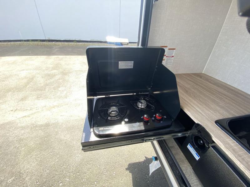 This simple travel trailer weights under 2,500 lb. for the easiest towing experience! After you've traveled all day, you can take a rest on the queen-sized bed/sofa combo inside and enjoy the fireplace. There are dual wardrobes plus additional interior storage for your belongings. You can make lunch on the two burner cooktop, clean up using the sink, and store perishables in the convenient refrigerator!