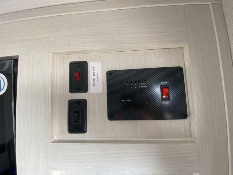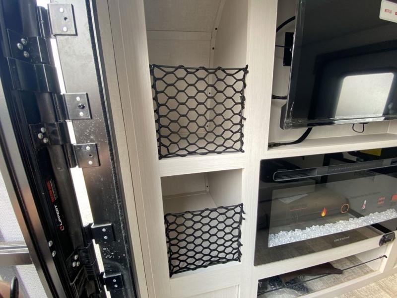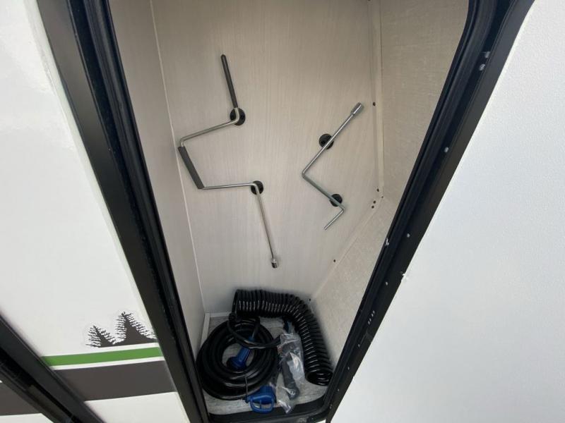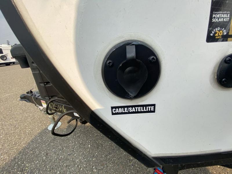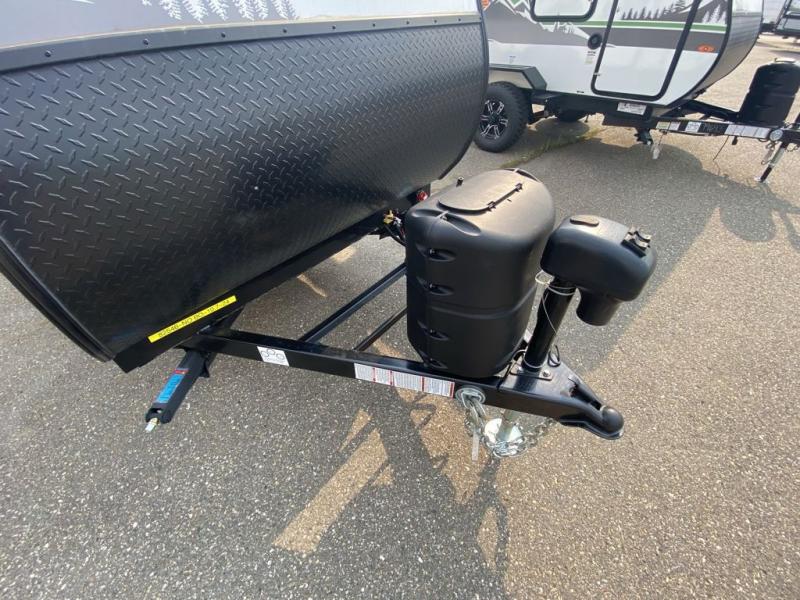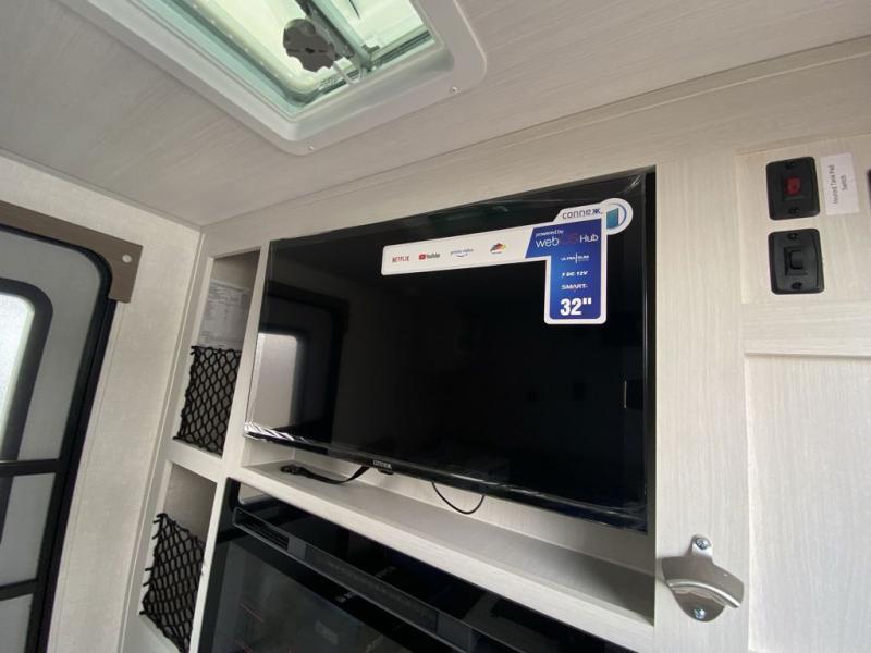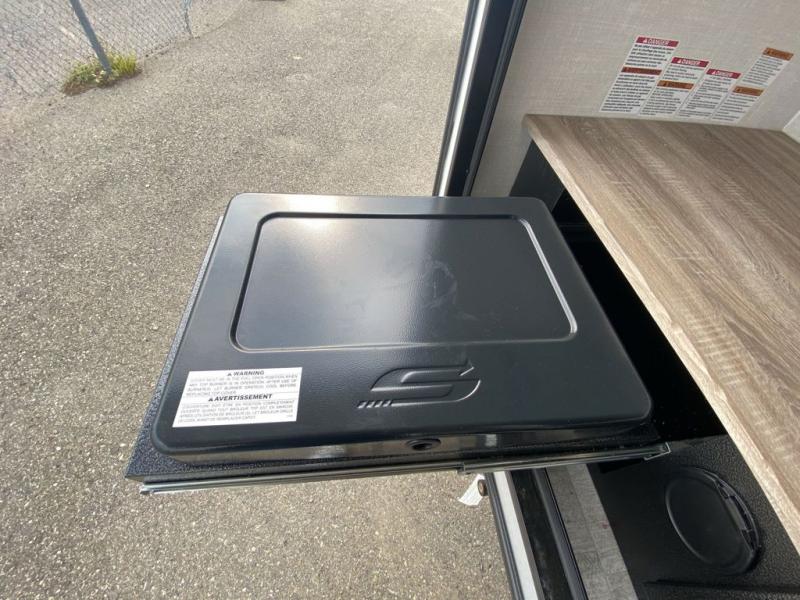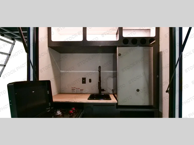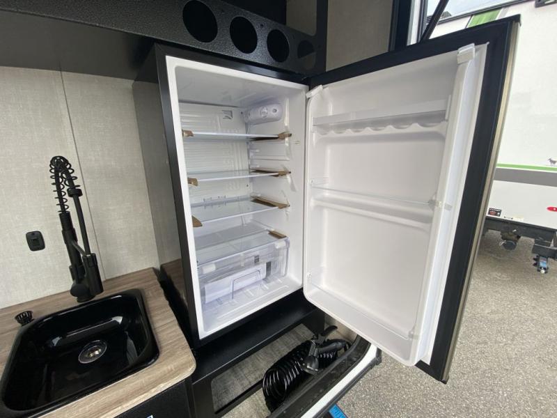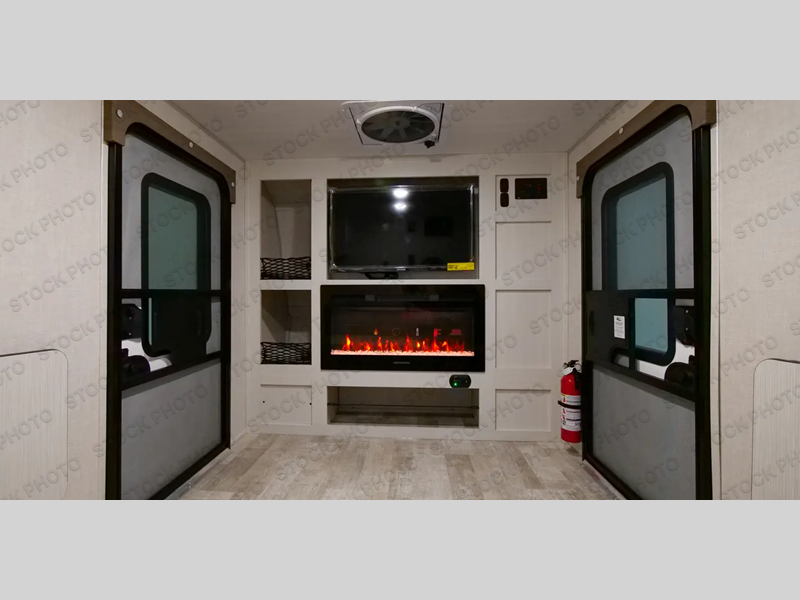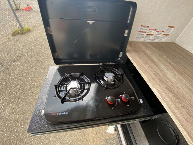 This simple travel trailer weights under 2,500 lb. for the easiest towing experience! After you've traveled all day, you can take a rest on the queen-sized bed/sofa combo inside and enjoy the fireplace. There are dual wardrobes plus additional interior storage for your belongings. You can make lunch on the two burner cooktop, clean up using the sink, and store perishables in the convenient refrigerator!