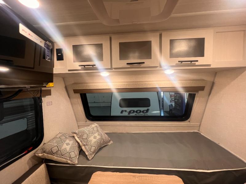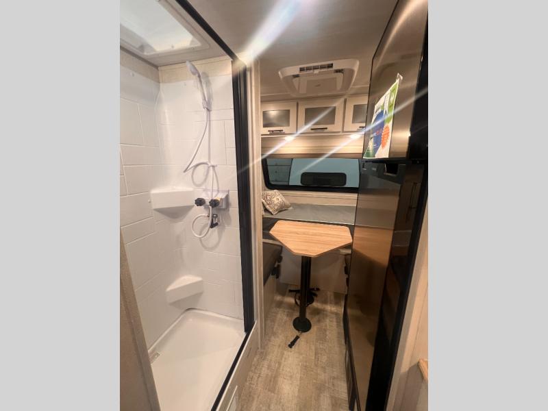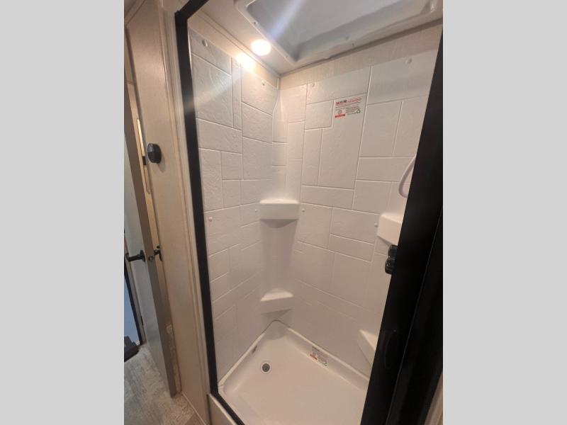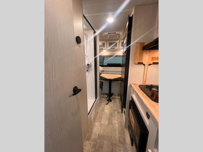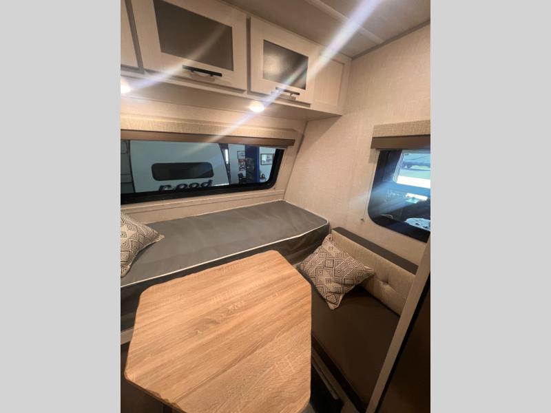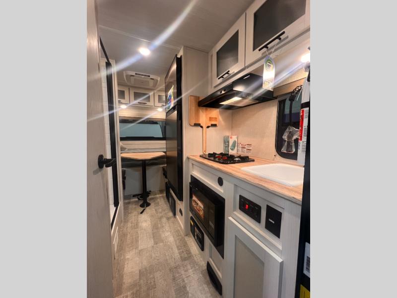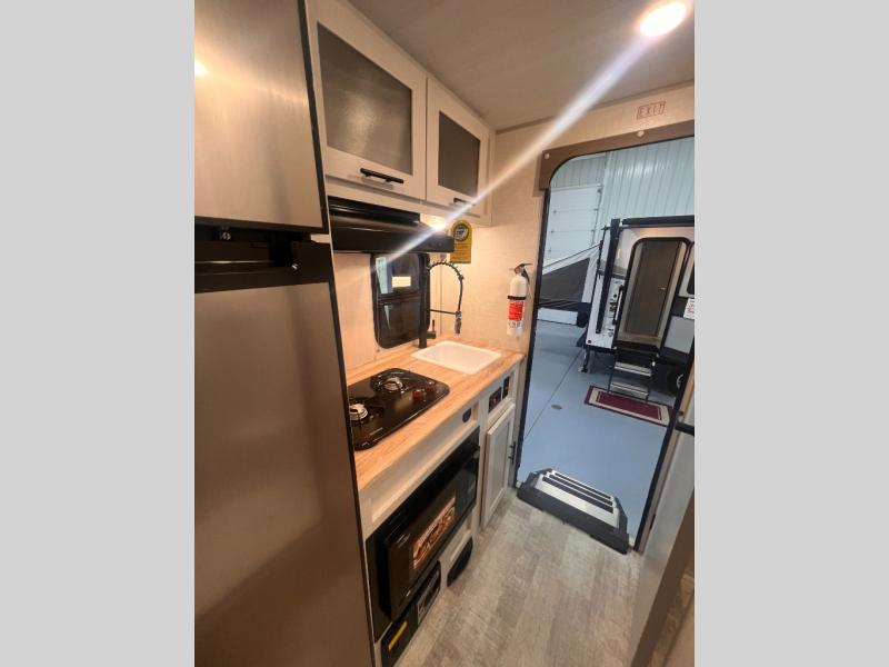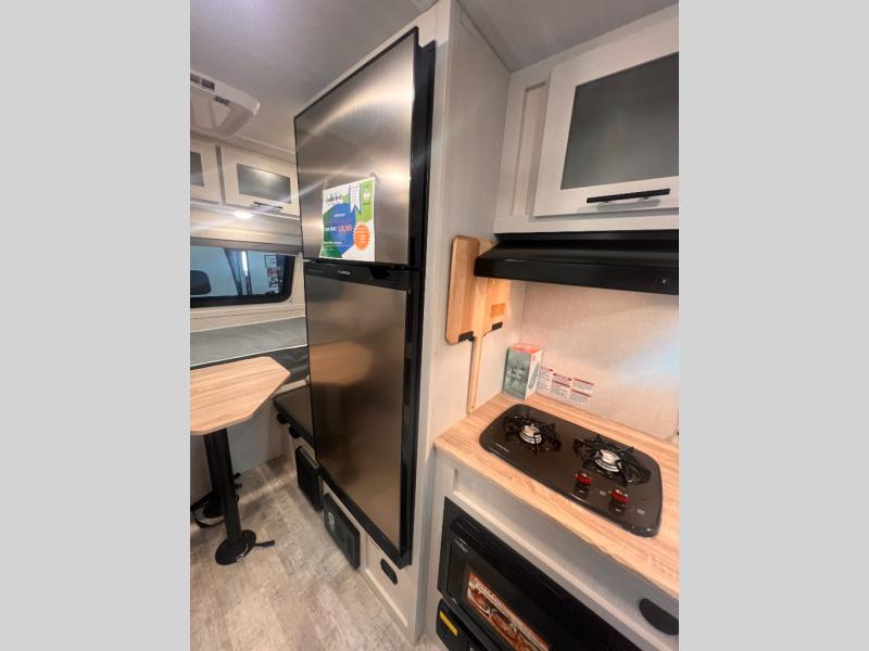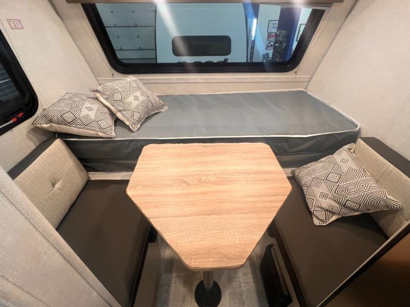 This is the perfect couples unit that features everything that you need to enjoy traveling and exploring yet keeping your tow length and weight down. The unique rear entry makes this unit easy to access, and just inside the rear door there is a private toilet area for quick access when you are outside and you need the bathroom. A front queen bed that is 60" x 74" provides a great night's rest, and can easily convert to a booth dinette when needed for inside seating and meals. The two burner cooktop, sink, and refrigerator allow you to make easy camp meals inside if you'd like.