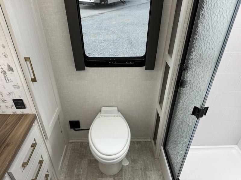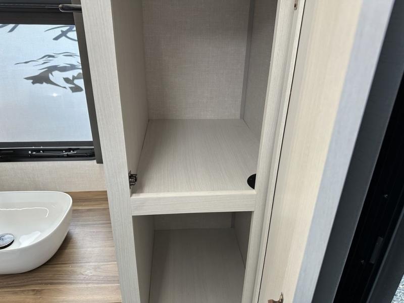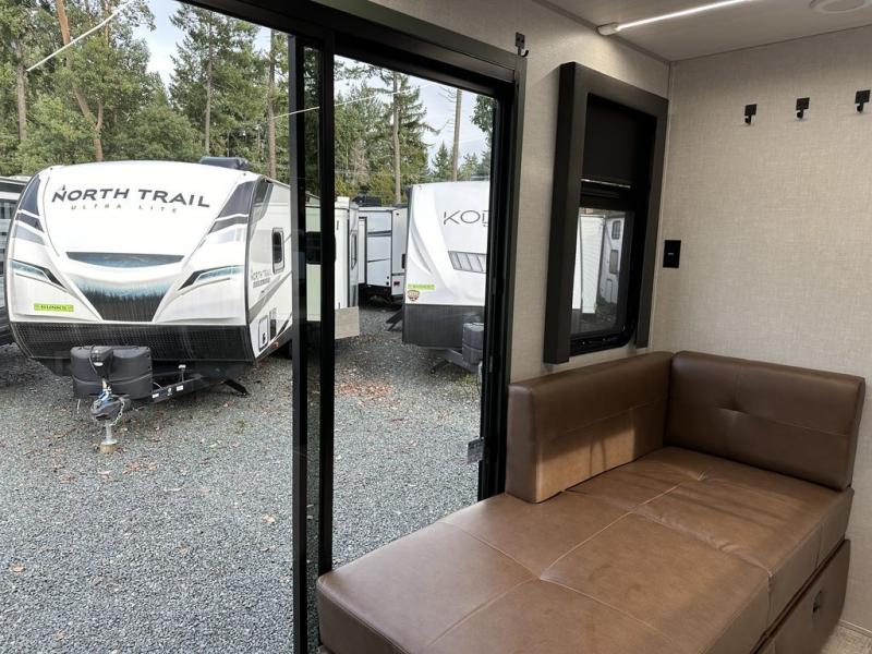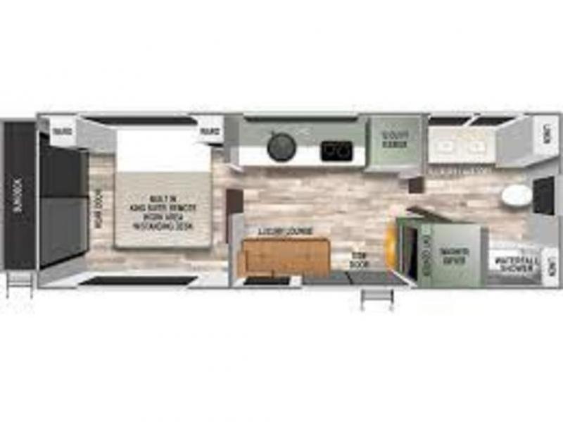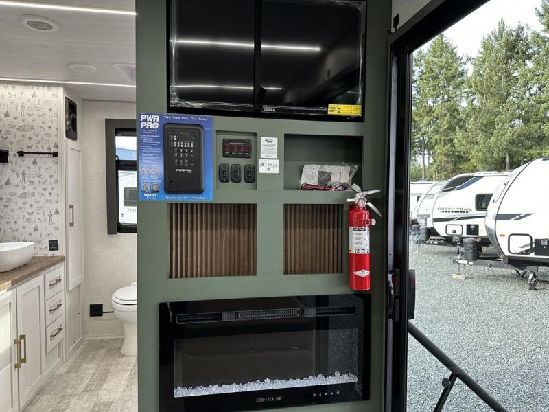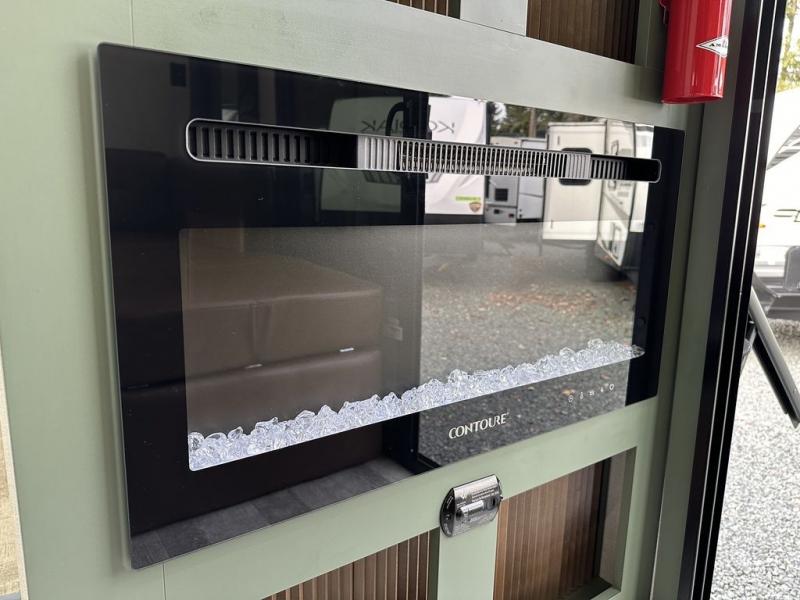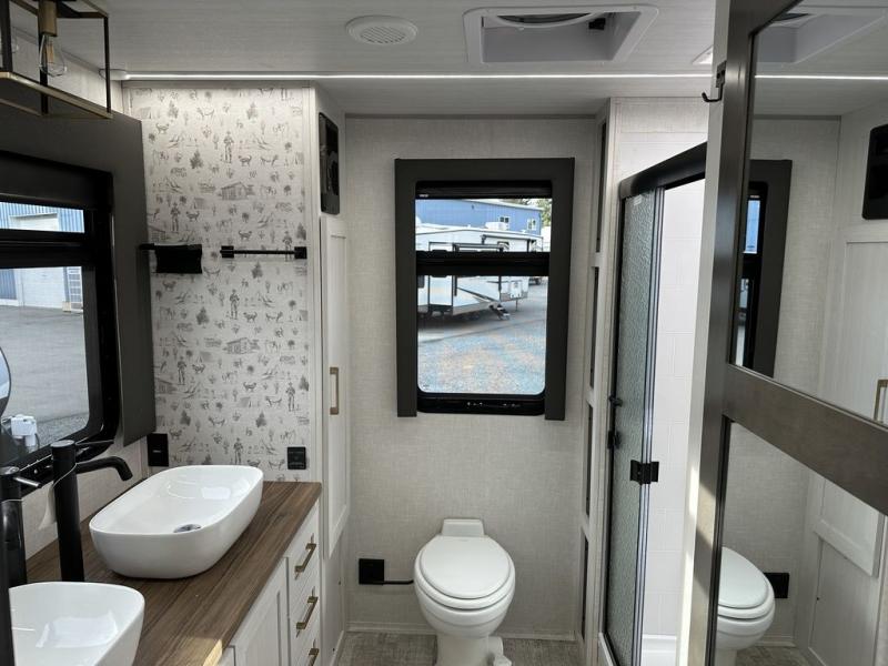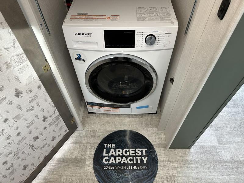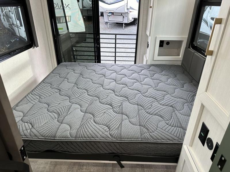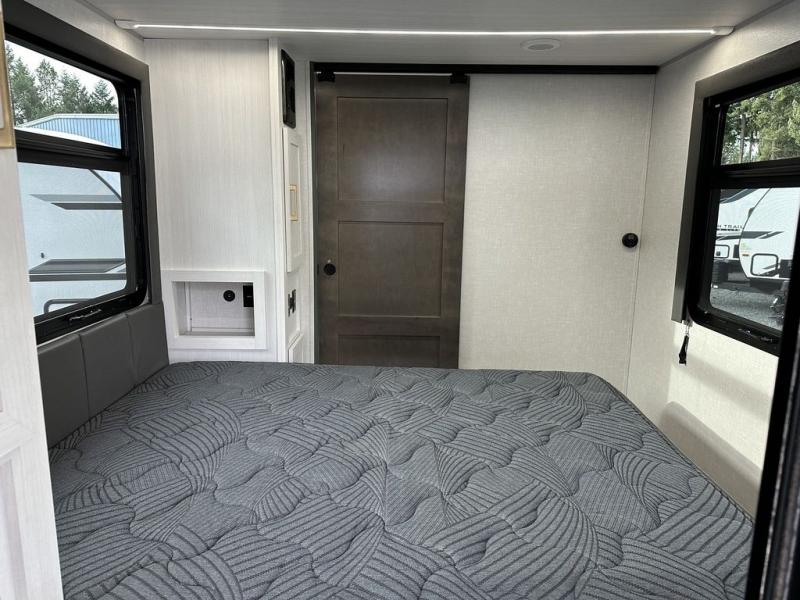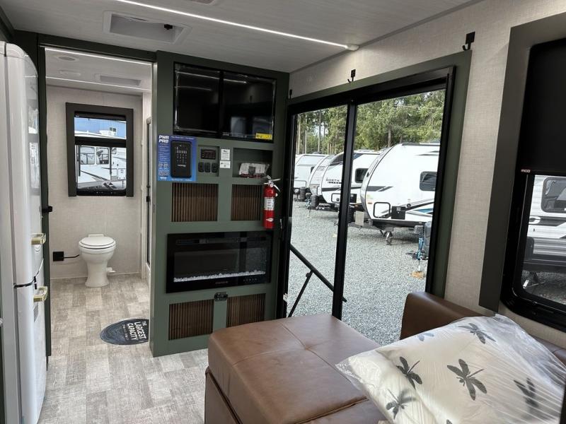 It won't be hard to find comfort in this travel trailer, whether you're camping on the weekends, or going full-time! There is a built-in king suite with a remote work area and standing desk that will allow you to utilize this room as a bedroom or office! There are also dual bedroom wardrobes for your things and rear doors that lead to a cozy sun deck! The middle living room/kitchen includes a luxury lounge, a fireplace, a two burner cooktop, and a 12 cu. ft. icebox refrigerator. You will love the front bath with dual bath sinks, two linen closets, plus a waterfall shower for added luxury. And the optional washer/dryer combo is an added benefit you might want to take advantage of!