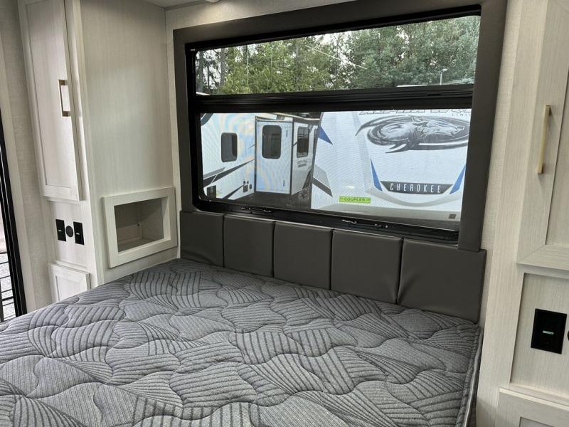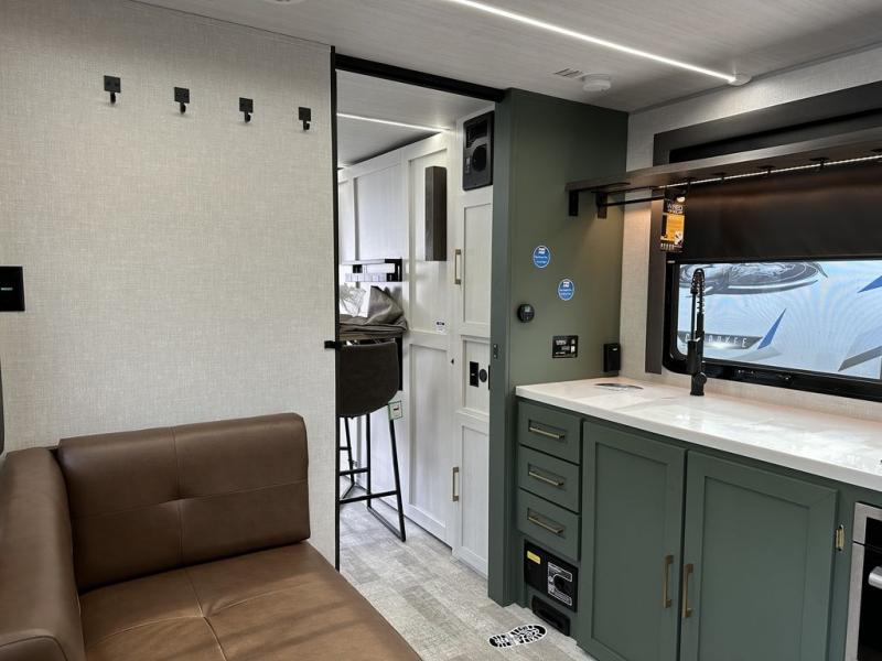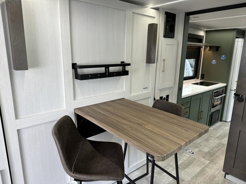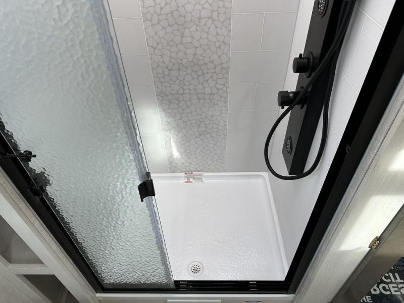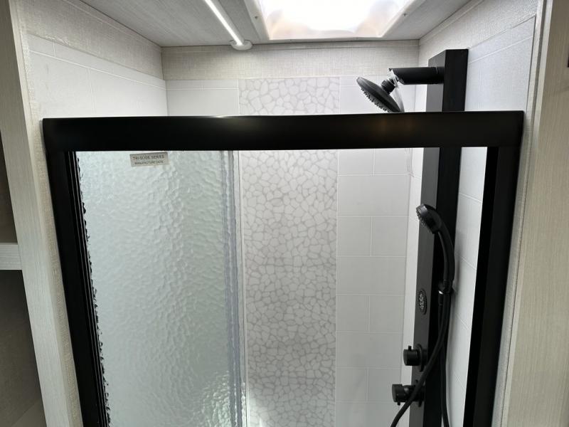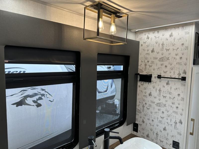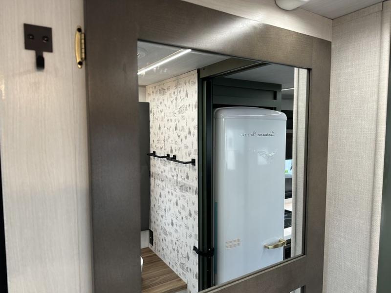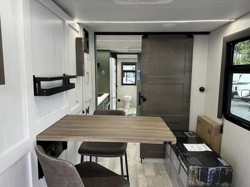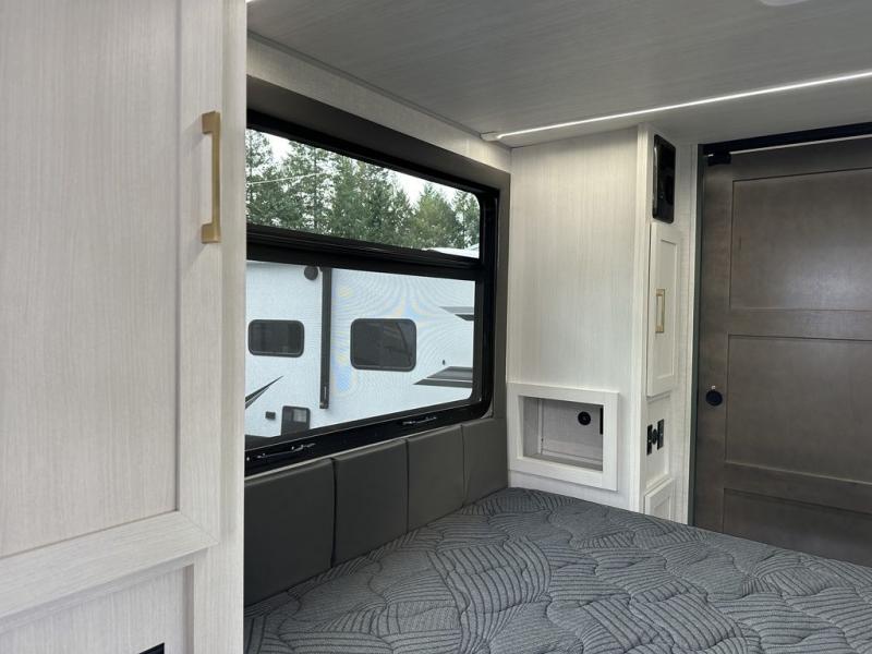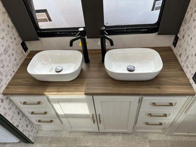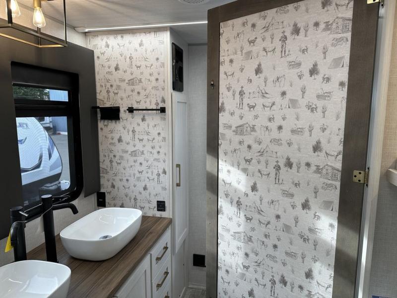 It won't be hard to find comfort in this travel trailer, whether you're camping on the weekends, or going full-time! There is a built-in king suite with a remote work area and standing desk that will allow you to utilize this room as a bedroom or office! There are also dual bedroom wardrobes for your things and rear doors that lead to a cozy sun deck! The middle living room/kitchen includes a luxury lounge, a fireplace, a two burner cooktop, and a 12 cu. ft. icebox refrigerator. You will love the front bath with dual bath sinks, two linen closets, plus a waterfall shower for added luxury. And the optional washer/dryer combo is an added benefit you might want to take advantage of!