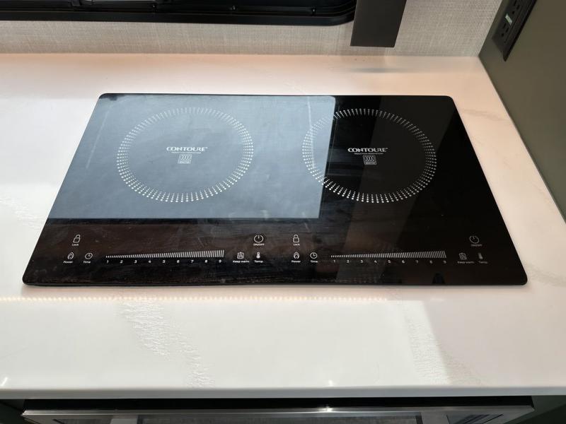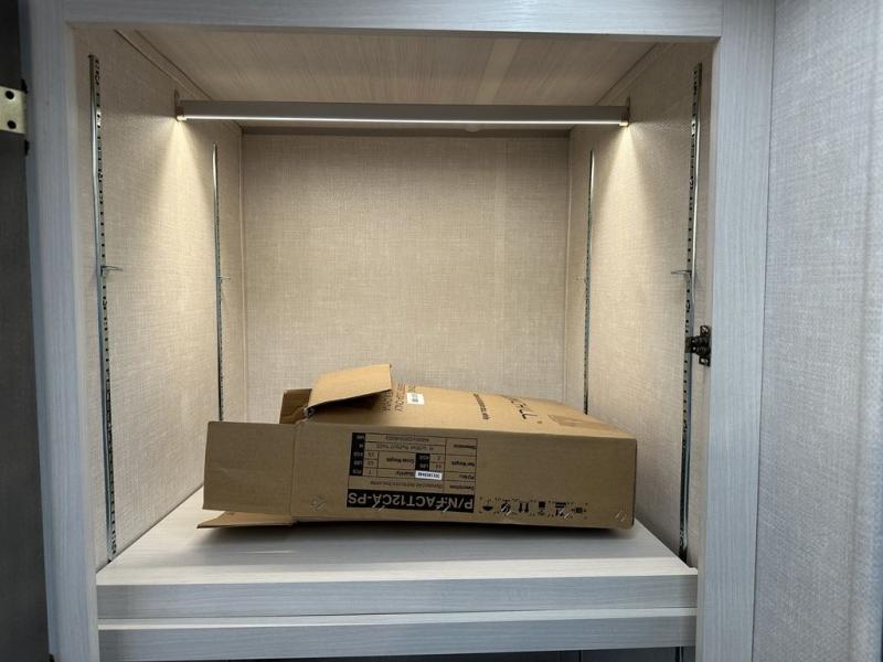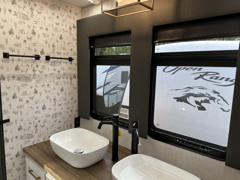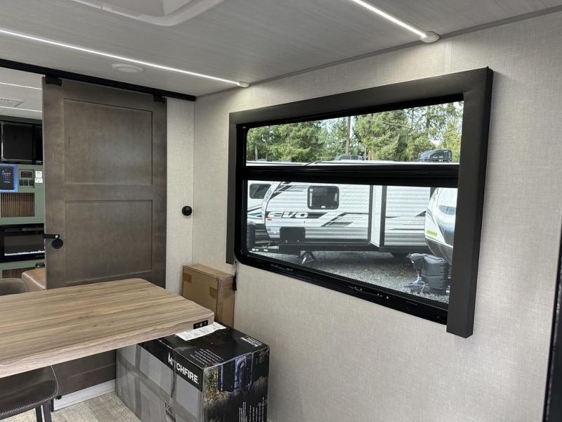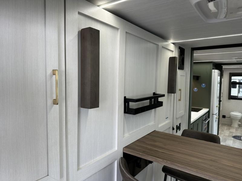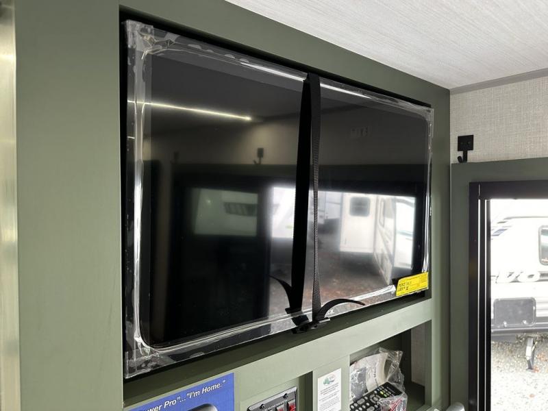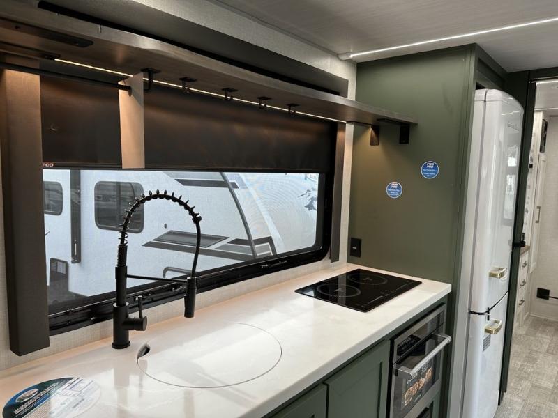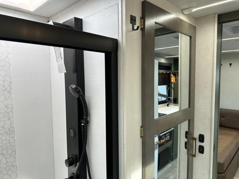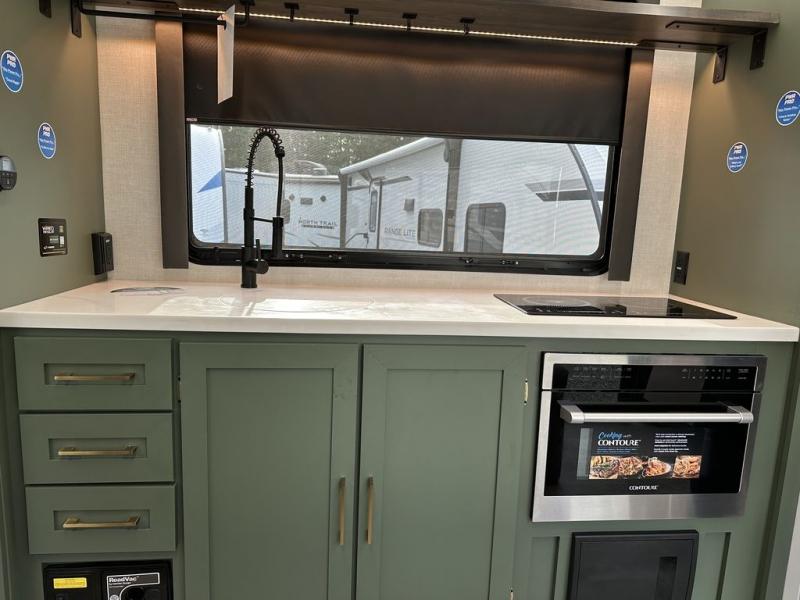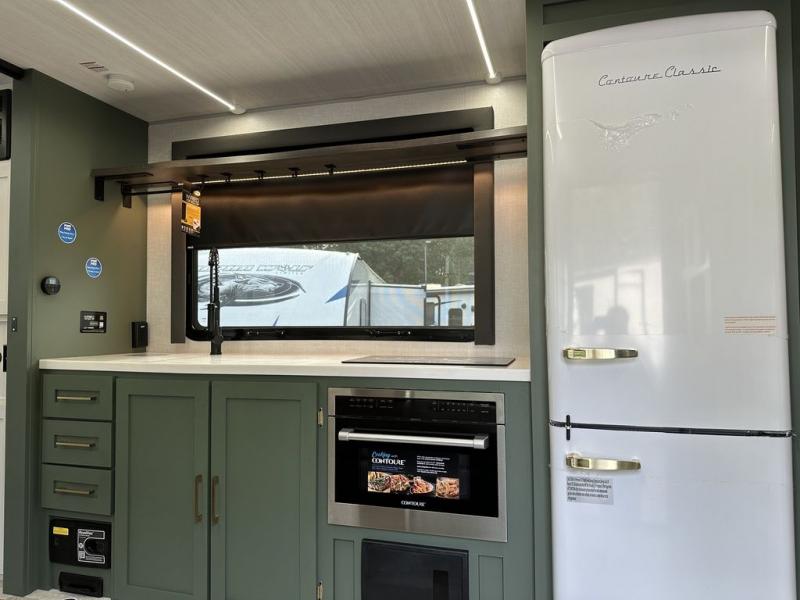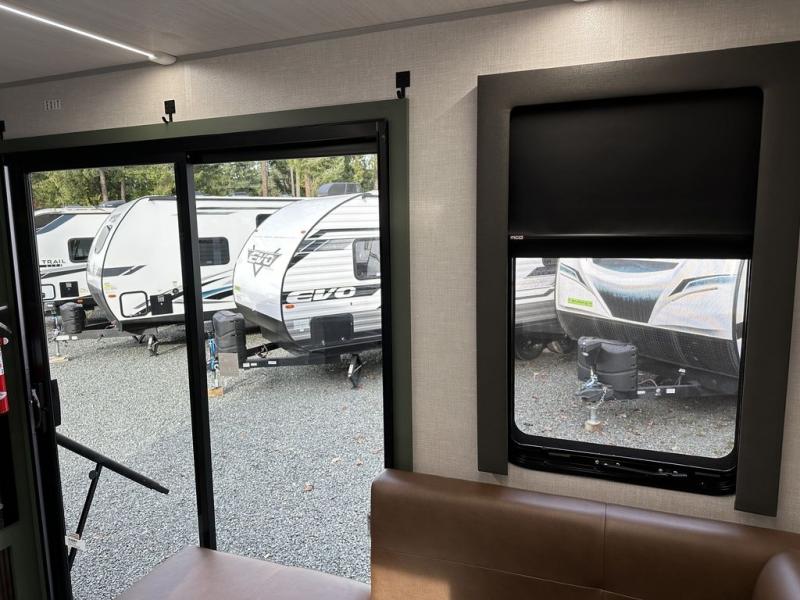 It won't be hard to find comfort in this travel trailer, whether you're camping on the weekends, or going full-time! There is a built-in king suite with a remote work area and standing desk that will allow you to utilize this room as a bedroom or office! There are also dual bedroom wardrobes for your things and rear doors that lead to a cozy sun deck! The middle living room/kitchen includes a luxury lounge, a fireplace, a two burner cooktop, and a 12 cu. ft. icebox refrigerator. You will love the front bath with dual bath sinks, two linen closets, plus a waterfall shower for added luxury. And the optional washer/dryer combo is an added benefit you might want to take advantage of!