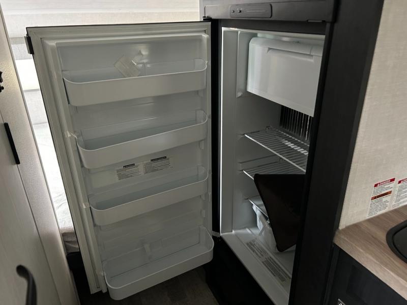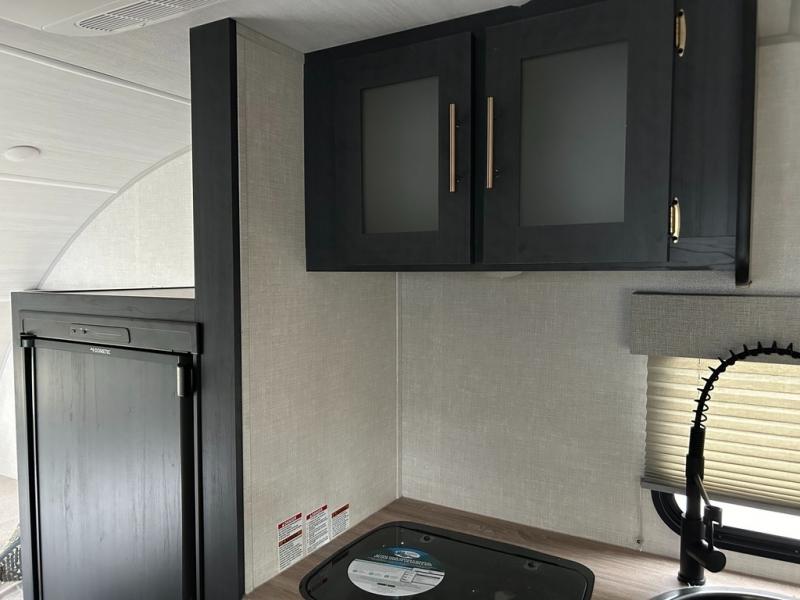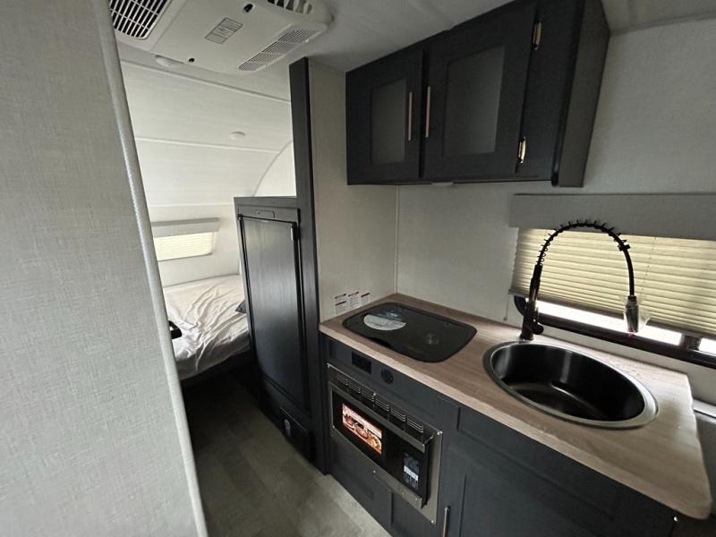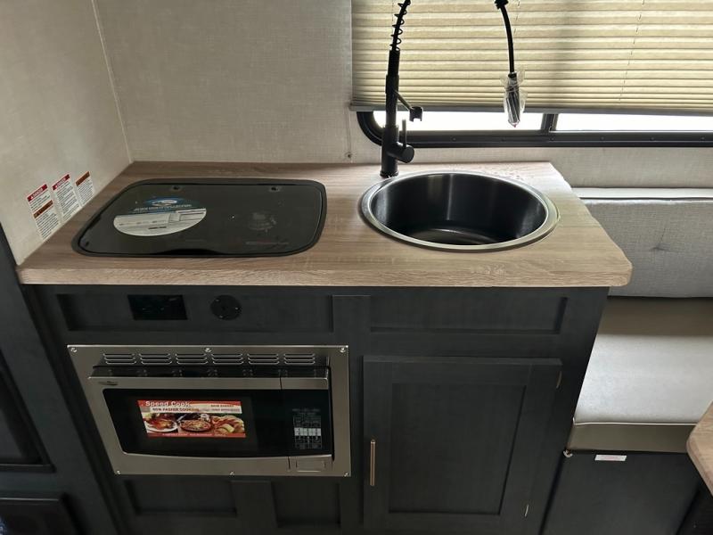 With any R-Pod Classic travel trailer by Forest River, you will enjoy at home-comforts and lightweight towing. There are magnetic door catches that will easily keep the door open when you're packing hiking gear or bringing in your luggage. Each model includes 30 Amp service with a detachable power cord, a 20 lb. propane tank with a cover, and a high efficiency roof-mounted air conditioner that will keep you cool during the summer camping months. Inside, you'll find a two burner recessed cooktop with a flush mount glass cover, a convection microwave, and new Cosmetic Graphite interior for a modern look you will love.