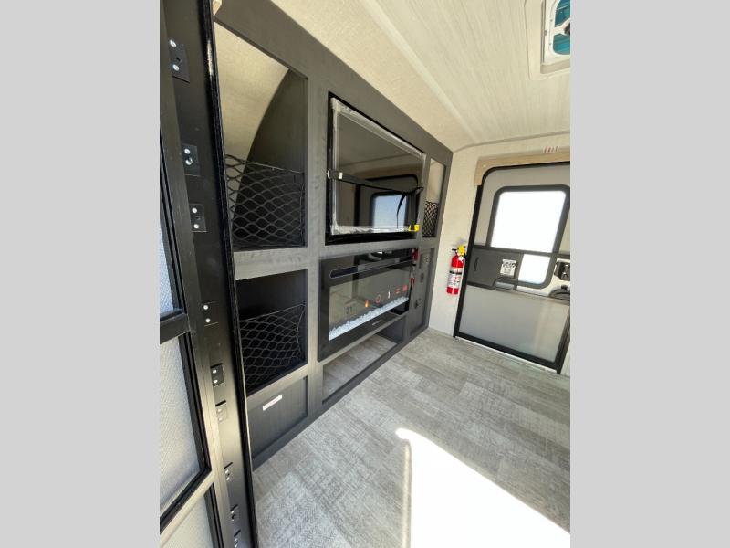 Enjoy lightweight towing and comfort with this dual entry travel trailer! Once you arrive at the campsite, you can grab your hiking boots from the storage and head out to find a trail or two. The queen-sized bed/sofa combo will provide a place to relax and sleep each night, and there is even a fireplace here to make this area more cozy. In the morning you can make breakfast at the rear outside kitchen that includes a refrigerator, a two burner cooktop, and a sink.
