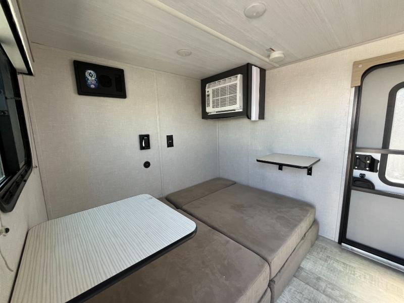 Enjoy lightweight towing and comfort with this dual entry travel trailer! Once you arrive at the campsite, you can grab your hiking boots from the storage and head out to find a trail or two. The queen-sized bed/sofa combo will provide a place to relax and sleep each night, and there is even a fireplace here to make this area more cozy. In the morning you can make breakfast at the rear outside kitchen that includes a refrigerator, a two burner cooktop, and a sink.