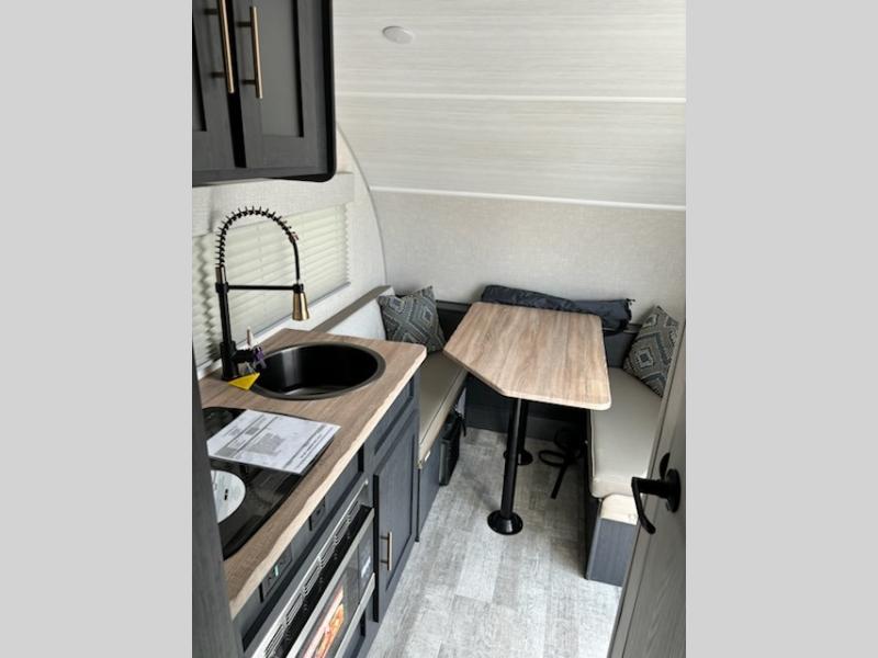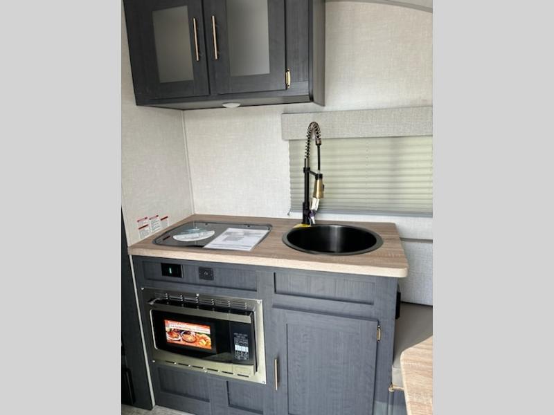 With any R-Pod Classic travel trailer by Forest River, you will enjoy at home-comforts and lightweight towing. There are magnetic door catches that will easily keep the door open when you're packing hiking gear or bringing in your luggage. Each model includes 30 Amp service with a detachable power cord, a 20 lb. propane tank with a cover, and a high efficiency roof-mounted air conditioner that will keep you cool during the summer camping months. Inside, you'll find a two burner recessed cooktop with a flush mount glass cover, a convection microwave, and new Cosmetic Graphite interior for a modern look you will love.
