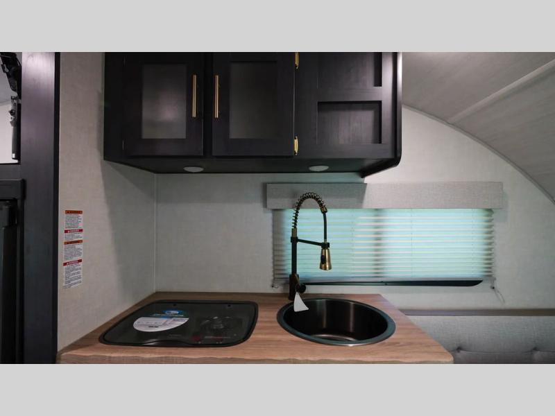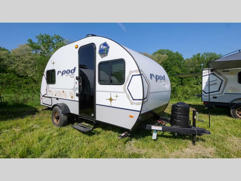 With any R Pod Classic travel trailer by Forest River, you will enjoy at home-comforts and lightweight towing. There are magnetic door catches that will easily keep the door open when you're packing hiking gear or bringing in your luggage. Each model includes 30 Amp service with a detachable power cord, a 20 lb. propane tank with a cover, and a high efficiency roof-mounted air conditioner that will keep you cool during the summer camping months. Inside, you'll find a two burner recessed cooktop with a flush mount glass cover, a convection microwave, and new Cosmetic Graphite interior for a modern look you will love.
