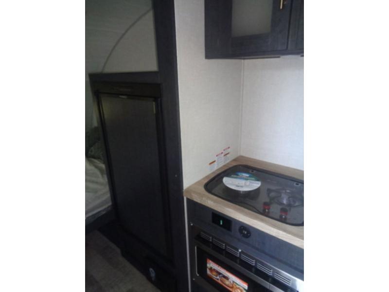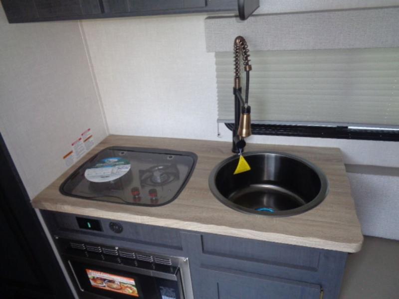 With any R Pod Classic travel trailer by Forest River, you will enjoy at home-comforts and lightweight towing. There are magnetic door catches that will easily keep the door open when you're packing hiking gear or bringing in your luggage. Each model includes 30 Amp service with a detachable power cord, a 20 lb. propane tank with a cover, and a high efficiency roof-mounted air conditioner that will keep you cool during the summer camping months. Inside, you'll find a two burner recessed cooktop with a flush mount glass cover, a convection microwave, and new Cosmetic Graphite interior for a modern look you will love.