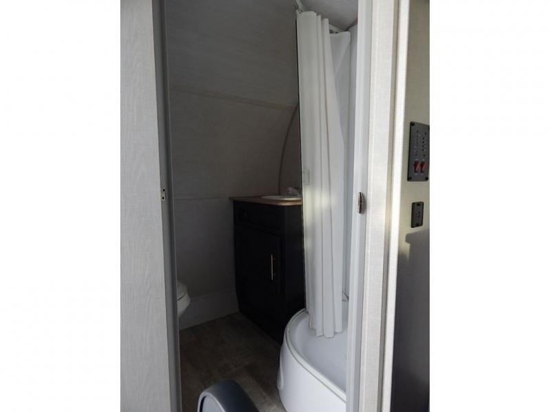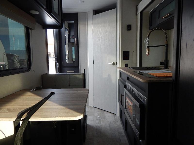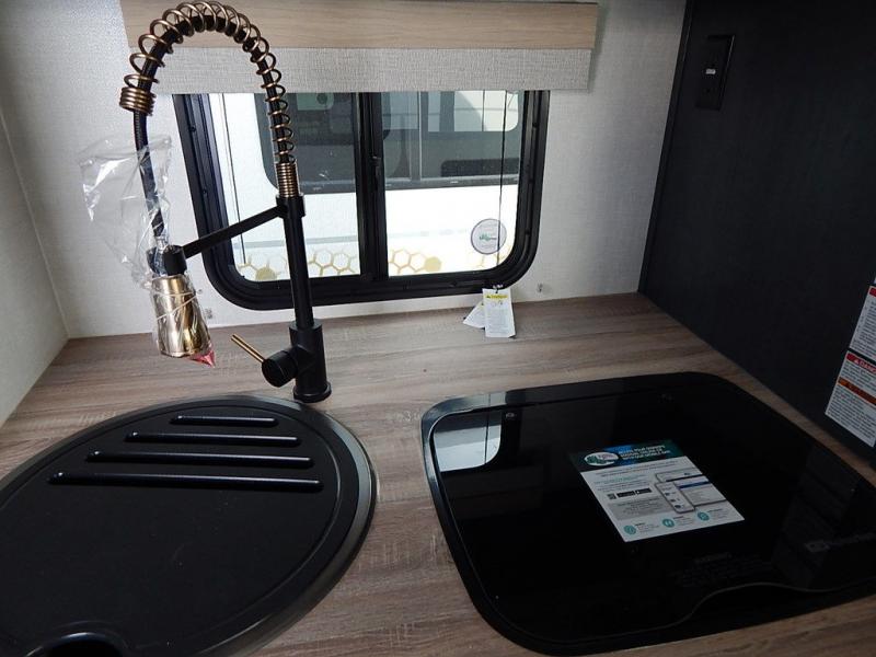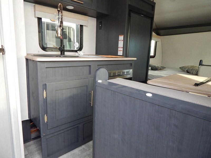 With any R Pod Classic travel trailer by Forest River, you will enjoy at home-comforts and lightweight towing. There are magnetic door catches that will easily keep the door open when you're packing hiking gear or bringing in your luggage. Each model includes 30 Amp service with a detachable power cord, a 20 lb. propane tank with a cover, and a high efficiency roof-mounted air conditioner that will keep you cool during the summer camping months. Inside, you'll find a two burner recessed cooktop with a flush mount glass cover, a convection microwave, and new Cosmetic Graphite interior for a modern look you will love.