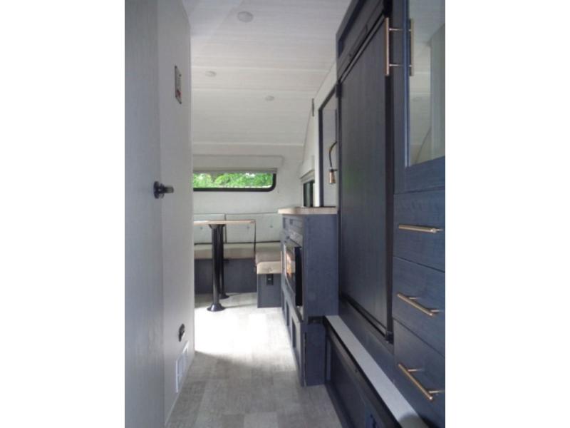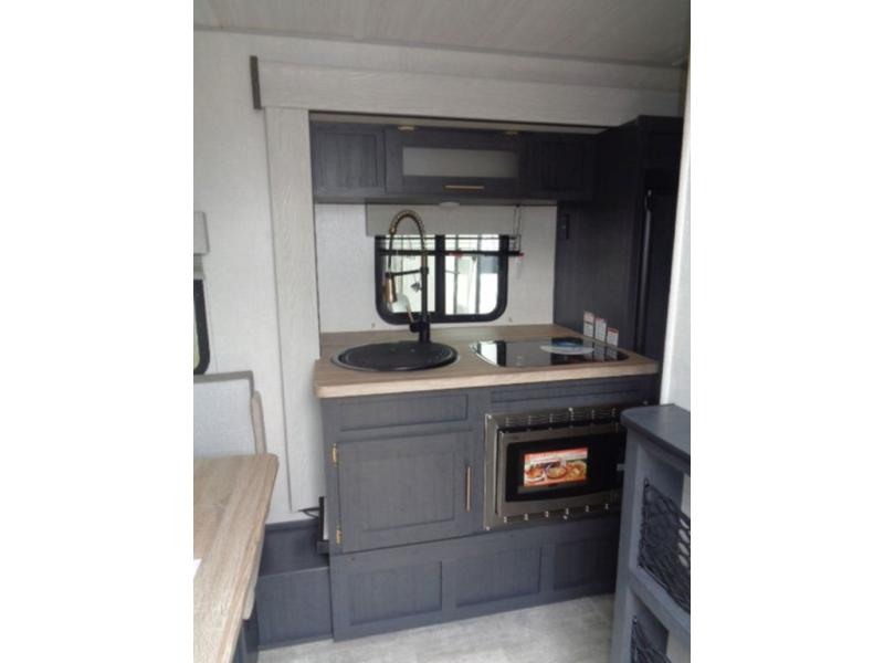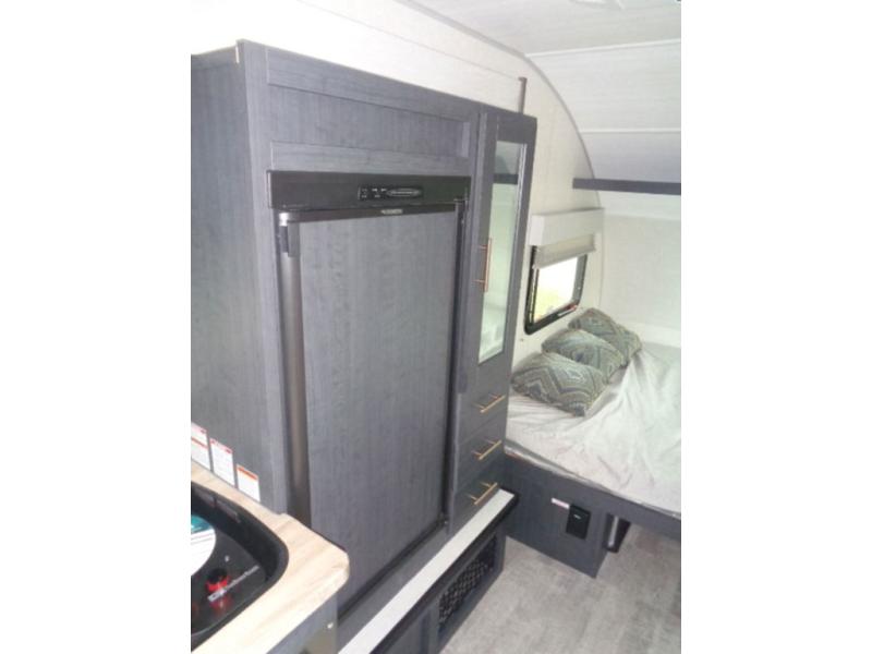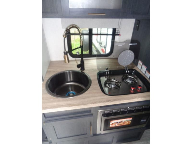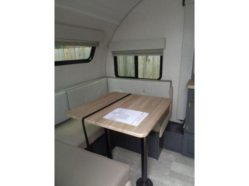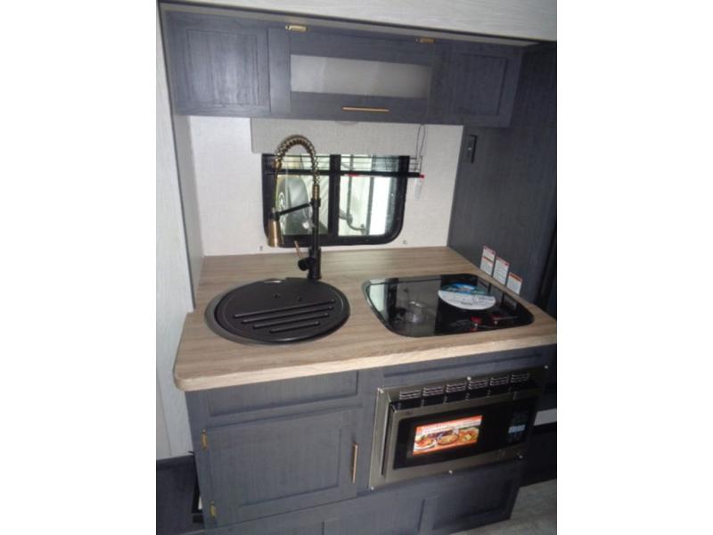 With any R Pod Classic travel trailer by Forest River, you will enjoy at home-comforts and lightweight towing. There are magnetic door catches that will easily keep the door open when you're packing hiking gear or bringing in your luggage. Each model includes 30 Amp service with a detachable power cord, a 20 lb. propane tank with a cover, and a high efficiency roof-mounted air conditioner that will keep you cool during the summer camping months. Inside, you'll find a two burner recessed cooktop with a flush mount glass cover, a convection microwave, and new Cosmetic Graphite interior for a modern look you will love.