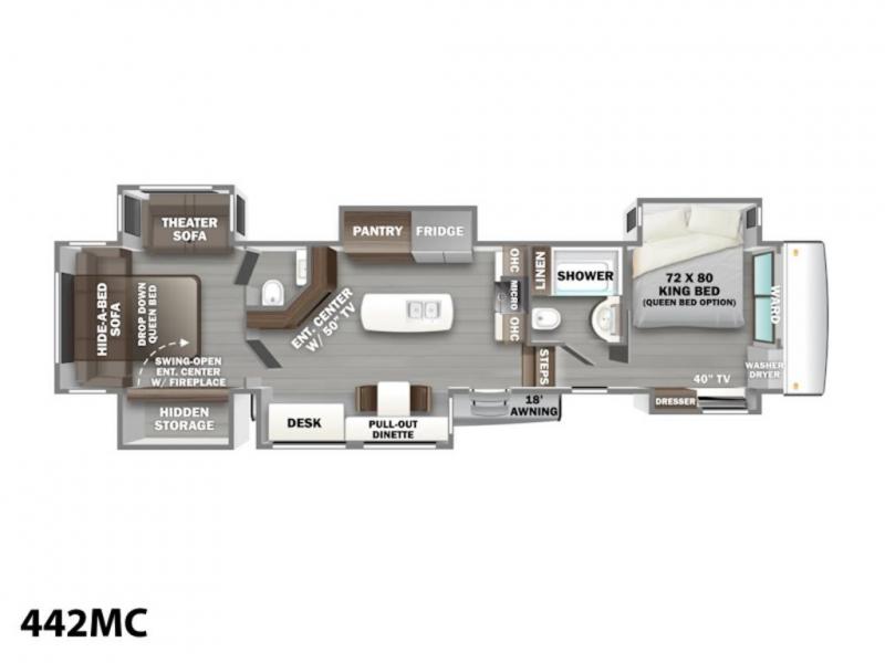 This RiverStone fifth wheel has an amazing den in the back! This area is not only an excellent lounging space with its theater sofa, hide-a-bed sofa, and entertainment center, but it is also a comfortable guest suite because it contains its own half bathroom and a drop-down queen bed. Each section of this unit has opposing slides, so you'll have plenty of living space, and the kitchen area has a pull-out dinette so that you can sit down with hot meals each night. You have a large pantry for snacks and an 18-cubic foot French door refrigerator with ice maker for cold beverages. The ceiling fan allows you to cool off the interior without overworking the AC, and the central vacuum system will help you clean up messes.