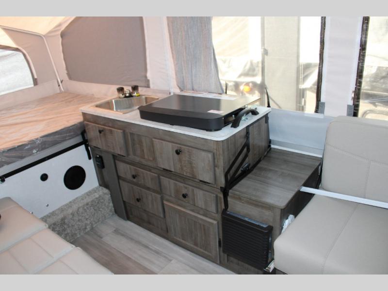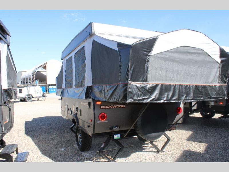The Rockwood Extreme Sports (ESP) pop-up campers by Forest River let you enjoy your adventures without the hassle! There are aluminum wheels with 15" Mud Rover tires for better ground clearance, a power roof lift for easy set up, plus durable Vinolon supreme tent material. Within the Extreme Package, you'll also find a 200W roof mount solar panel with a 1000W inverter, an outside griddle, a Create-A-Breeze roof vent fan, and many more convenient features. The Autumn Wood interior and wood plank flooring will make your space feel more like home, plus there are LED ceiling lights, residential style cabinet doors, and smoked vinyl windows. A Bluetooth stereo with outside speakers also comes standard, along with diamond plate accents, an exterior patio light, A/C roof bracing, and more!