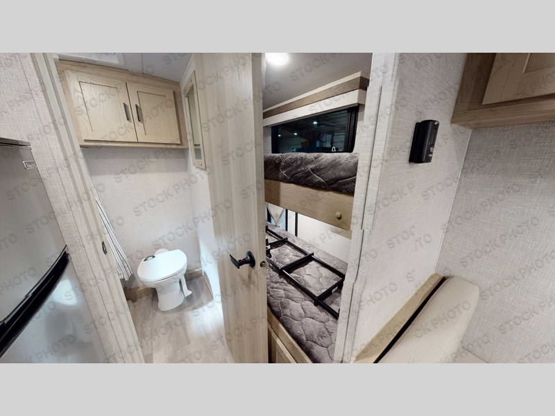 This no slide travel trailer is the perfect lightweight RV for those that love to move around to different campsites. It will be so easy packing up the lawn chairs in the bike door, and there is a rear ladder if you need to clean off the top of your unit. Once you arrive at your destination, put out the 14' power awning, then make lunch on the outside griddle. You will also find a microwave oven and a gas oven indoors and a booth dinette where you dine together. This area can be a sleeping space for a small child or adult, plus there is a full-size bed up front and bunk beds in the back. The optional Power Package available on this model includes three 200W solar panels, a 30 Amp solar charge controller, two Mastervolt smart remotes, and more off-grid features!