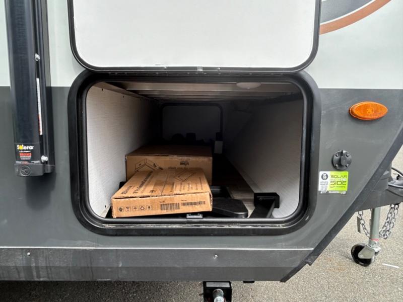 This no slide travel trailer is the perfect lightweight RV for those that love to move around to different campsites. It will be so easy packing up the lawn chairs in the bike door, and there is a rear ladder if you need to clean off the top of your unit. Once you arrive at your destination, put out the 14' power awning, then make lunch on the outside griddle. You will also find a microwave oven and a gas oven indoors and a booth dinette where you dine together. This area can be a sleeping space for a small child or adult, plus there is a full-size bed up front and bunk beds in the back. The optional Power Package available on this model includes three 200W solar panels, a 30 Amp solar charge controller, two Mastervolt smart remotes, and more off-grid features!