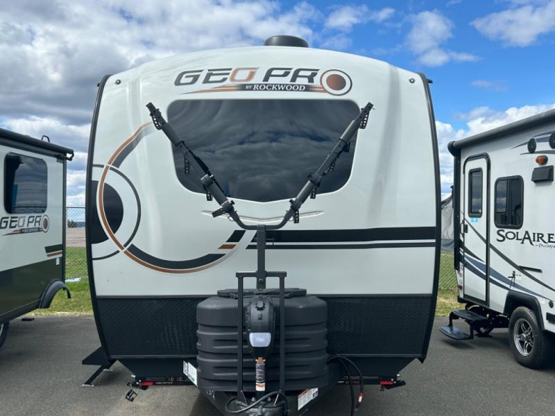With any Rockwood GEO Pro travel trailer by Forest River you will enjoy easy towing, durable construction, and off-road capabilities with larger 15" tires and a lift kit! Package A includes a 200W solar panel and an 1800W inverter to go off-grid when you want, a tire pressure monitoring system and Key Alike door and compartment locks, plus a power awning to relax outdoors. Each model is constructed with complete composite wall construction for added strength and durability, and the torsion axle, Rubber-Ryde suspension will make towing easier than ever. Inside, you'll find sleek roller shades and hidden hinge cabinet doors, a 12V refrigerator and a microwave, plus a 20,000 BTU furnace to keep you warm during the colder camping months.