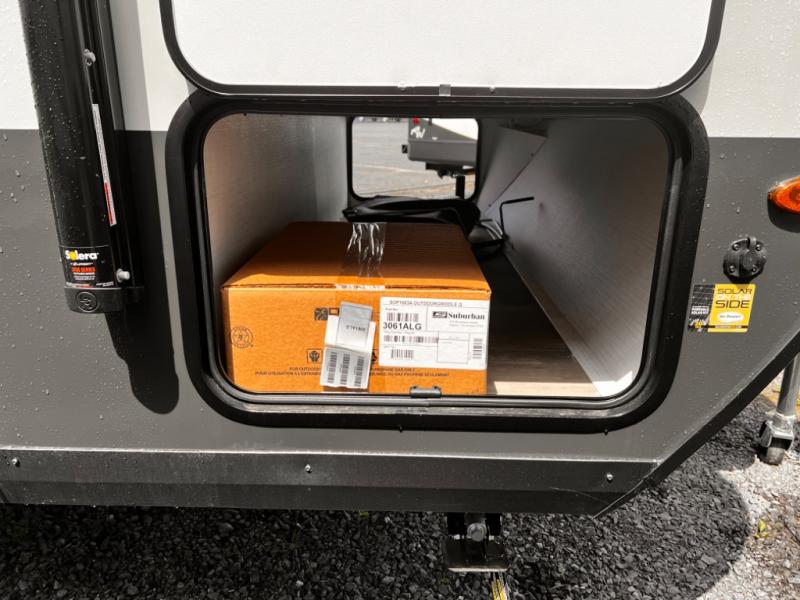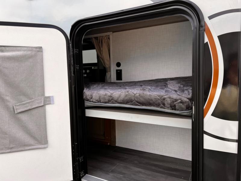 This no slide travel trailer is the perfect lightweight RV for those that love to move around to different campsites. It will be so easy packing up the lawn chairs in the bike door, and there is a rear ladder if you need to clean off the top of your unit. Once you arrive at your destination, put out the 14' power awning, then make lunch on the outside griddle. You will also find a microwave oven and a gas oven indoors and a booth dinette where you dine together. This area can be a sleeping space for a small child or adult, plus there is a full-size bed up front and bunk beds in the back. The optional Power Package available on this model includes three 200W solar panels, a 30 Amp solar charge controller, two Mastervolt smart remotes, and more off-grid features!