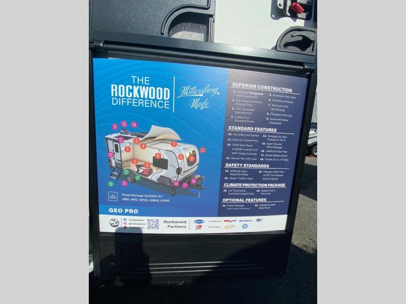 With any Rockwood GEO Pro travel trailer by Forest River you will enjoy easy towing, durable construction, and off-road capabilities with larger 15" tires and a lift kit! Package A includes a 200W solar panel and an 1800W inverter to go off-grid when you want, a tire pressure monitoring system and Key Alike door and compartment locks, plus a power awning to relax outdoors. Each model is constructed with complete composite wall construction for added strength and durability, and the torsion axle, Rubber-Ryde suspension will make towing easier than ever. Inside, you'll find sleek roller shades and hidden hinge cabinet doors, a 12V refrigerator and a microwave, plus a 20,000 BTU furnace to keep you warm during the colder camping months.