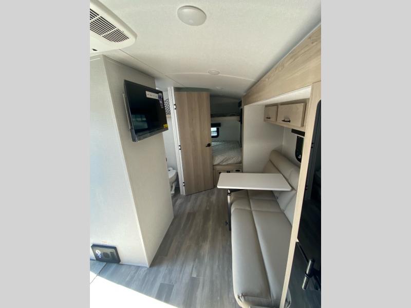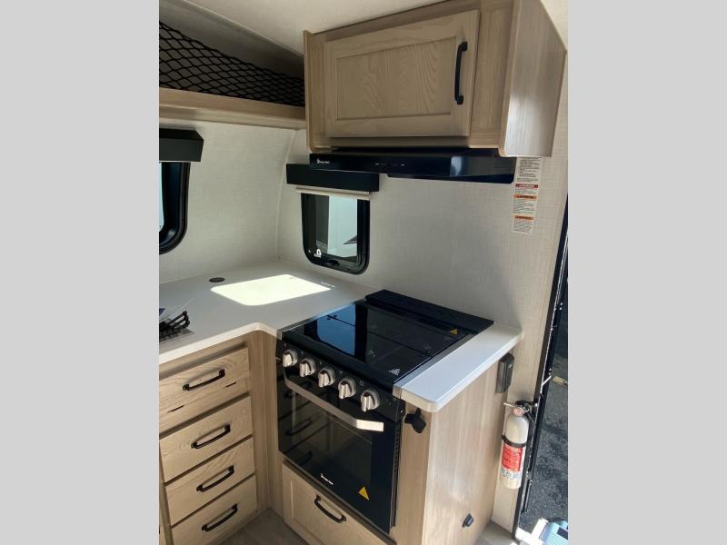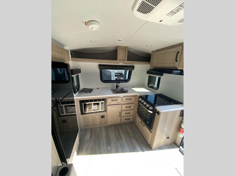 Are you looking for a lightweight trailer with at-home comforts? Take a look at this single slide out unit that can sleep three to four each night. There is a queen-size bed in the back with a 26" x 80" flip-up bunk for cozy sleeping space, a 72" sofa with cupholders to relax on, plus a 32" 12V TV for movie nights! The front kitchen includes a 12V refrigerator to store food, plus a microwave oven and a gas oven to cook meals each day.
