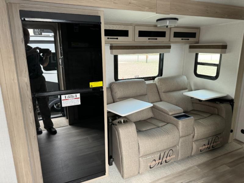 Camping trips to the lake just got sweeter with this dual slide out travel trailer in tow! Once you arrive, unload your gear from the exterior drop-frame pass-through storage, then start lunch on the exterior griddle. If you need a rest after traveling all day, the RV queen bed in the front bedroom is sure to give you comfort, or you can relax on the theater seating. The fireplace and entertainment center with an LED TV will make this space feel just like home, and check out the spacious full rear bath for added privacy. This model also includes an entryway closet/pantry for jackets, shoes, and food!