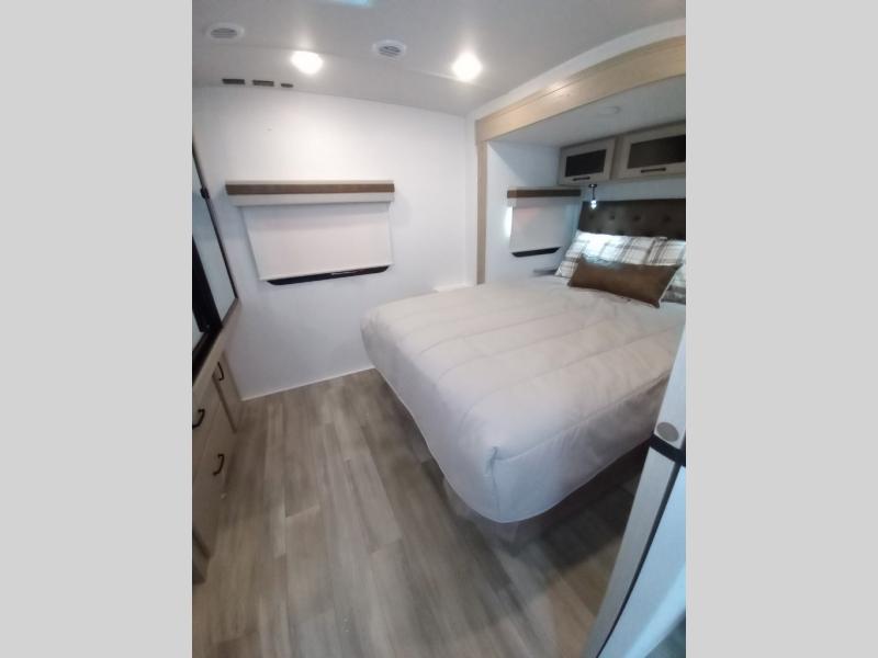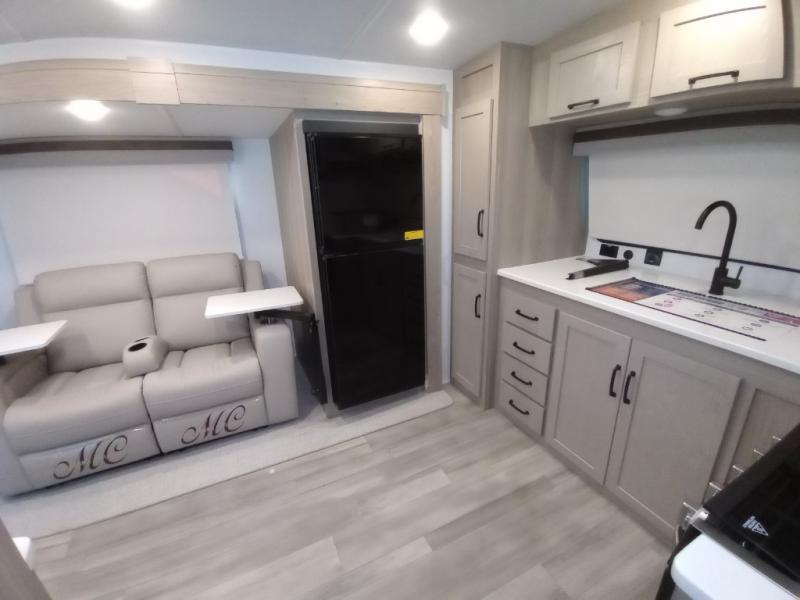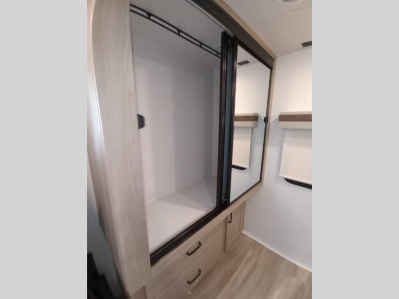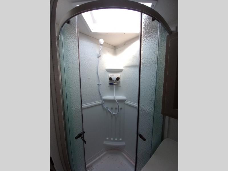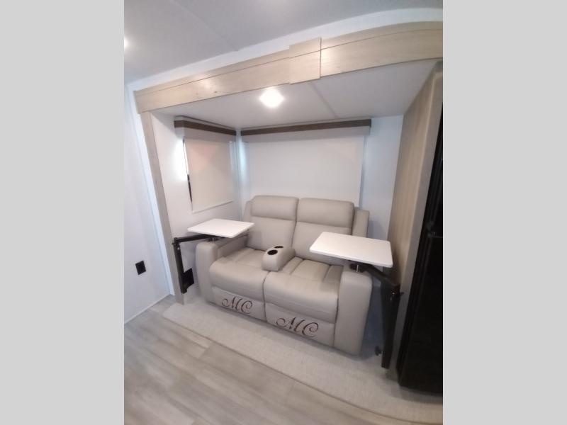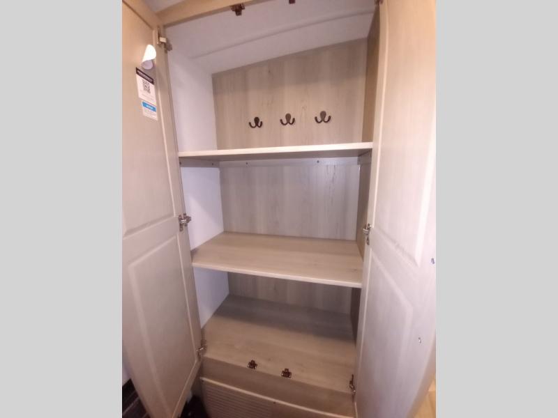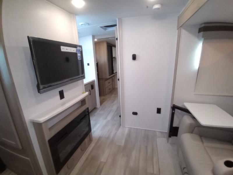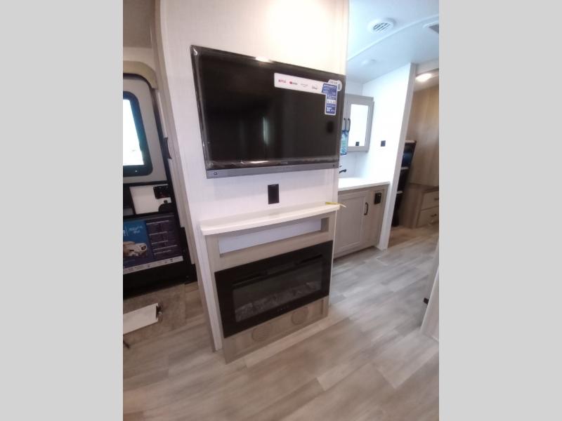 Escape the city life for weekend trips in this cozy couple's trailer. The dual entry doors will allow you to enter in through the rear private bedroom, or the front kitchen/main living area for convenience. You will enjoy relaxing on the theater seating across from the LED TV and fireplace in the evenings, or you can visit outdoors under the 19' power awning. You'll also find an exterior griddle here for quick meals and exterior storage for the fishing poles or hiking gear. This model also includes a walk-through bath with a shower skylight, a linen closet, plus a Showermiser Water Saving System. And don't worry about storage space inside since this model includes an entryway pantry/closet, a second pantry in the front kitchen, plus a large bedroom wardrobe to keep your clothes wrinkle-free!