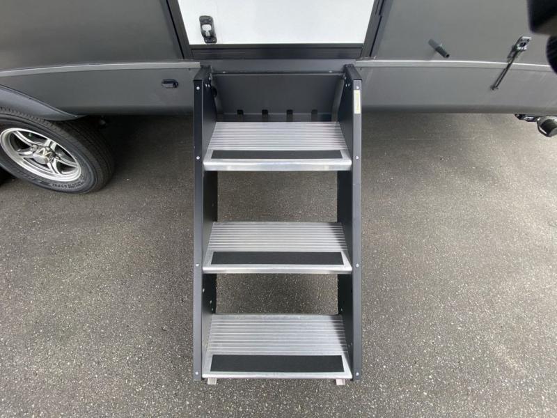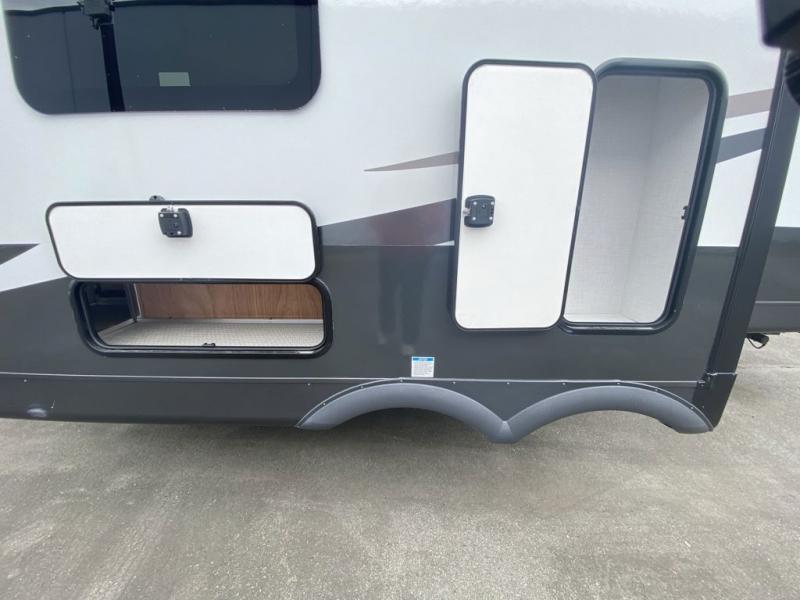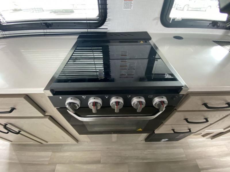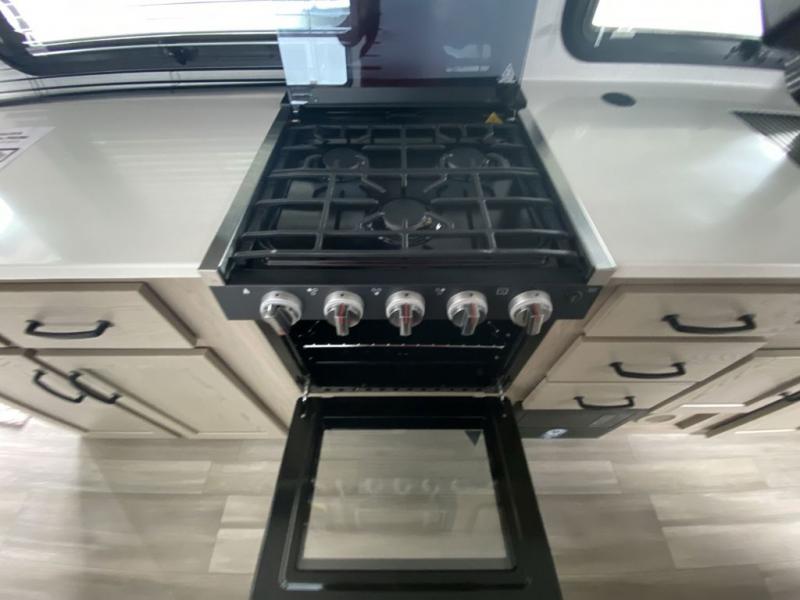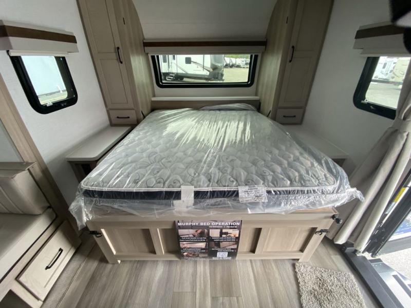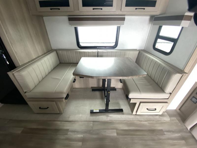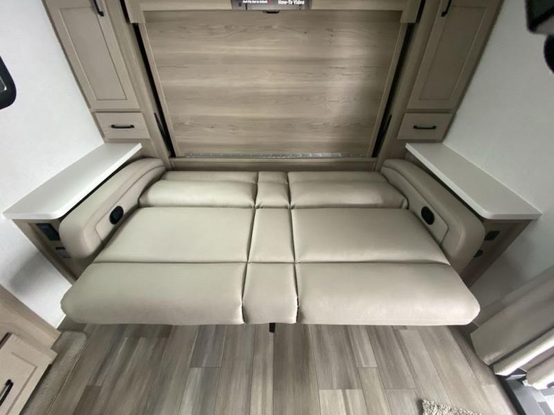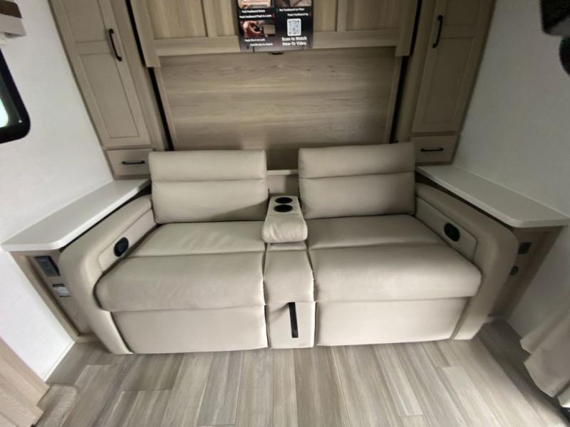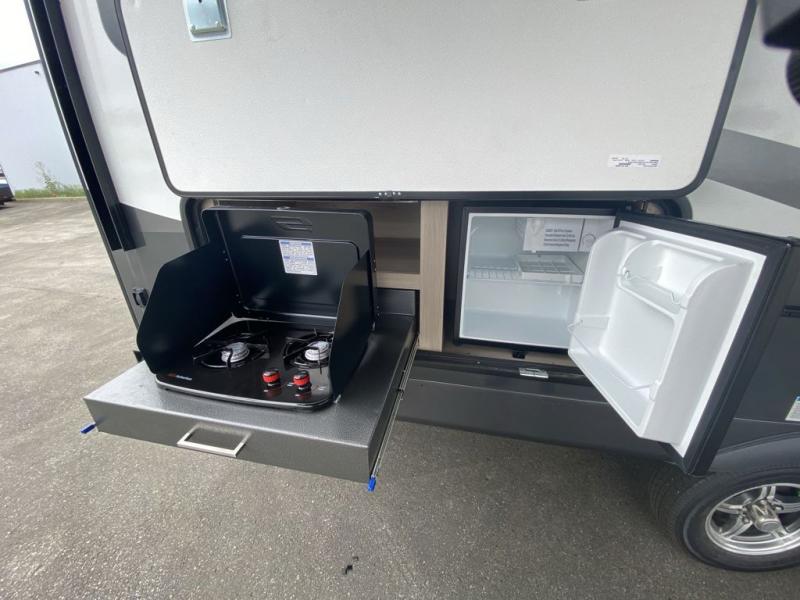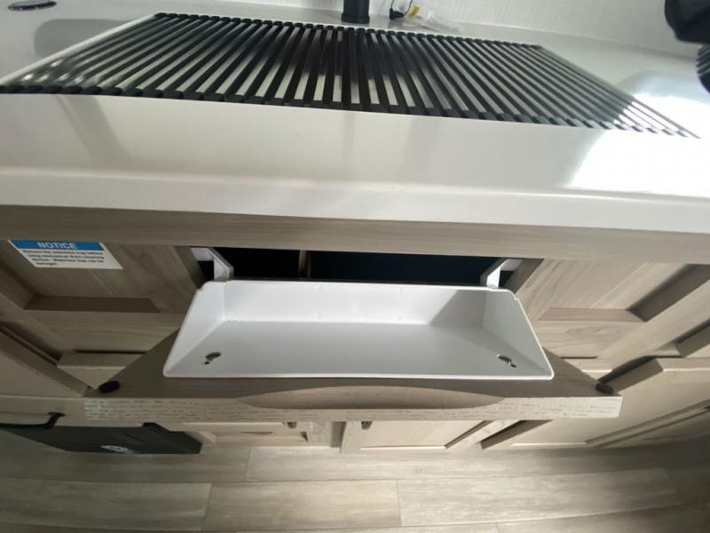 This is the perfect travel trailer for two or four people looking for comfortable and versatile camping trips! You will have your own Murphy bed to sleep on in the front at night, and during the daytime you can fold it up and have a 74" sofa in its place. No need to even make the bed! Breakfast can be made on the three burner cooktop inside, or head outdoors to cook on the outside griddle and pull-out stove under the 18' awning. The u-dinette offers ample room for everyone to gather for a meal or games, and can be transformed into sleeping space as well. This space could also feature an optional theater seat with a table or a hide-a-bed with table if you would prefer to replace the u-dinette. The kitchen features a refrigerator within the large slide as well as a microwave above the stove, plenty of counter space and overhead cabinets, plus the outside griddle and pull-out stove provide you plenty of options when it comes to preparing meals. On the exterior, you will find two storage compartments and a rear ladder for your convenience, plus more.