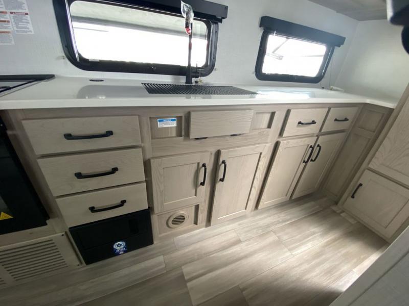 Each Rockwood Mini Lite travel trailer by Forest River is constructed with a fully laminated one-piece walkable roof, sleek frameless windows, and a six-sided full aluminum frame for strength and durability. The 12V thermostatically controlled heated tanks, plus radiant foil in the underbelly, front caps, and slide out floors will allow you to camp well into the colder months, and the 200W roof solar panel will be perfect for a little off-gridding. Each model includes solid surface kitchen countertops, solid wood cabinet doors, night roller shades, plus many more interior features. Having an Air 360+ omnidirectional antenna with wifi prep on board will allow you to get some work done if it's needed, and the power tongue jack provides hassle-free set up, so you can enjoy more time relaxing!