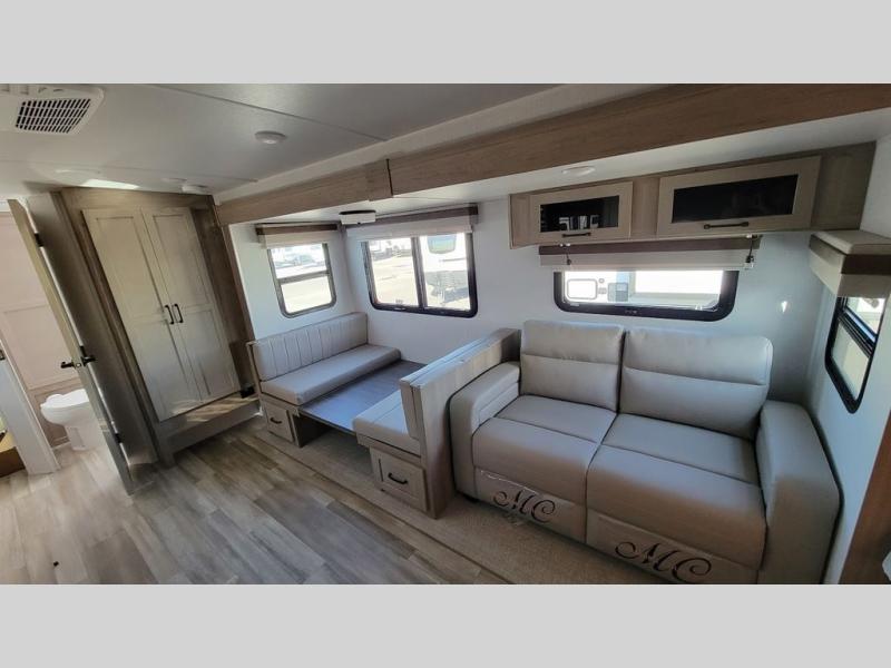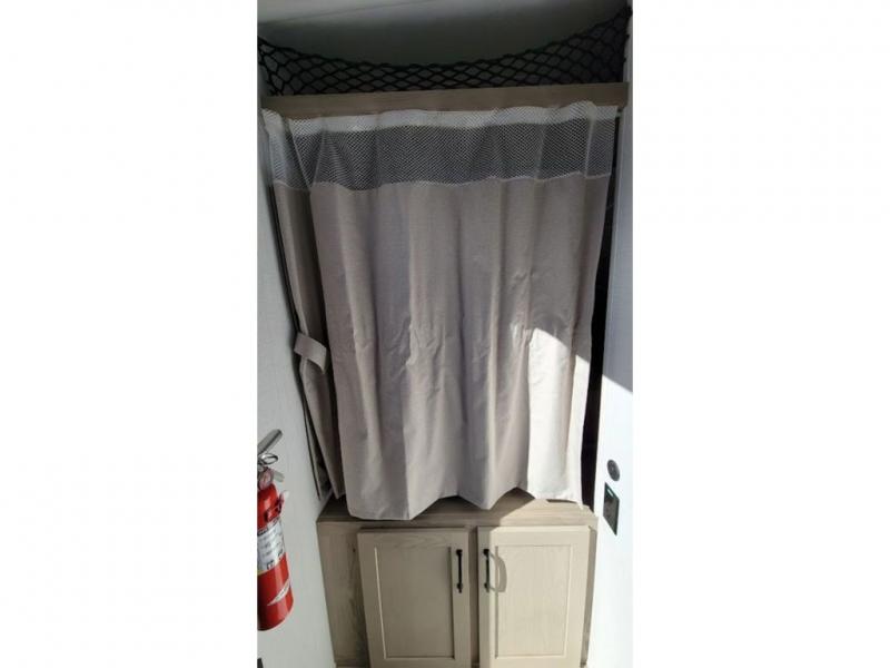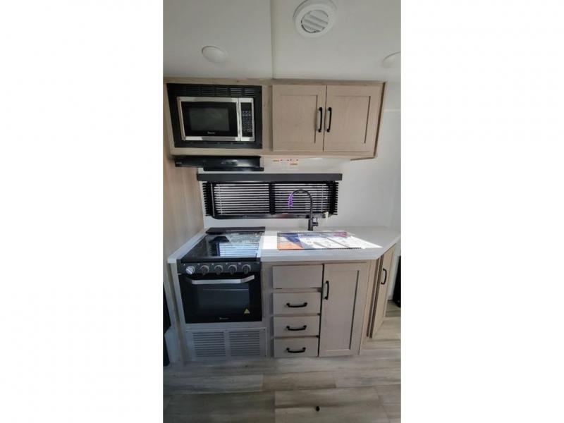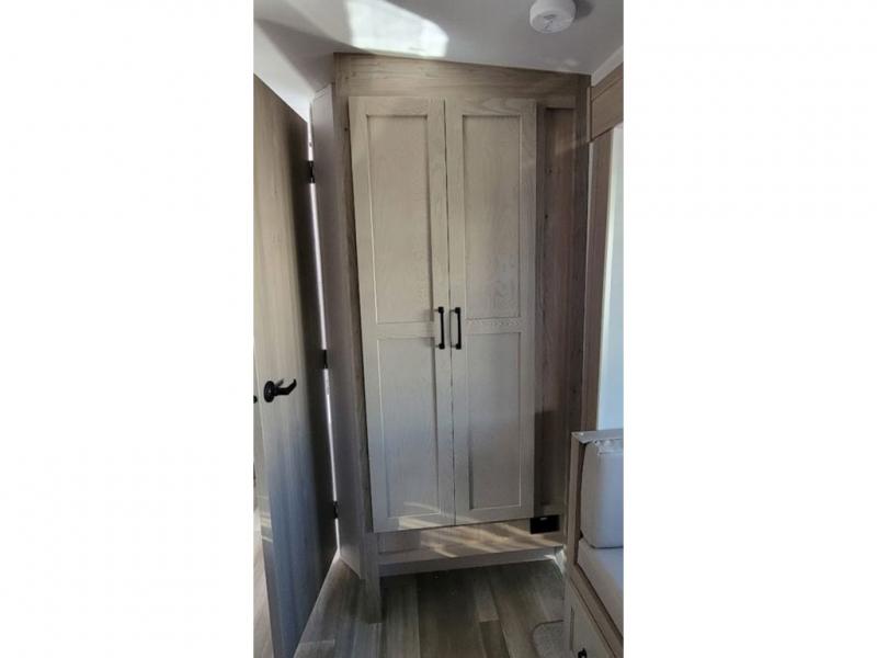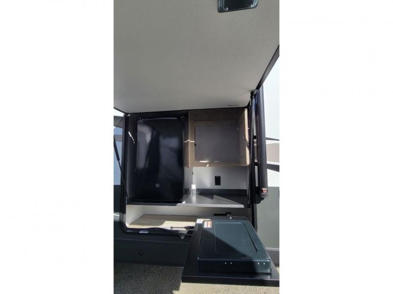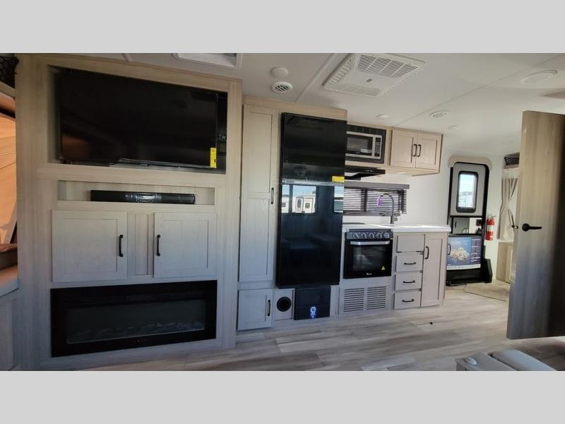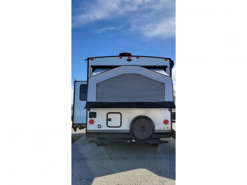 This expandable includes a large slide out that will make you feel right at home, so come take a look! The LED TV and fireplace is right across from the hide-a-bed sofa for easy viewing, and there is a booth dinette to dine together. The chef of the family can cook indoors on the three burner cooktop, or outdoors on the exterior griddle. Tuck your belongings in the overhead shelves, and snacks can go in the pantry. Don't forget about the exterior storage for your larger camp gear!