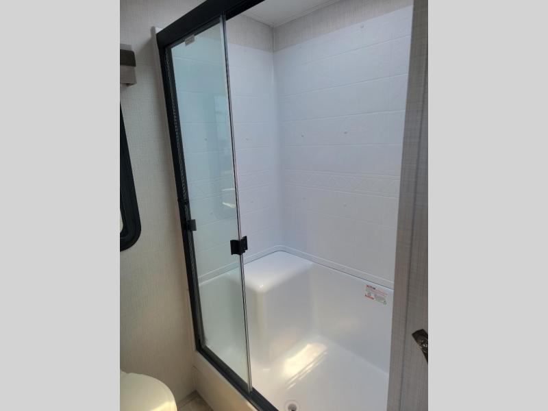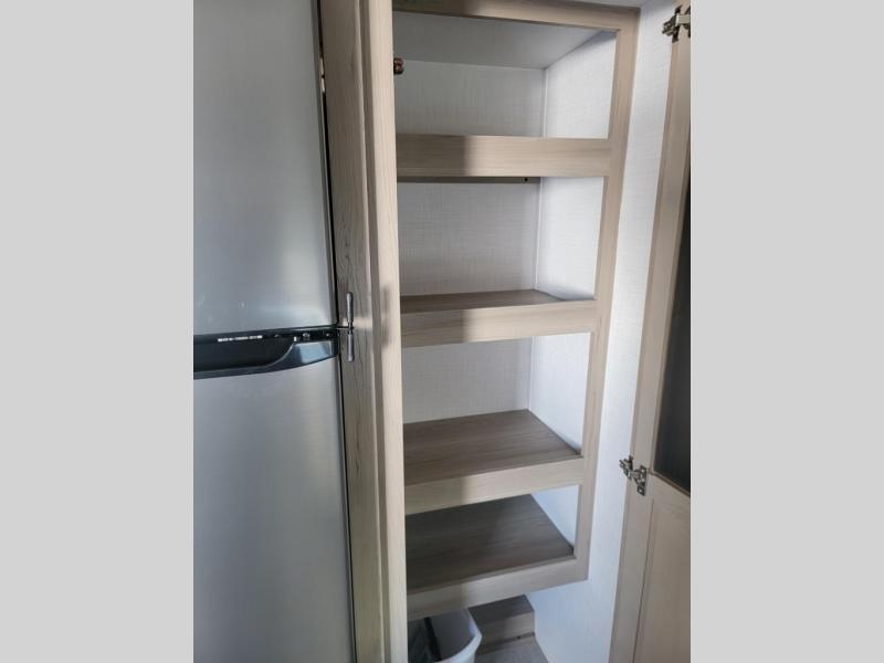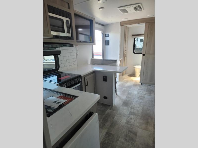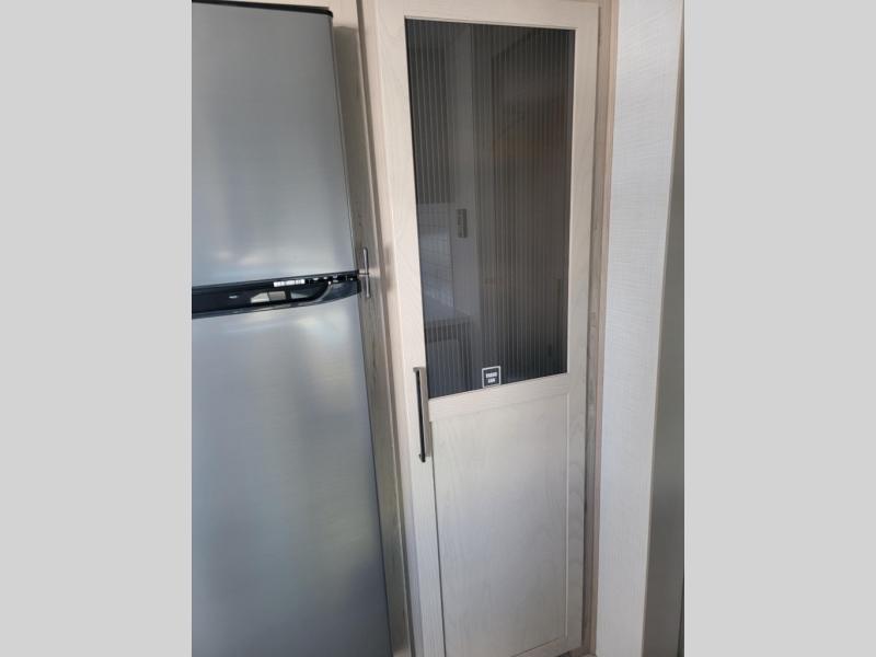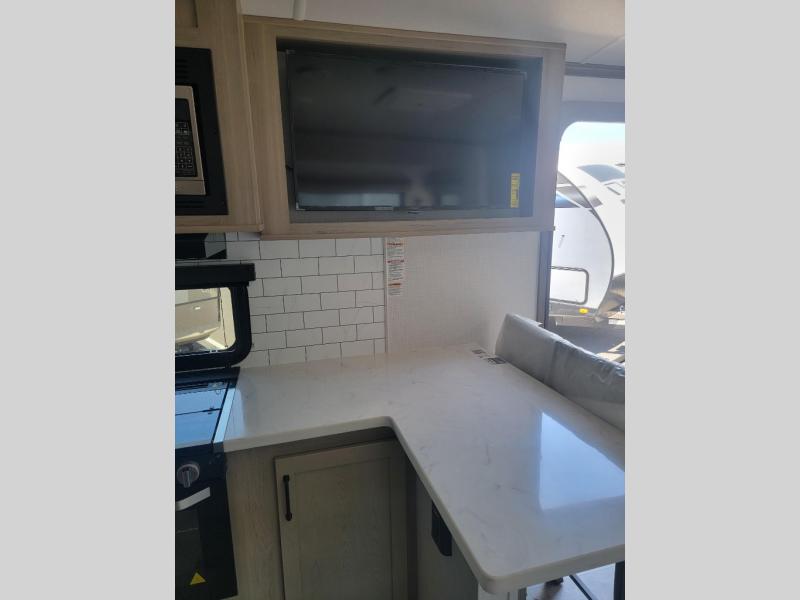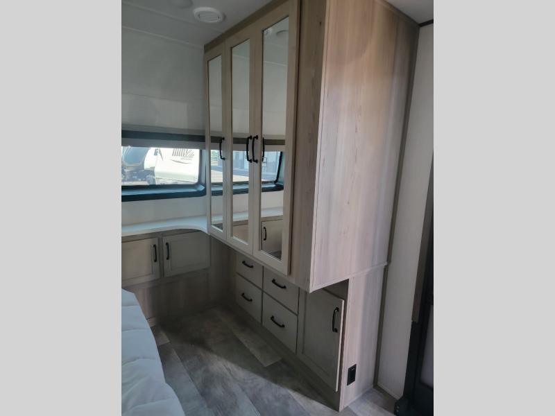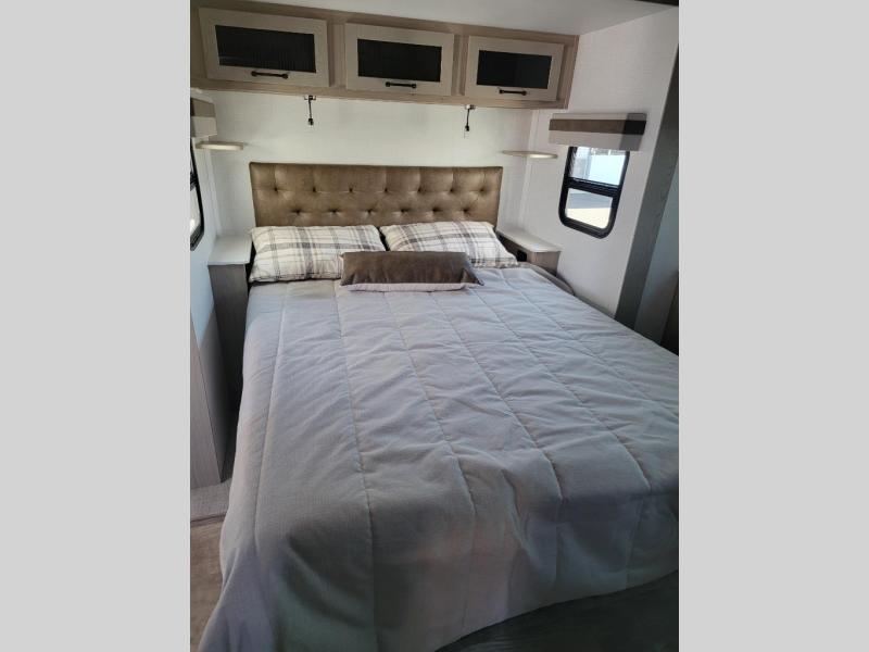 Head to the lake in this cozy couple's trailer with at-home comforts. The large front bedroom includes its own exterior entry door for convenience, plus there is a wardrobe for your clothes and washer and dryer prep. The large slide out in the main living area will allow you to relax in comfort on the theatre seat, and the entertainment center with a Smart TV will allow you to watch your favorite movies at night. There is a counter with stools here where you can dine at each day, and the pantry provides a place to store the snacks. This model also includes a full rear bath for added privacy, and the shower with a seat adds luxury!