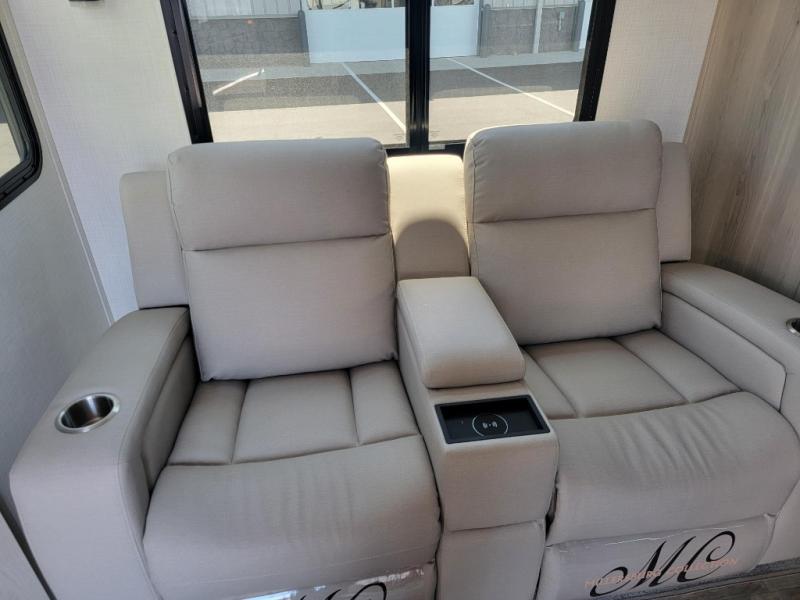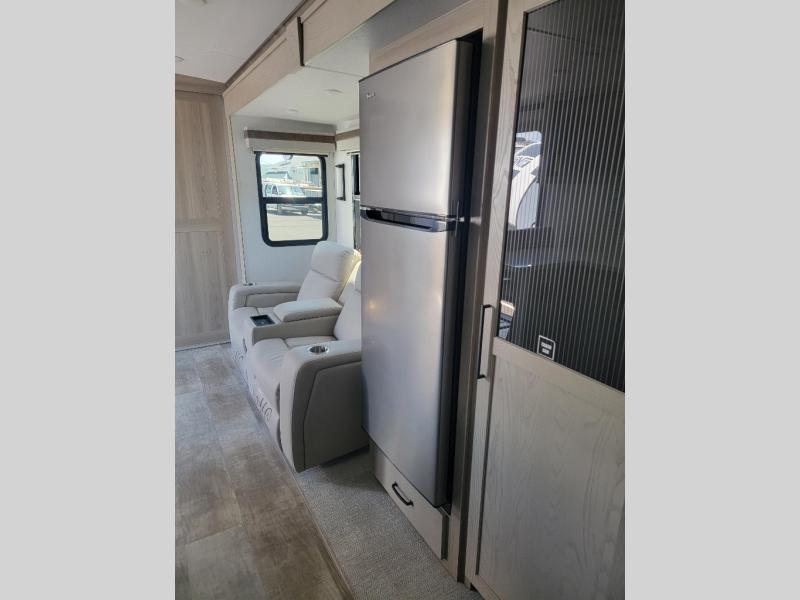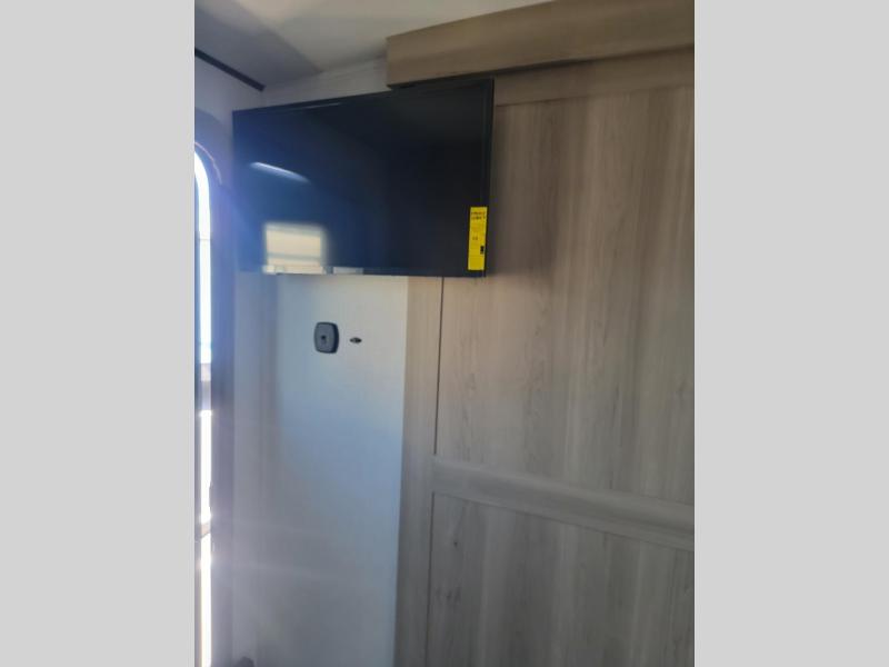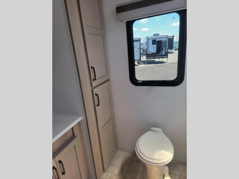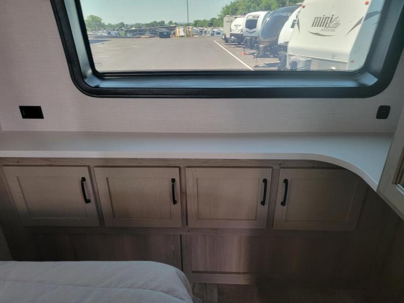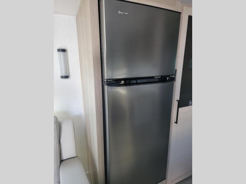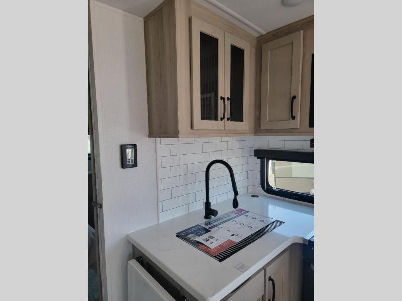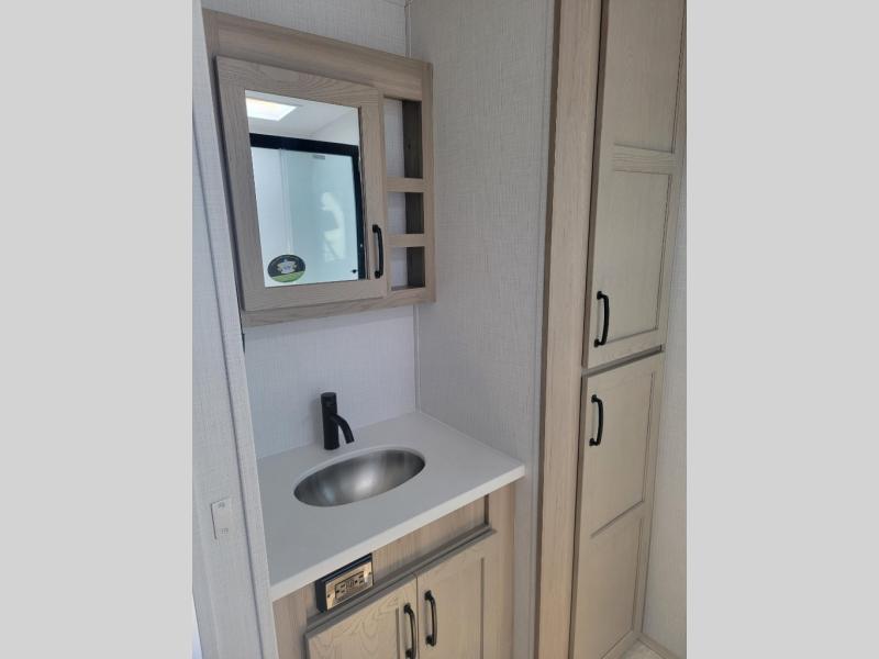 Head to the lake in this cozy couple's trailer with at-home comforts. The large front bedroom includes its own exterior entry door for convenience, plus there is a wardrobe for your clothes and washer and dryer prep. The large slide out in the main living area will allow you to relax in comfort on the theatre seat, and the entertainment center with a Smart TV will allow you to watch your favorite movies at night. There is a counter with stools here where you can dine at each day, and the pantry provides a place to store the snacks. This model also includes a full rear bath for added privacy, and the shower with a seat adds luxury!