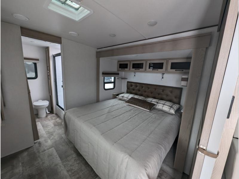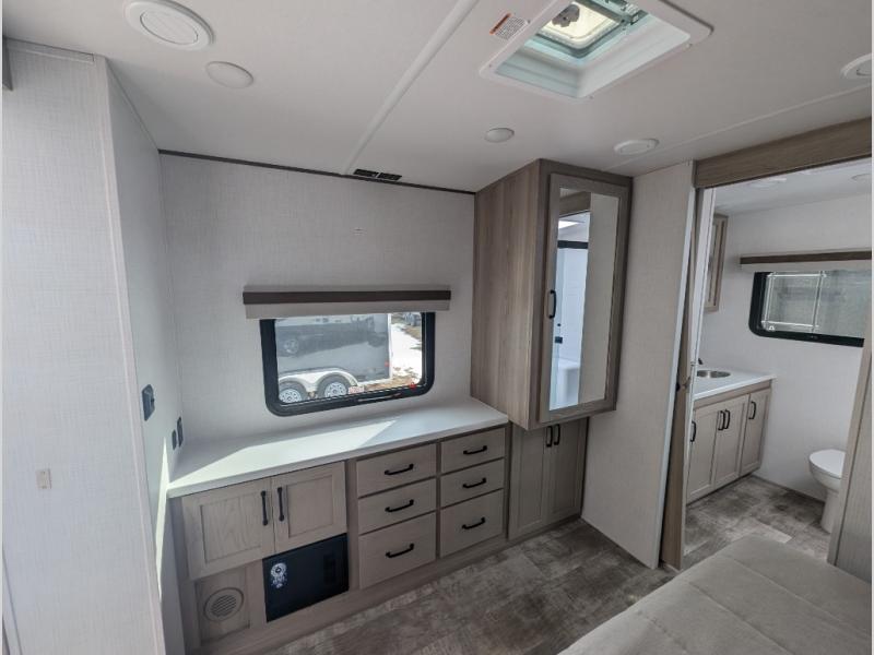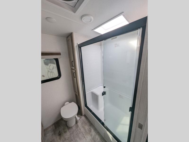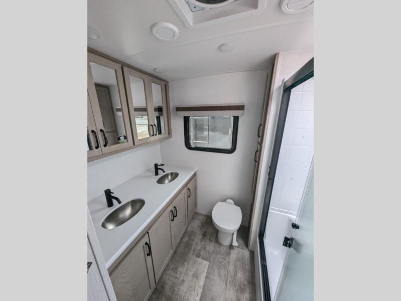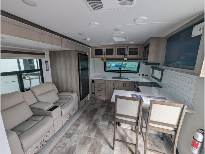 This front kitchen, couple's trailer is ready for adventure when you are! Once you arrive at your destination, prepare a quick lunch on the outside griddle, and enjoy the shade provided by the 19' power awning. You can eat outside, or inside at the counter with stools. The theatre seat will make this travel trailer feel more like home, and the double slides provide more space to stretch out. Within the master bedroom you'll find a king bed, a large wardrobe and a dresser, plus an optional TV. And check out the full rear bath with dual bath sinks and a shower with a seat! Now, that's what I call comfort!