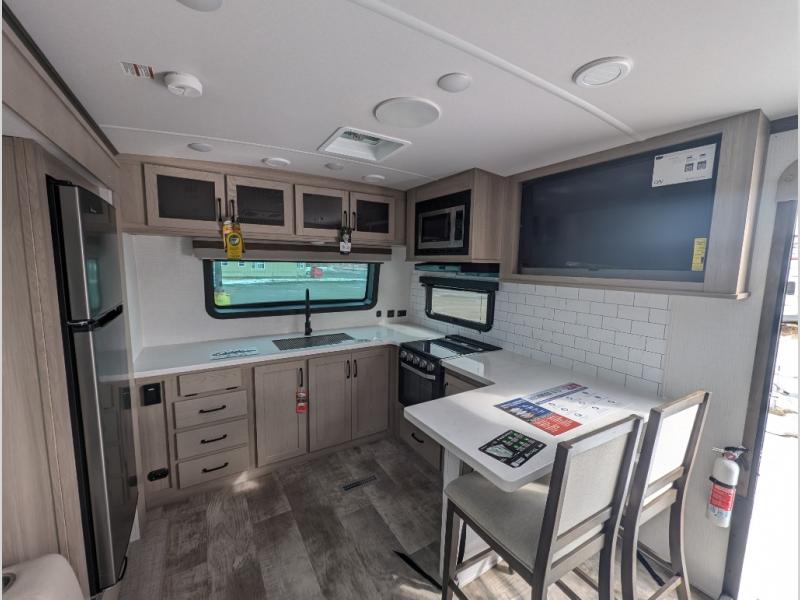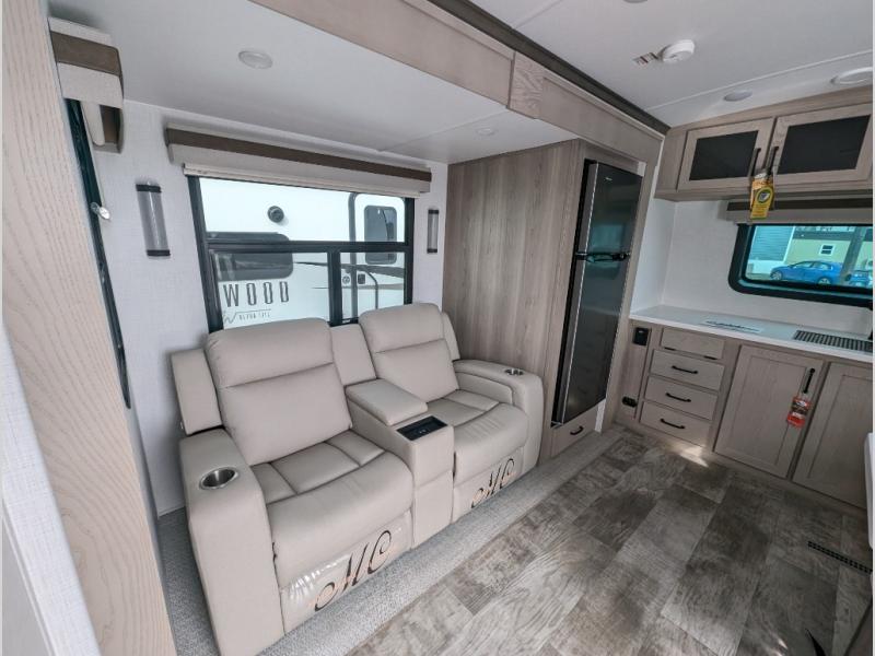 With any Rockwood Signature fifth wheel or travel trailer by Forest River RV, you will enjoy superior construction that includes laminated white fiberglass sidewalls, a radius roof with vaulted interior ceilings, plus radiant foil insulation and an enclosed underbelly for use in all types of weather. Some convenient exterior features include a power tongue jack, a torsion axle, Rubber-Ryde suspension, and a tire pressure monitor system with a monitor for added safety. The interior offers a One Touch OneControl panel with WeRV app control, for lights, awning, slides, water heater and more, and the Air 360+ omnidirectional antenna with WiFi prep lets you work while away from home if needed. You will also appreciate the interior vaulted ceilings, residential soft close doors and drawers, solid surface kitchen countertops, and designer kitchen backsplash!
