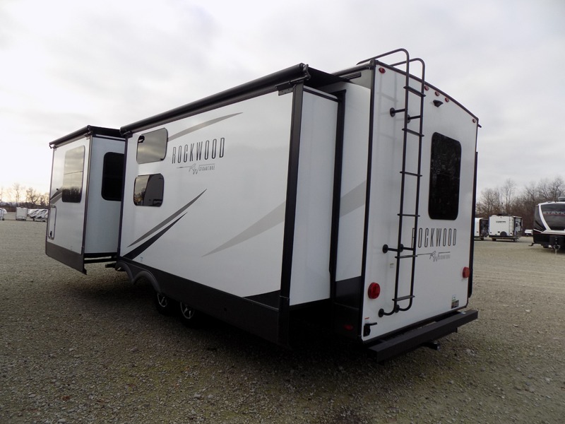 With any Rockwood Signature fifth wheel or travel trailer by Forest River RV, you will enjoy superior construction that includes laminated white fiberglass sidewalls, a radius roof with vaulted interior ceilings, plus radiant foil insulation and an enclosed underbelly for use in all types of weather. Some convenient exterior features include a power tongue jack, a torsion axle, Rubber-Ryde suspension, and a tire pressure monitor system with a monitor for added safety. The interior offers a One Touch OneControl panel with WeRV app control, for lights, awning, slides, water heater and more, and the Air 360+ omnidirectional antenna with WiFi prep lets you work while away from home if needed. You will also appreciate the interior vaulted ceilings, residential soft close doors and drawers, solid surface kitchen countertops, and designer kitchen backsplash!