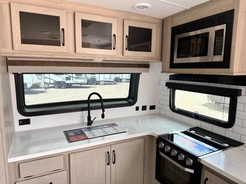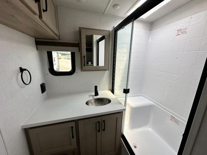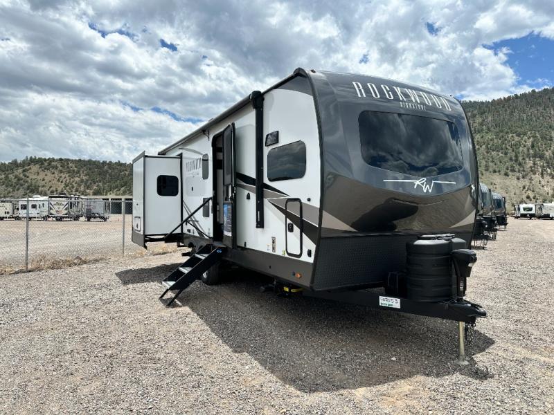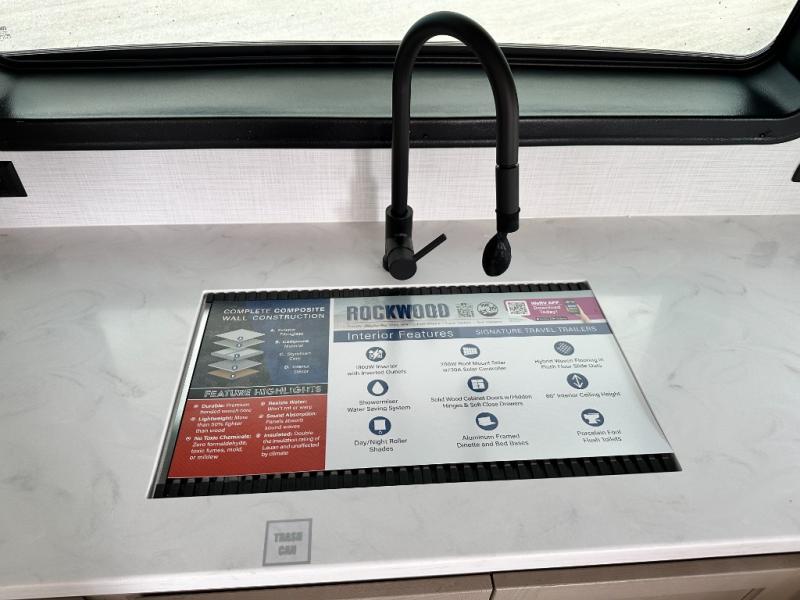 With any Rockwood Signature fifth wheel or travel trailer by Forest River RV, you will enjoy superior construction that includes laminated white fiberglass sidewalls, a radius roof with vaulted interior ceilings, plus radiant foil insulation and an enclosed underbelly for use in all types of weather. Some convenient exterior features include a power tongue jack, a torsion axle, Rubber-Ryde suspension, and a tire pressure monitor system with a monitor for added safety. The interior offers a One Touch OneControl panel with WeRV app control, for lights, awning, slides, water heater and more, and the Air 360+ omnidirectional antenna with WiFi prep lets you work while away from home if needed. You will also appreciate the interior vaulted ceilings, residential soft close doors and drawers, solid surface kitchen countertops, and designer kitchen backsplash!