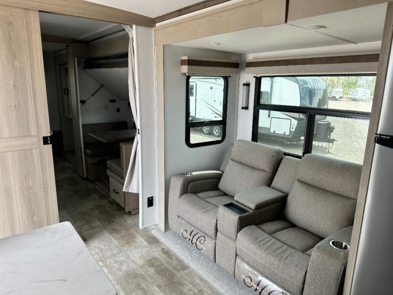 The perfect small family coach with a private bedroom and hallway bunks for the little ones directly opposite a spacious bath is not only practical but convenient. You will love this Signature model with front kitchen including countertop seating for two, plus all of the amenities you need to make meals while you are camped. You will also love the outside griddle tucked under the 21' awning for morning pancakes or to fry up your bacon to keep the strong smell outside. Relax on 67" theater seats with a TV opposite just to the right of the entry door. At night, head to the private bedroom with space saving sliding door for a great night's sleep on the queen bed, and keep all of your clothing neatly tucked away in the wardrobe/linen closet opposite, both are found within a slide creating added floor space for moving around. The many exterior storage spaces allow you to take along all that you might need without worrying about enough room.