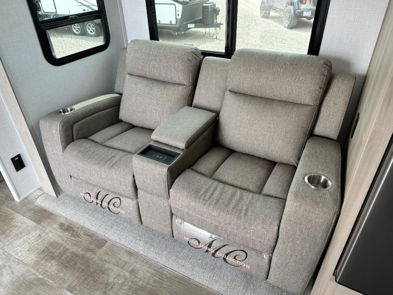 The perfect small family coach with a private bedroom and hallway bunks for the little ones directly opposite a spacious bath is not only practical but convenient. You will love this Signature model with front kitchen including countertop seating for two, plus all of the amenities you need to make meals while you are camped. You will also love the outside griddle tucked under the 21' awning for morning pancakes or to fry up your bacon to keep the strong smell outside. Relax on 67" theater seats with a TV opposite just to the right of the entry door. At night, head to the private bedroom with space saving sliding door for a great night's sleep on the queen bed, and keep all of your clothing neatly tucked away in the wardrobe/linen closet opposite, both are found within a slide creating added floor space for moving around. The many exterior storage spaces allow you to take along all that you might need without worrying about enough room.