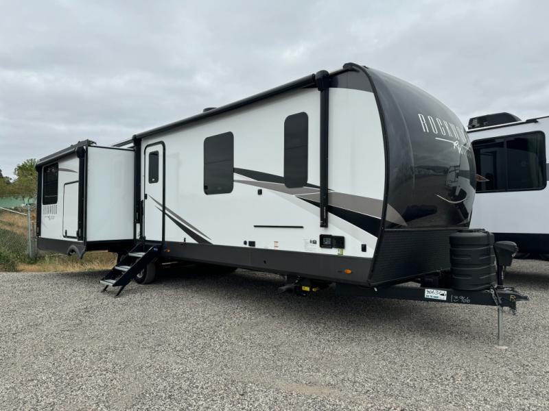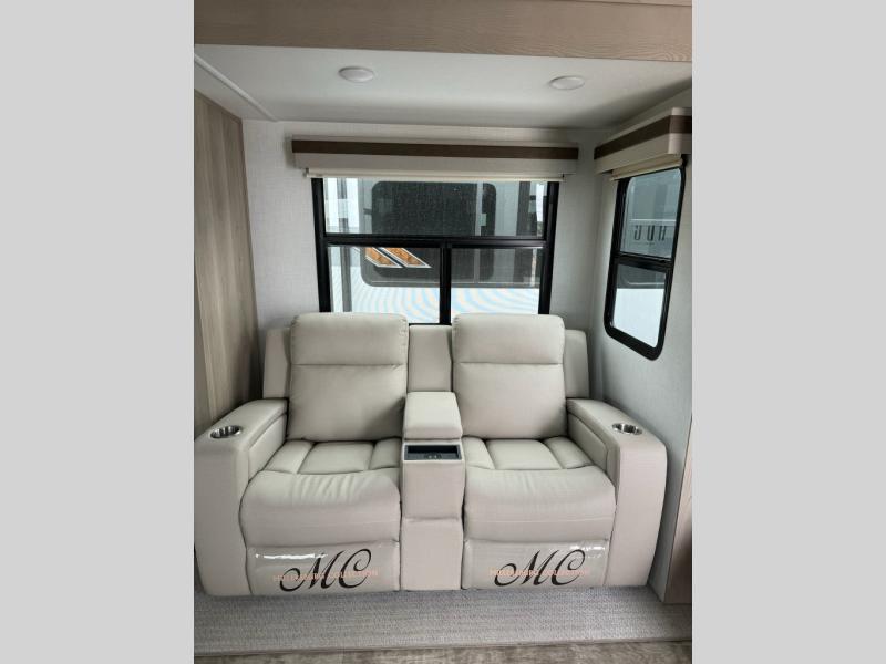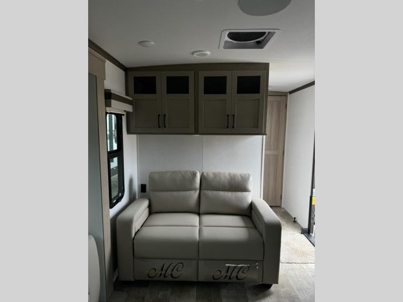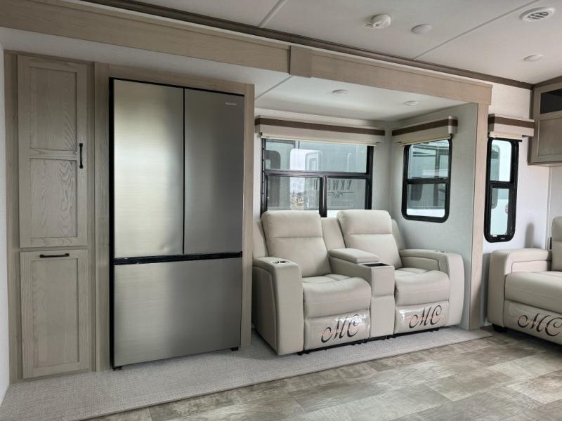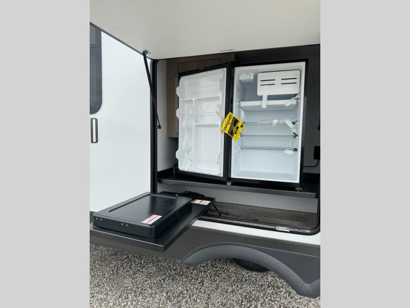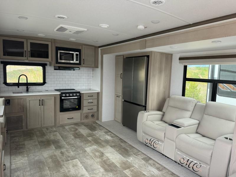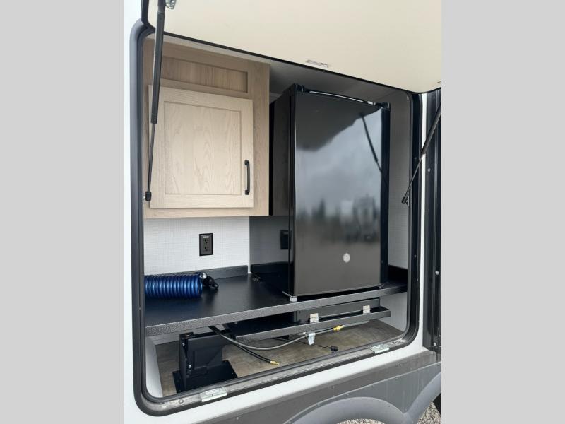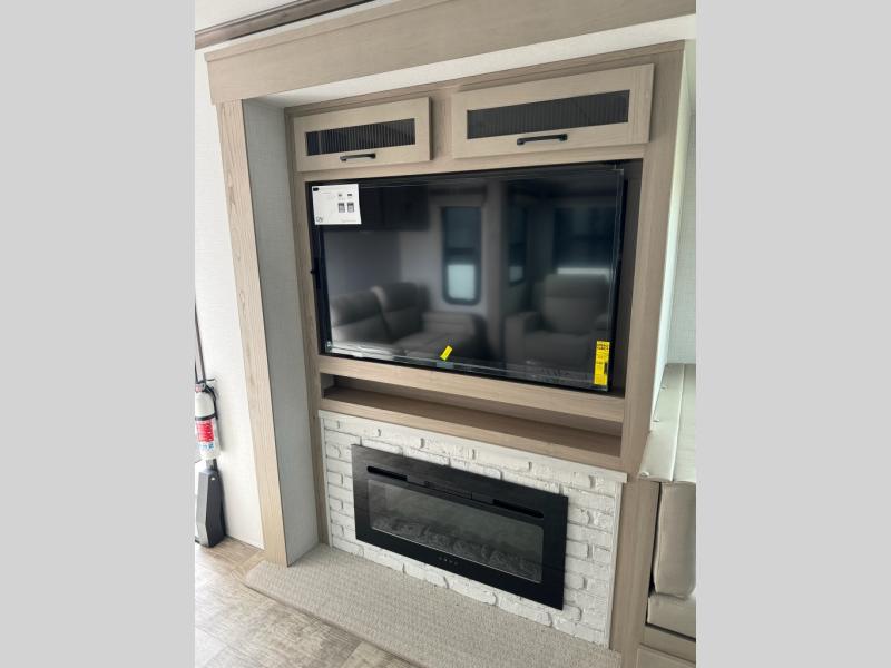 One step inside this rear kitchen travel trailer and you'll be sold! The dual opposing slides create an open floorplan you are sure to love, and you'll find plenty of seating spaces on the theater seat, the hide-a-bed sofa, and at the booth dinette. There is an entertainment center here with a Smart TV, plus a fireplace for those cooler nights. This model includes a convenient dual entry bath and a spacious front master bedroom that will have you feeling right at home. You can easily store your items in the large front wardrobe, plus there is a dresser and additional storage that features a space to add an optional washer and dryer. And check out the exterior with two power awnings, an outside kitchen, plus exterior storage for all your gear!