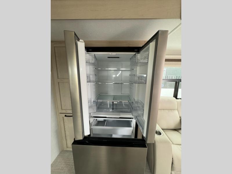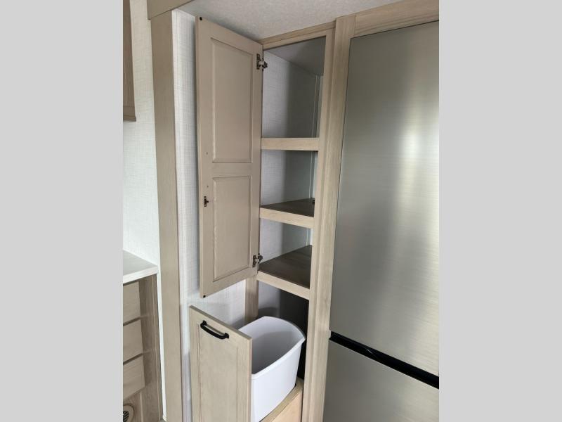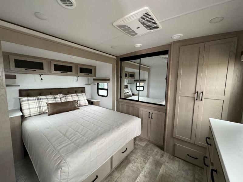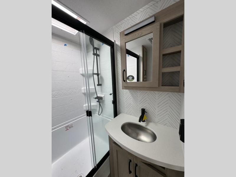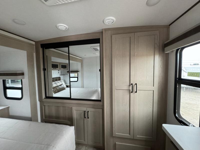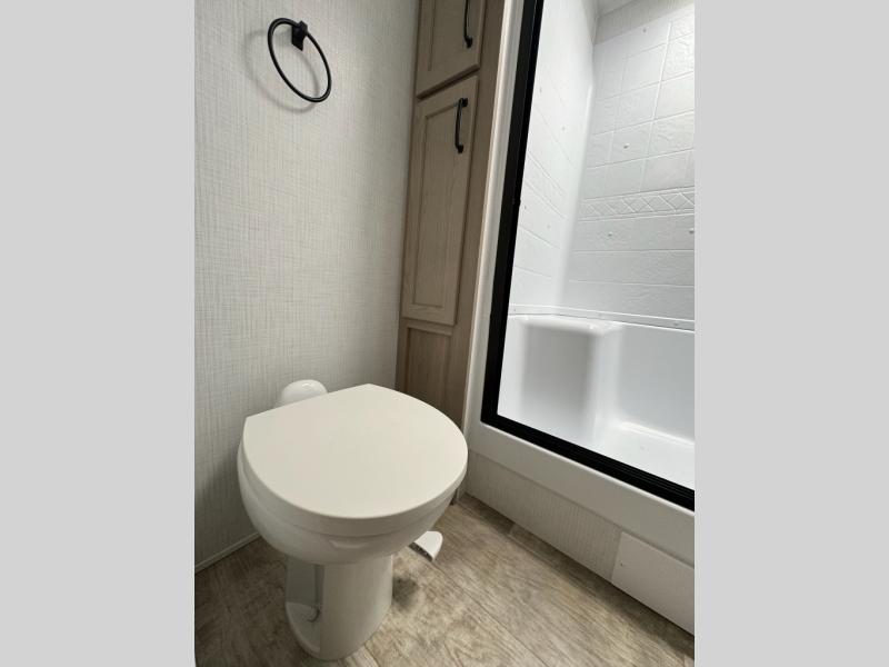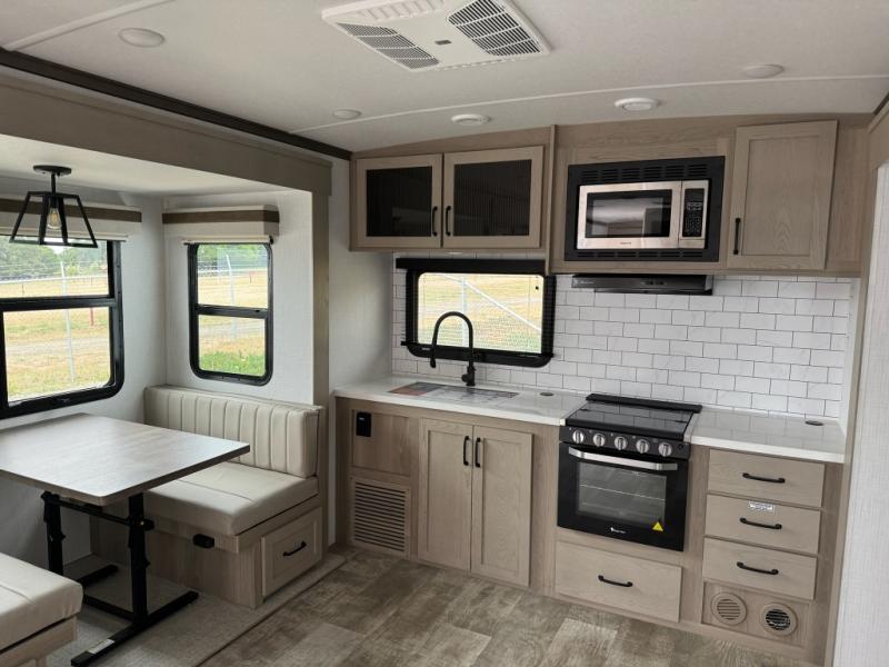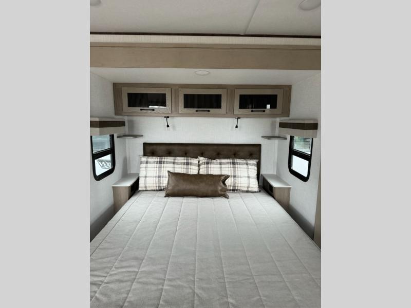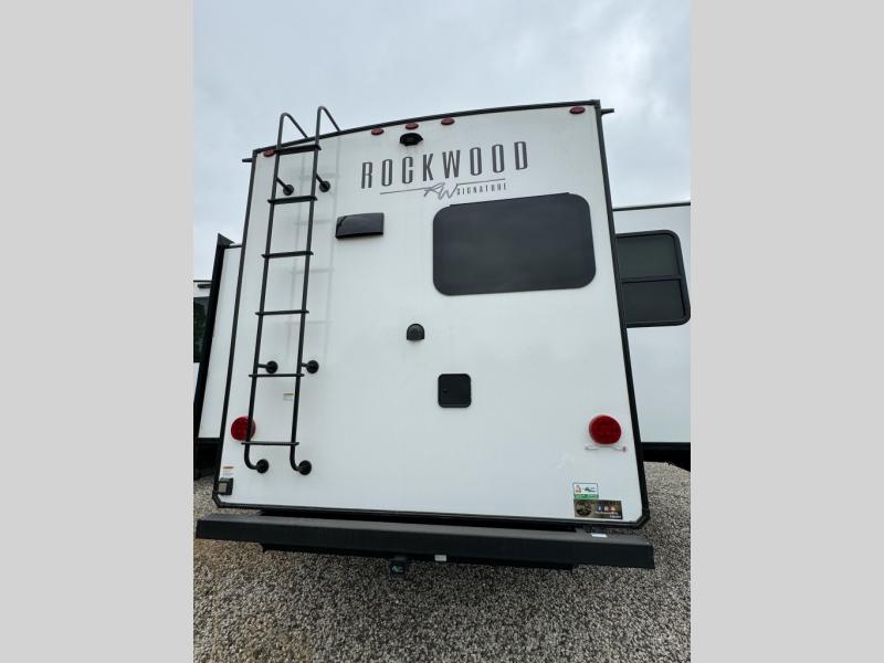 With any Rockwood Signature fifth wheel or travel trailer by Forest River RV, you will enjoy superior construction that includes laminated white fiberglass sidewalls, a radius roof with vaulted interior ceilings, plus radiant foil insulation and an enclosed underbelly for use in all types of weather. Some convenient exterior features include a power tongue jack, a torsion axle, Rubber-Ryde suspension, and a tire pressure monitor system with a monitor for added safety. The interior offers a One Touch OneControl panel with WeRV app control, for lights, awning, slides, water heater and more, and the Air 360+ omnidirectional antenna with WiFi prep lets you work while away from home if needed. You will also appreciate the interior vaulted ceilings, residential soft close doors and drawers, solid surface kitchen countertops, and designer kitchen backsplash!