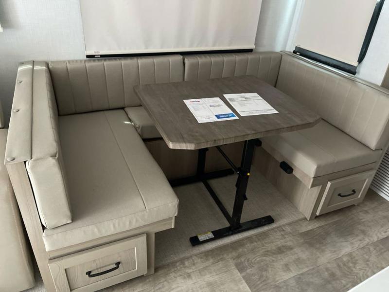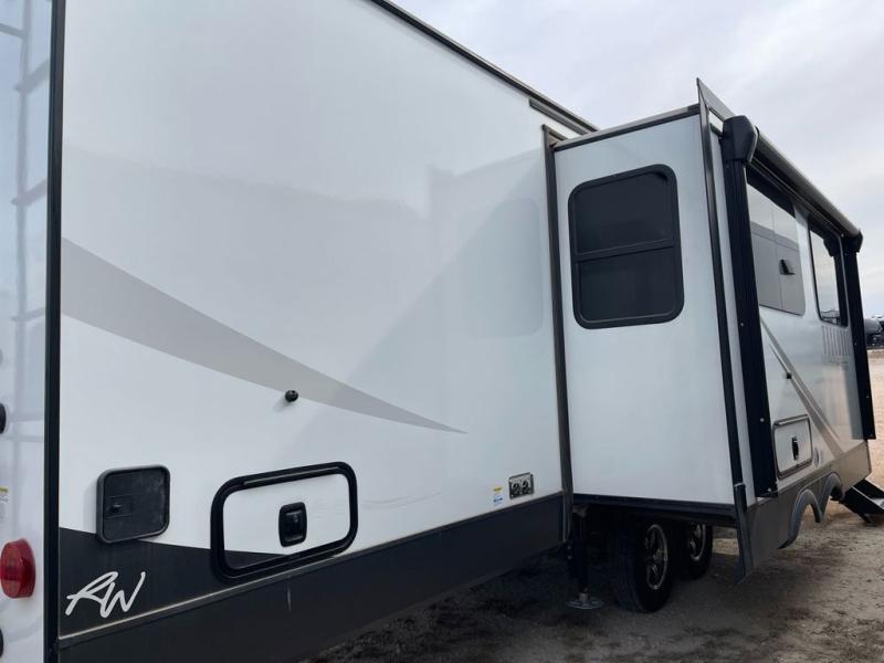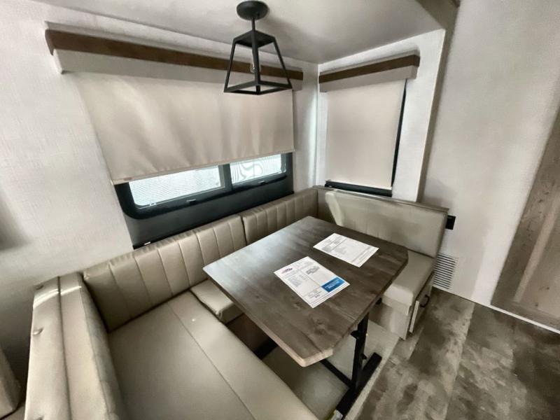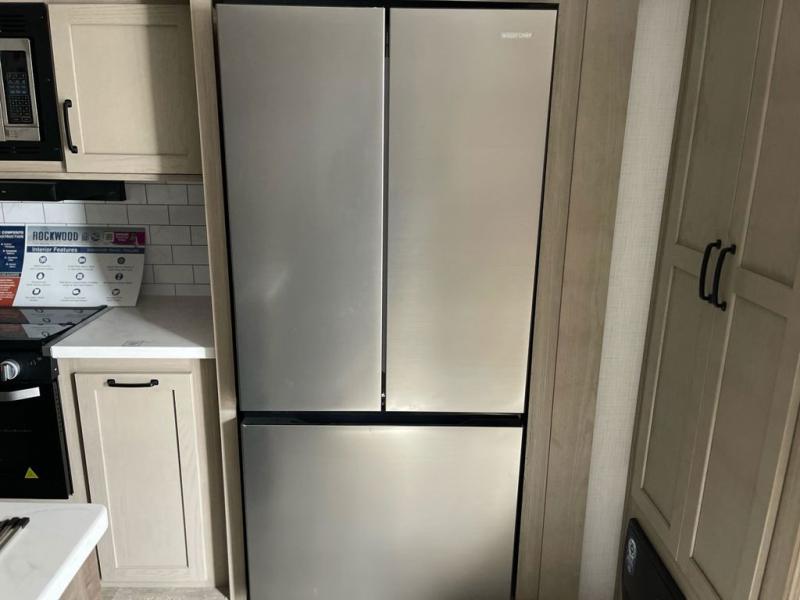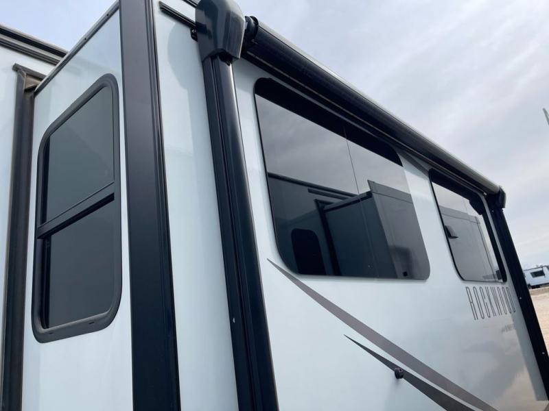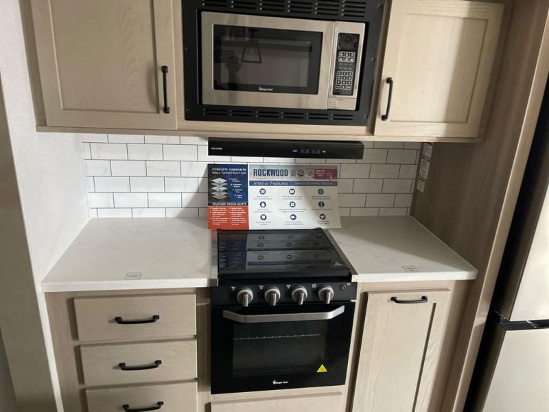 With any Rockwood Signature fifth wheel or travel trailer by Forest River RV, you will enjoy superior construction that includes laminated white fiberglass sidewalls, a radius roof with vaulted interior ceilings, plus radiant foil insulation and an enclosed underbelly for use in all types of weather. Some convenient exterior features include a power tongue jack, a torsion axle, Rubber-Ryde suspension, and a tire pressure monitor system with a monitor for added safety. The interior offers a One Touch OneControl panel with WeRV app control, for lights, awning, slides, water heater and more, and the Air 360+ omnidirectional antenna with WiFi prep lets you work while away from home if needed. You will also appreciate the interior vaulted ceilings, residential soft close doors and drawers, solid surface kitchen countertops, and designer kitchen backsplash!