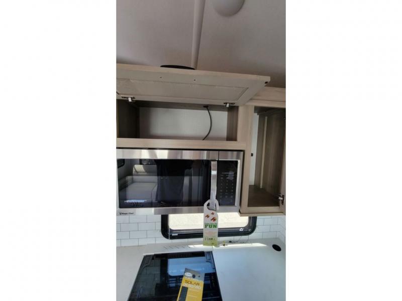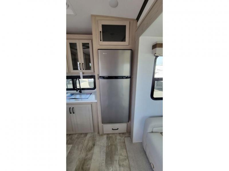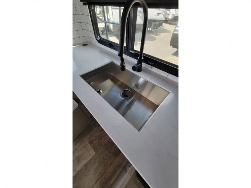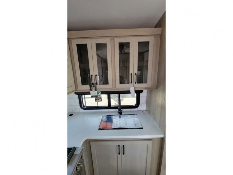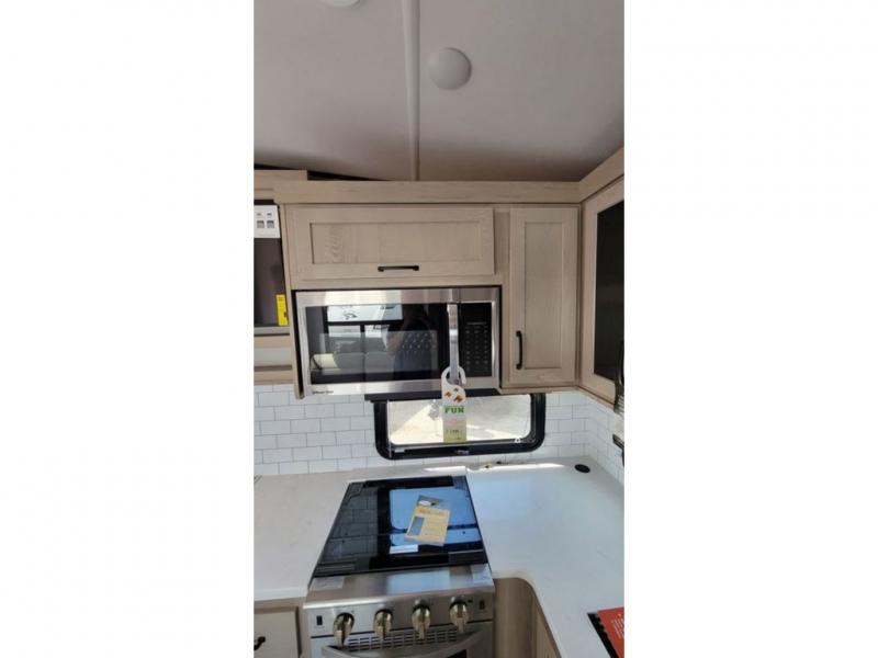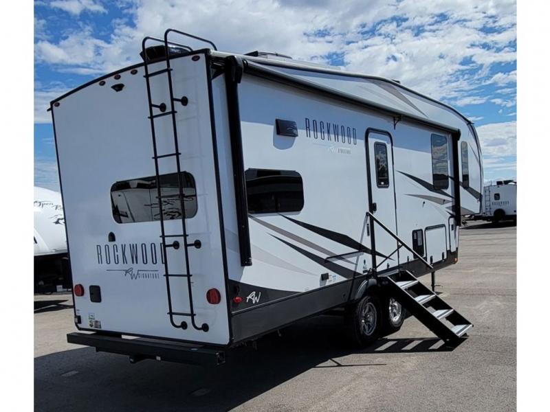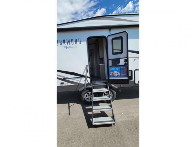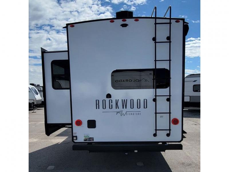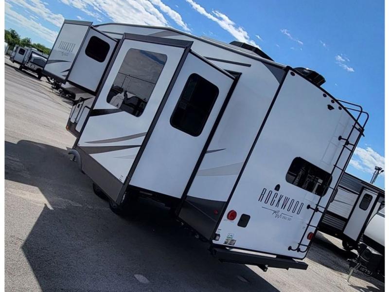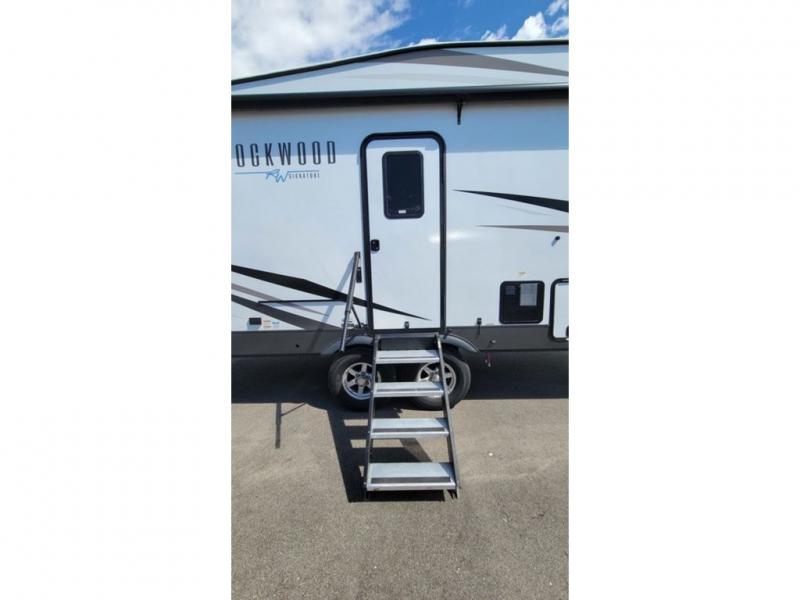 With any Rockwood Signature fifth wheel or travel trailer by Forest River RV, you will enjoy superior construction that includes laminated white fiberglass sidewalls, a radius roof with vaulted interior ceilings, plus radiant foil insulation and an enclosed underbelly for use in all types of weather. Some convenient exterior features include a power tongue jack, a torsion axle, Rubber-Ryde suspension, and a tire pressure monitor system with a monitor for added safety. The interior offers a One Touch OneControl panel with WeRV app control, for lights, awning, slides, water heater and more, and the Air 360+ omnidirectional antenna with WiFi prep lets you work while away from home if needed. You will also appreciate the interior vaulted ceilings, residential soft close doors and drawers, solid surface kitchen countertops, and designer kitchen backsplash!
