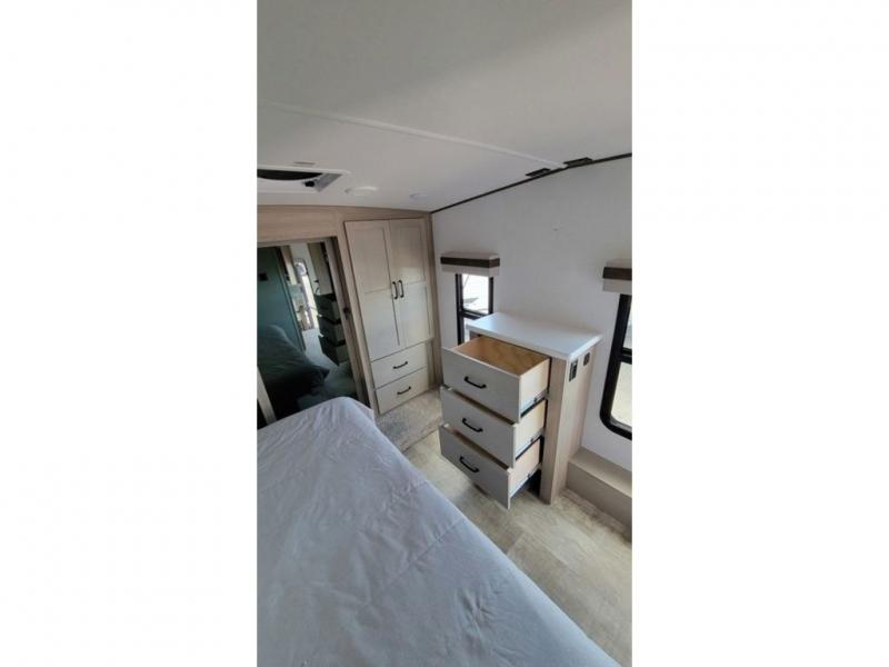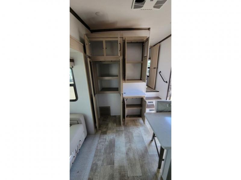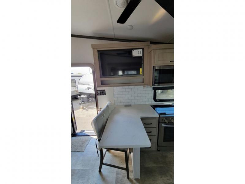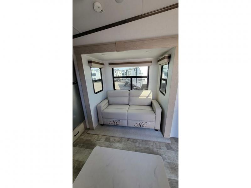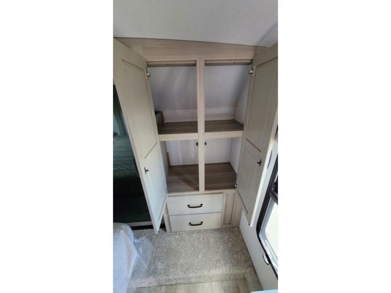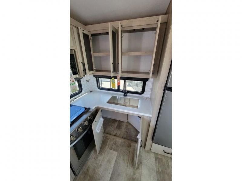 Looking for a spacious bedroom and bathroom for the perfect couple's RV with extra sleeping space for guests? This model provides a queen bed slide out for more interior floor space to get to the front wardrobe with shelves, and the dresser with a window above for great views of your campsite. The bathroom offers a shower with a seat, linen storage, and counter space for your toiletries. The main living and kitchen combined area has a hide-a-bed sofa slide that allows two guests to stay the night or you can choose the optional theater seat. There is also a breakfast bar with stools to dine at, and a U-shaped counter including appliances to make meals and store leftovers. And you will find exterior storage to bring along camping chairs and extra gear.