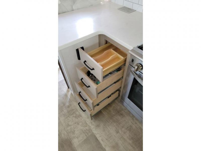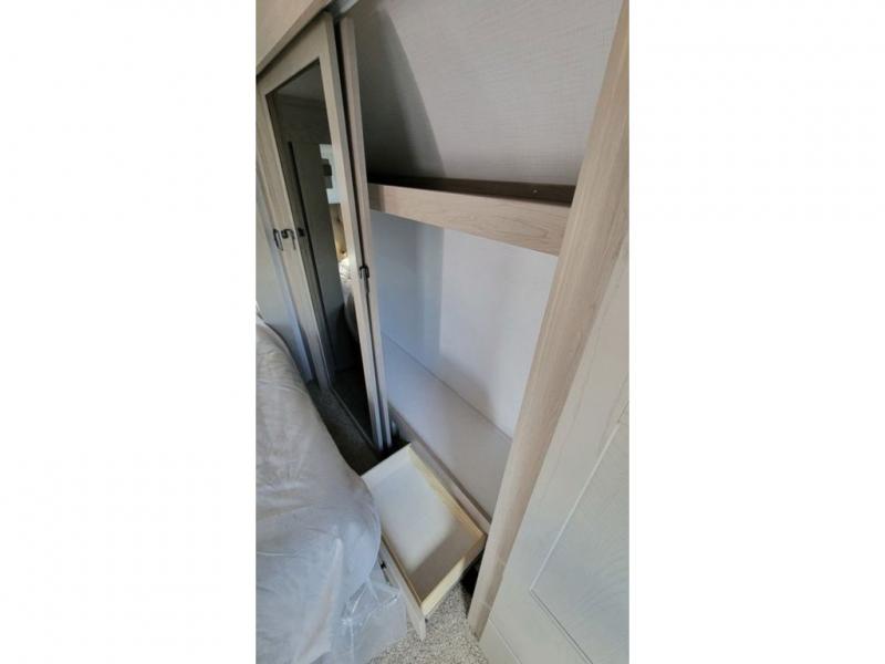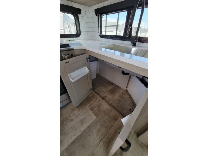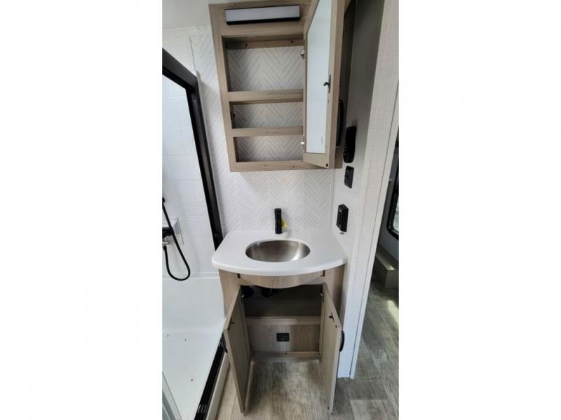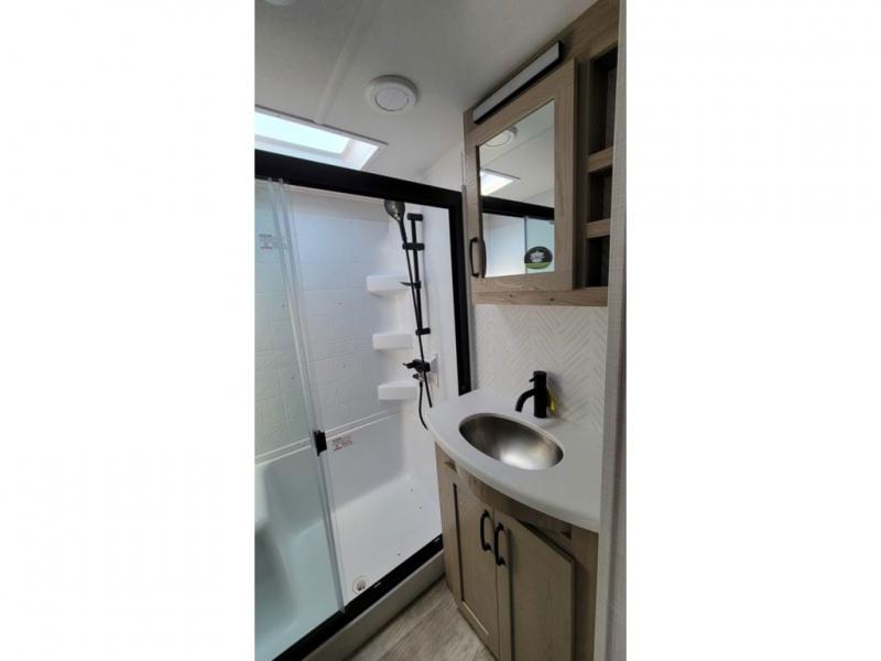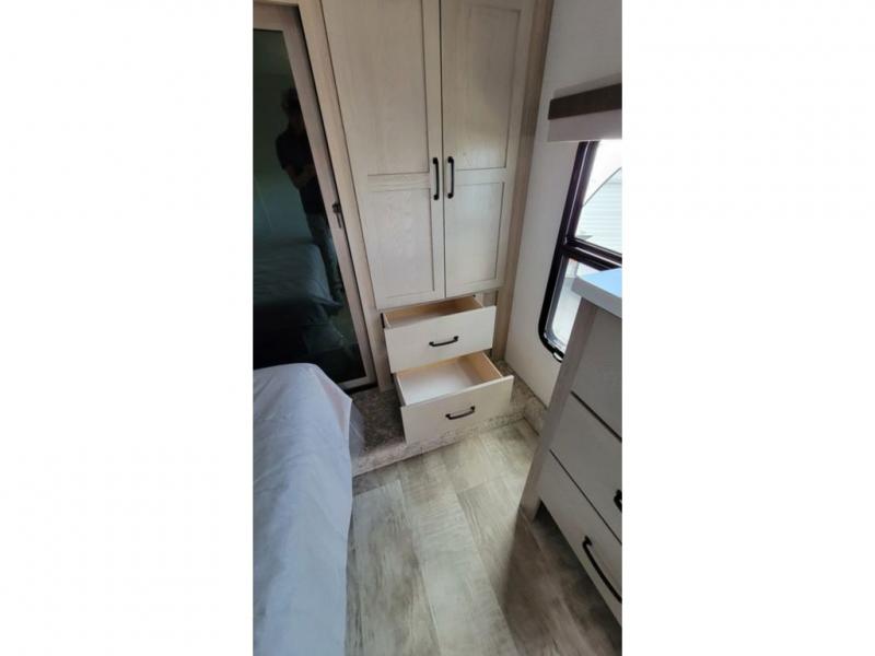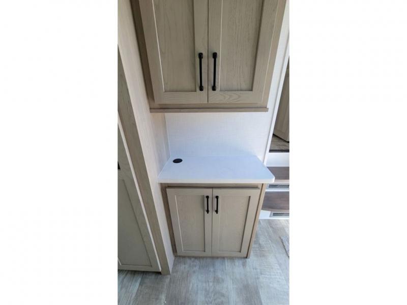 Looking for a spacious bedroom and bathroom for the perfect couple's RV with extra sleeping space for guests? This model provides a queen bed slide out for more interior floor space to get to the front wardrobe with shelves, and the dresser with a window above for great views of your campsite. The bathroom offers a shower with a seat, linen storage, and counter space for your toiletries. The main living and kitchen combined area has a hide-a-bed sofa slide that allows two guests to stay the night or you can choose the optional theater seat. There is also a breakfast bar with stools to dine at, and a U-shaped counter including appliances to make meals and store leftovers. And you will find exterior storage to bring along camping chairs and extra gear.