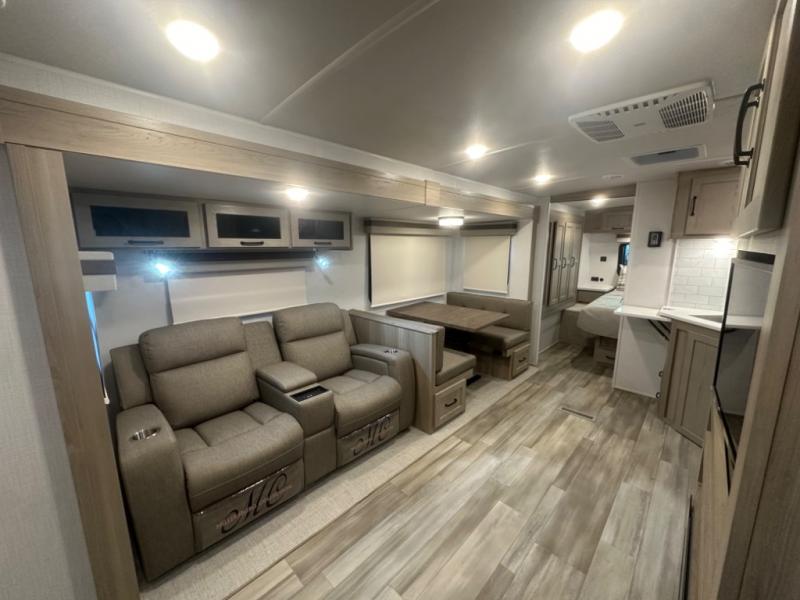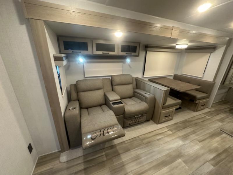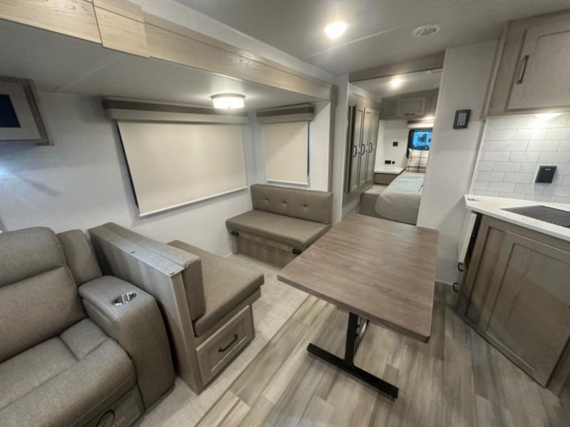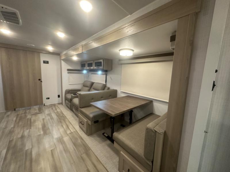 This trailer is the perfect couple's retreat with its private bedroom up front which includes a queen bed, a slide out wardrobe and a TV option. The spacious rear full bathroom provides a shower and linen storage, and a space savings sliding door. The cook will have full amenities with ample counter space, a walk-in pantry for food storage, and a three burner range to cook meals on. If the weather is nice outside, you can make dinner on the exterior griddle, and there is a 21' power awning with LED lights to relax under. Or you can stay inside to enjoy the fireplace and Smart TV! You will also appreciate the pass thru storage with a steel sliding tray to easily access gear!