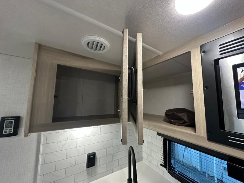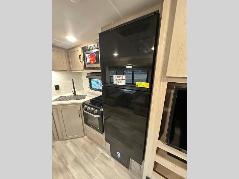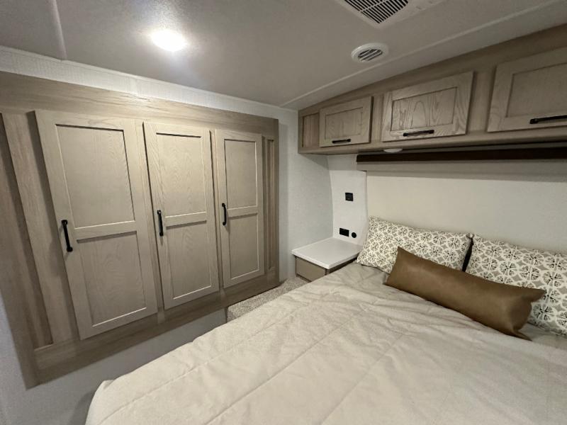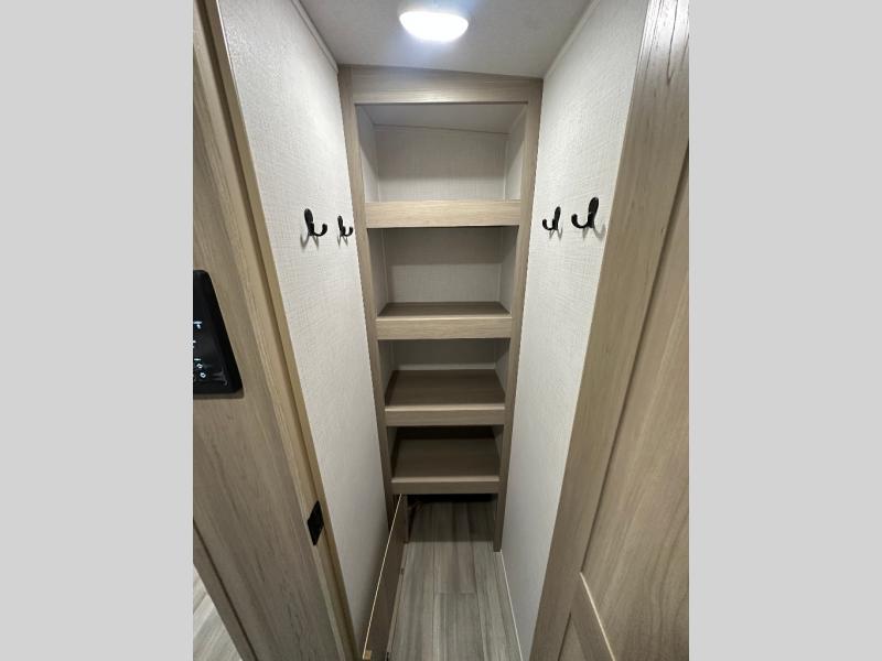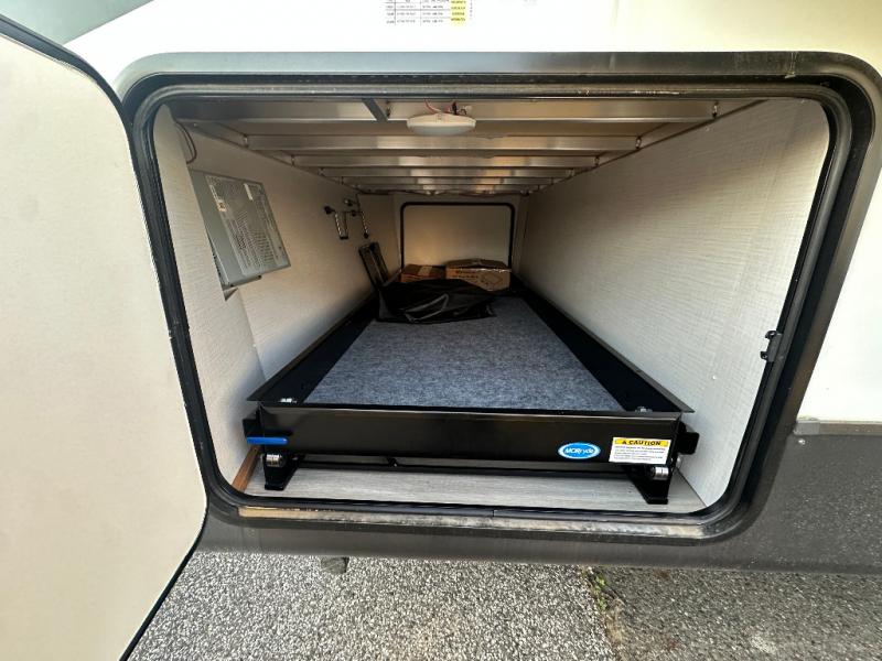 This trailer is the perfect couple's retreat with its private bedroom up front which includes a queen bed, a slide out wardrobe and a TV option. The spacious rear full bathroom provides a shower and linen storage, and a space savings sliding door. The cook will have full amenities with ample counter space, a walk-in pantry for food storage, and a three burner range to cook meals on. If the weather is nice outside, you can make dinner on the exterior griddle, and there is a 21' power awning with LED lights to relax under. Or you can stay inside to enjoy the fireplace and Smart TV! You will also appreciate the pass thru storage with a steel sliding tray to easily access gear!