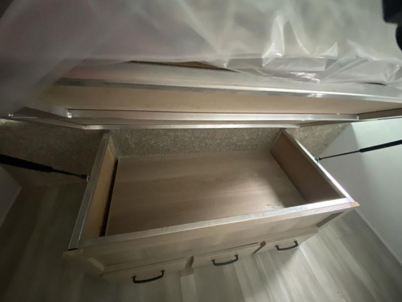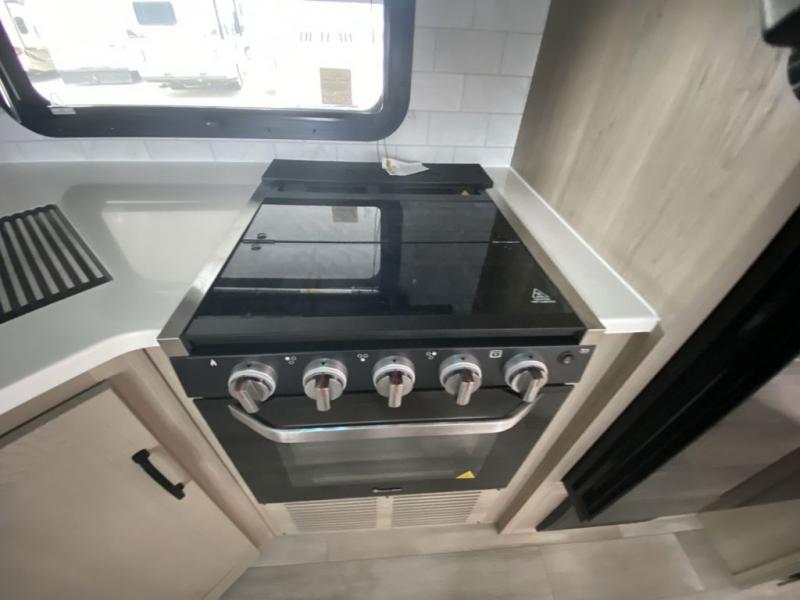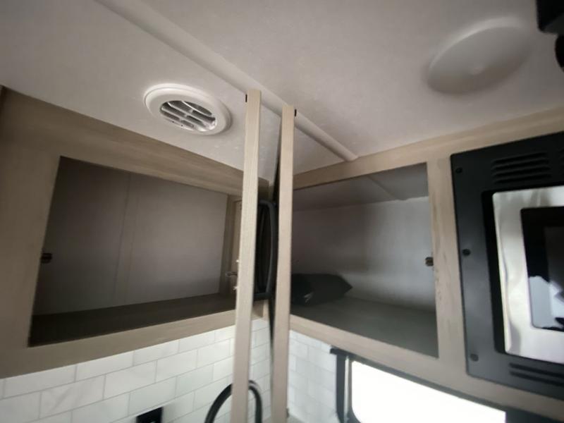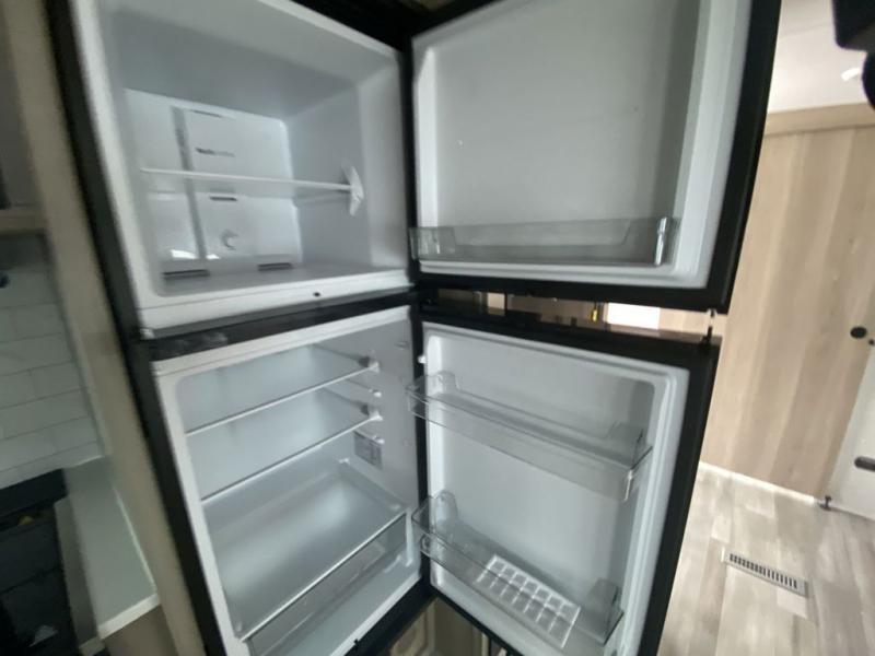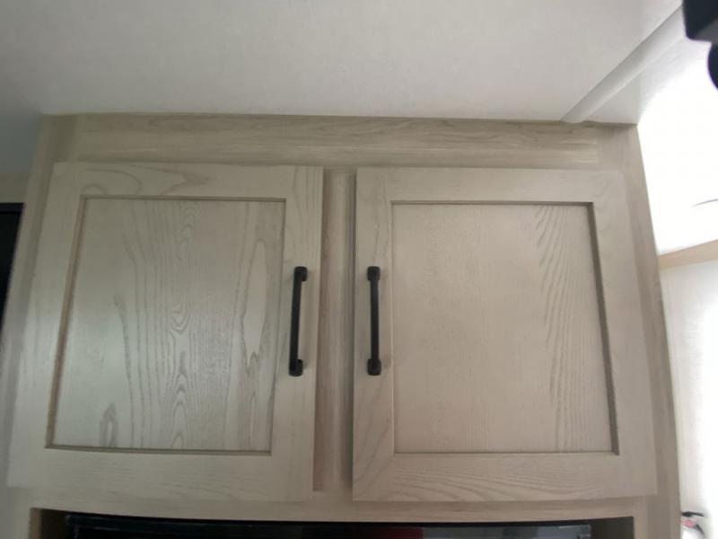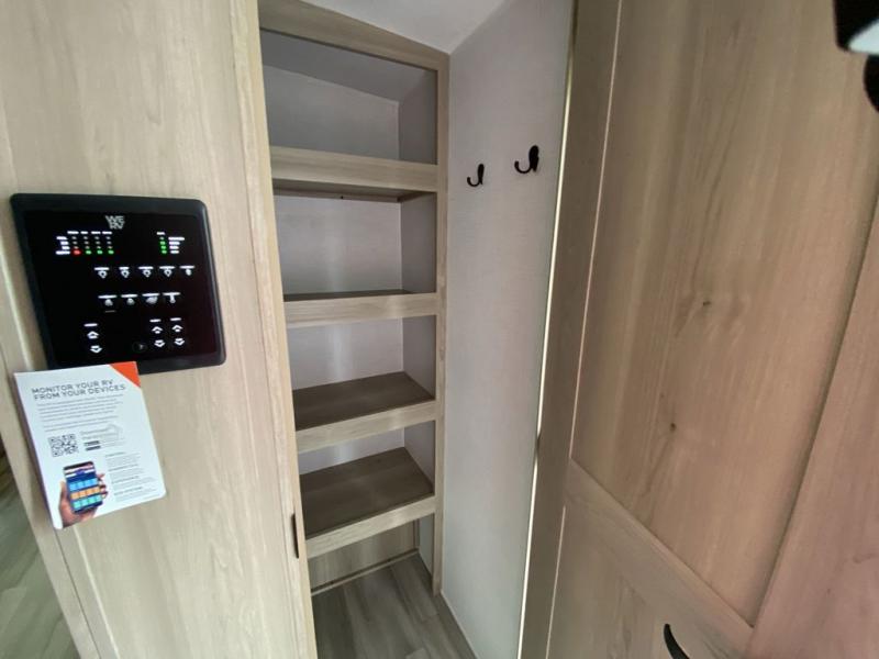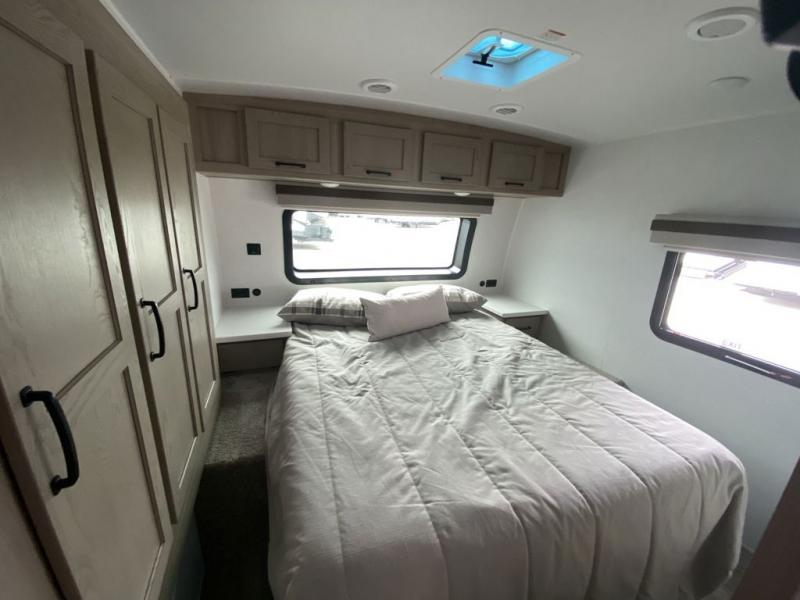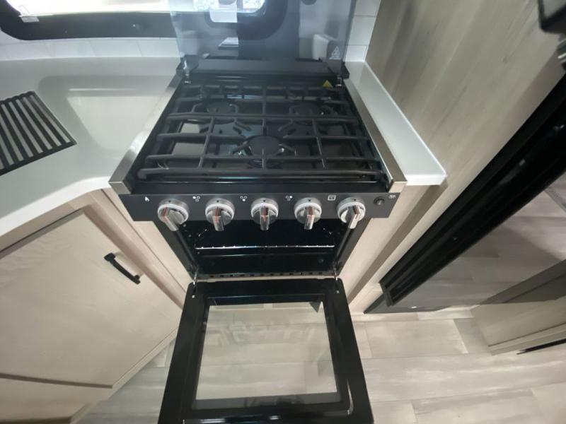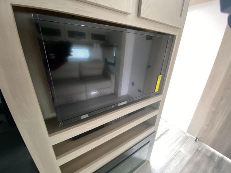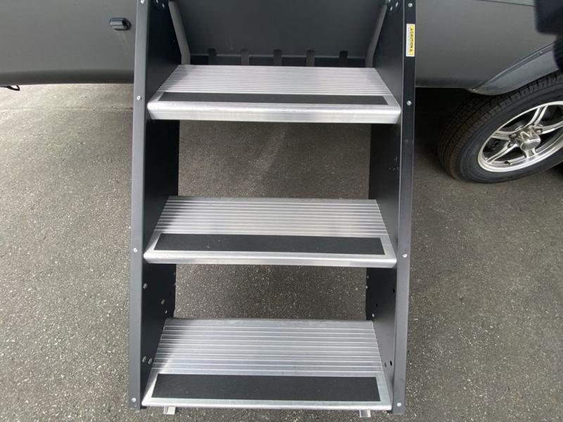This trailer is the perfect couple's retreat with its private bedroom up front which includes a queen bed, a slide out wardrobe and a TV option. The spacious rear full bathroom provides a shower and linen storage, and a space savings sliding door. The cook will have full amenities with ample counter space, a walk-in pantry for food storage, and a three burner range to cook meals on. If the weather is nice outside, you can make dinner on the exterior griddle, and there is a 21' power awning with LED lights to relax under. Or you can stay inside to enjoy the fireplace and Smart TV! You will also appreciate the pass thru storage with a steel sliding tray to easily access gear!