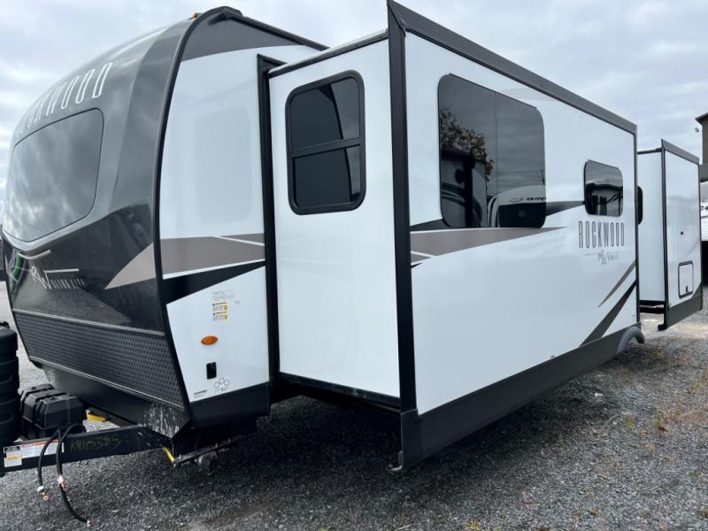 Each Rockwood Ultra Lite travel trailer by Forest River includes superior construction with a high gloss front cap, laminated white fiberglass sidewalls, and tinted frameless windows for a sleek look. You will love how easy it will be to charge a few electronics with the 200W roof solar panel with an 1800W inverter, and the AIR 360+ omnidirectional antenna with WiFi prep will let you stay connected to the outside world as you camp. The torsion axle, Rubber-Ryde suspension will make towing smooth and hassle-free, along with the nitrogen filled, Goodyear Endurance tires and the tire pressure monitor system. Interior comforts include designer kitchen backsplash, solid wood cabinet doors with hidden hinges, and night roller shades to name a few. Choose a Rockwood Ultra Lite travel trailer today!